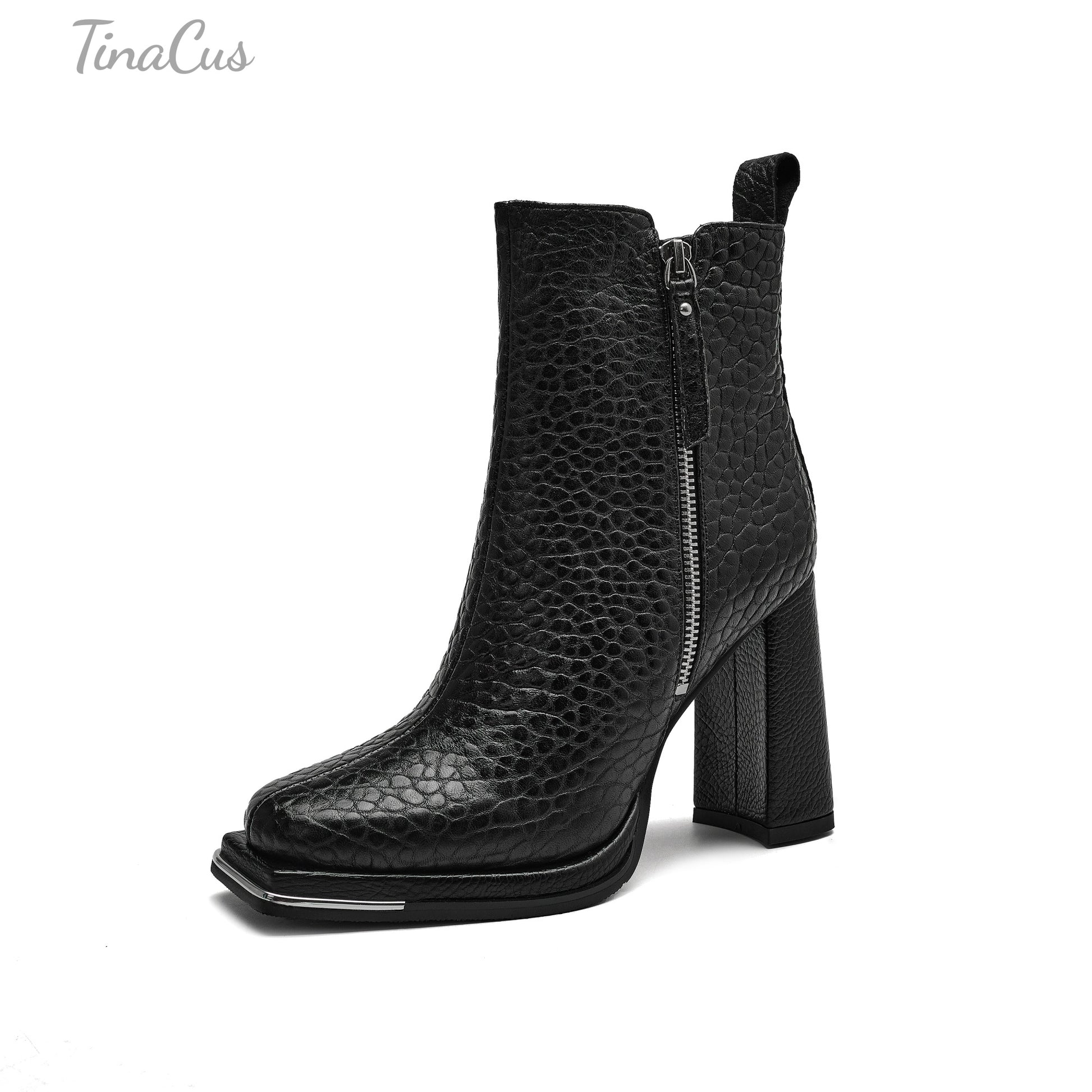 TinaCus High Chunky Heels Zip up Ankle Boots Embossed Genuine Leather Handmade Square Toe Women's Booties