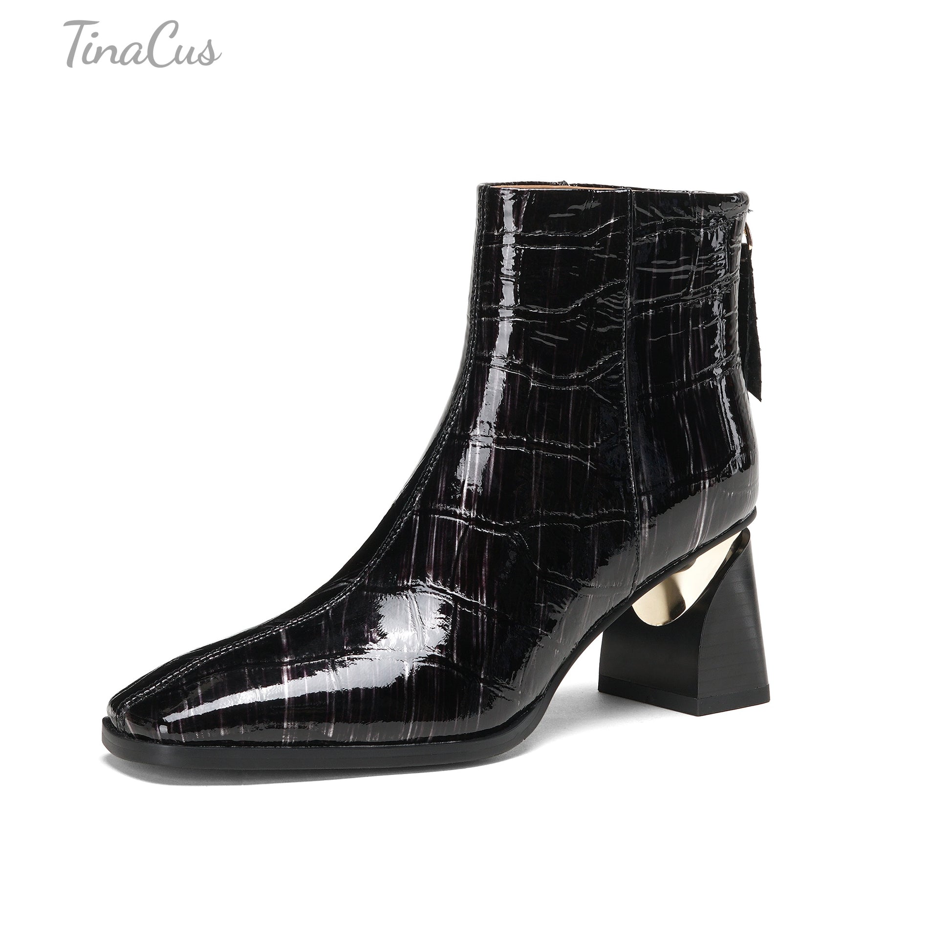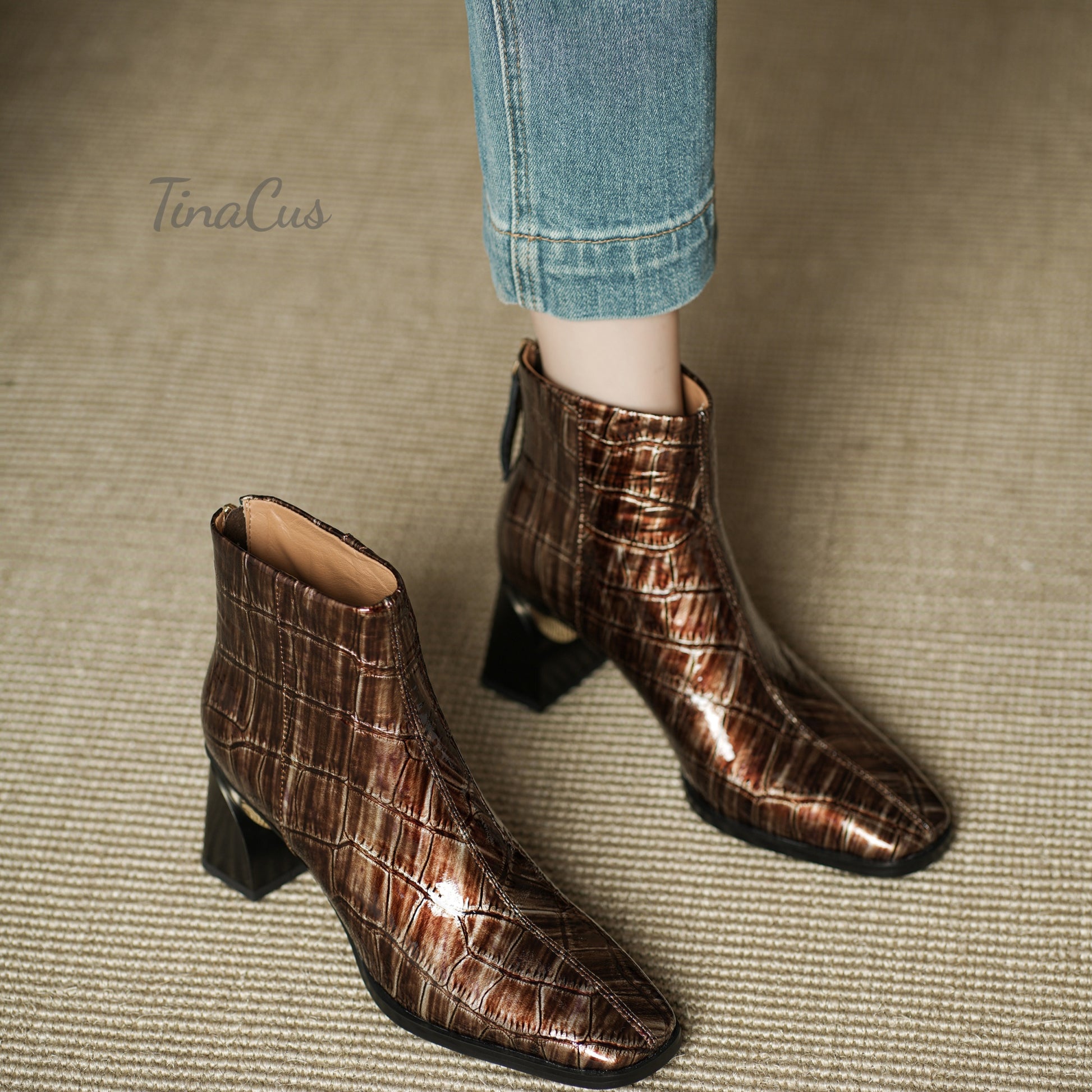 Ankle boots designed with square toe, back zippers, genuine leather and mid heels can go with kinds of outfits