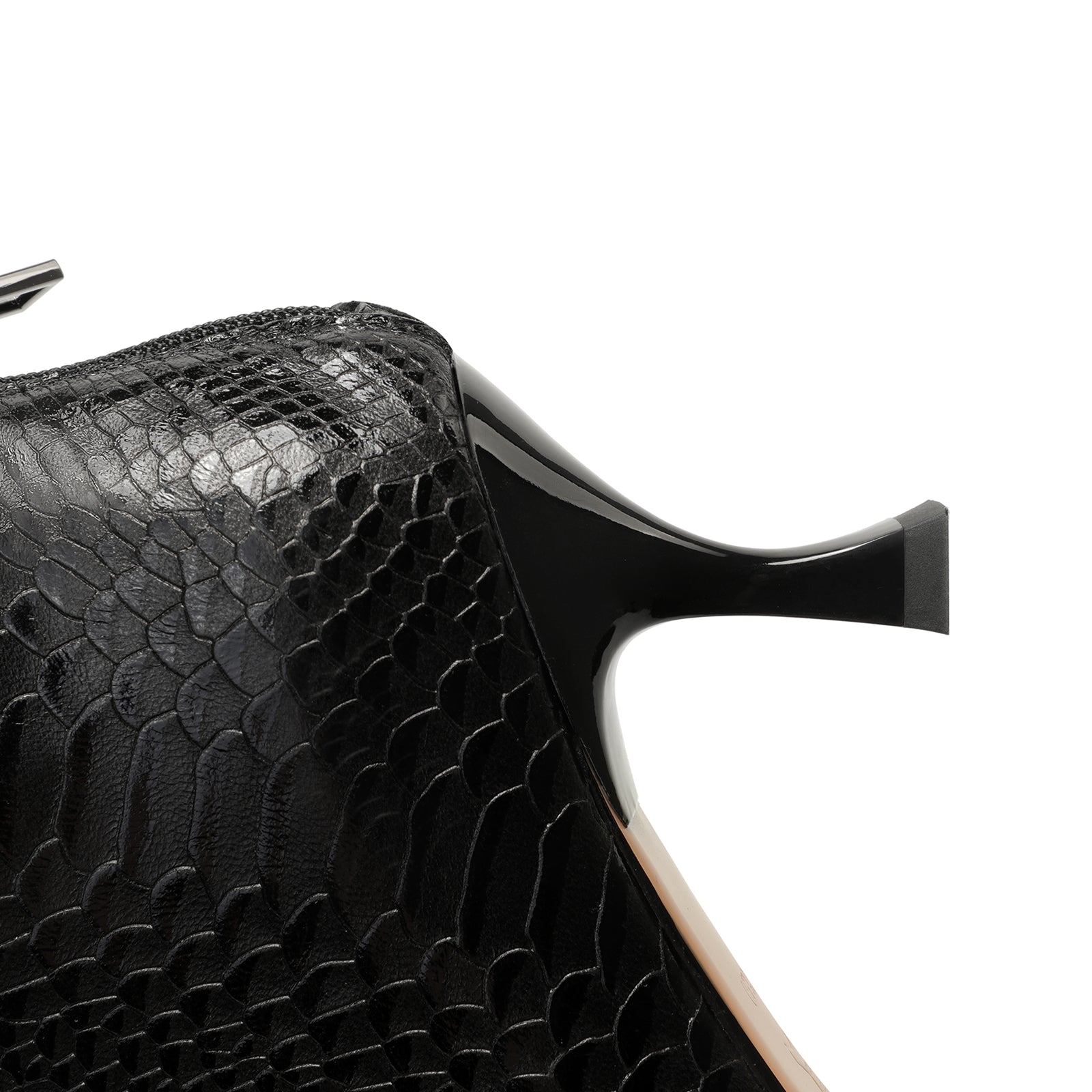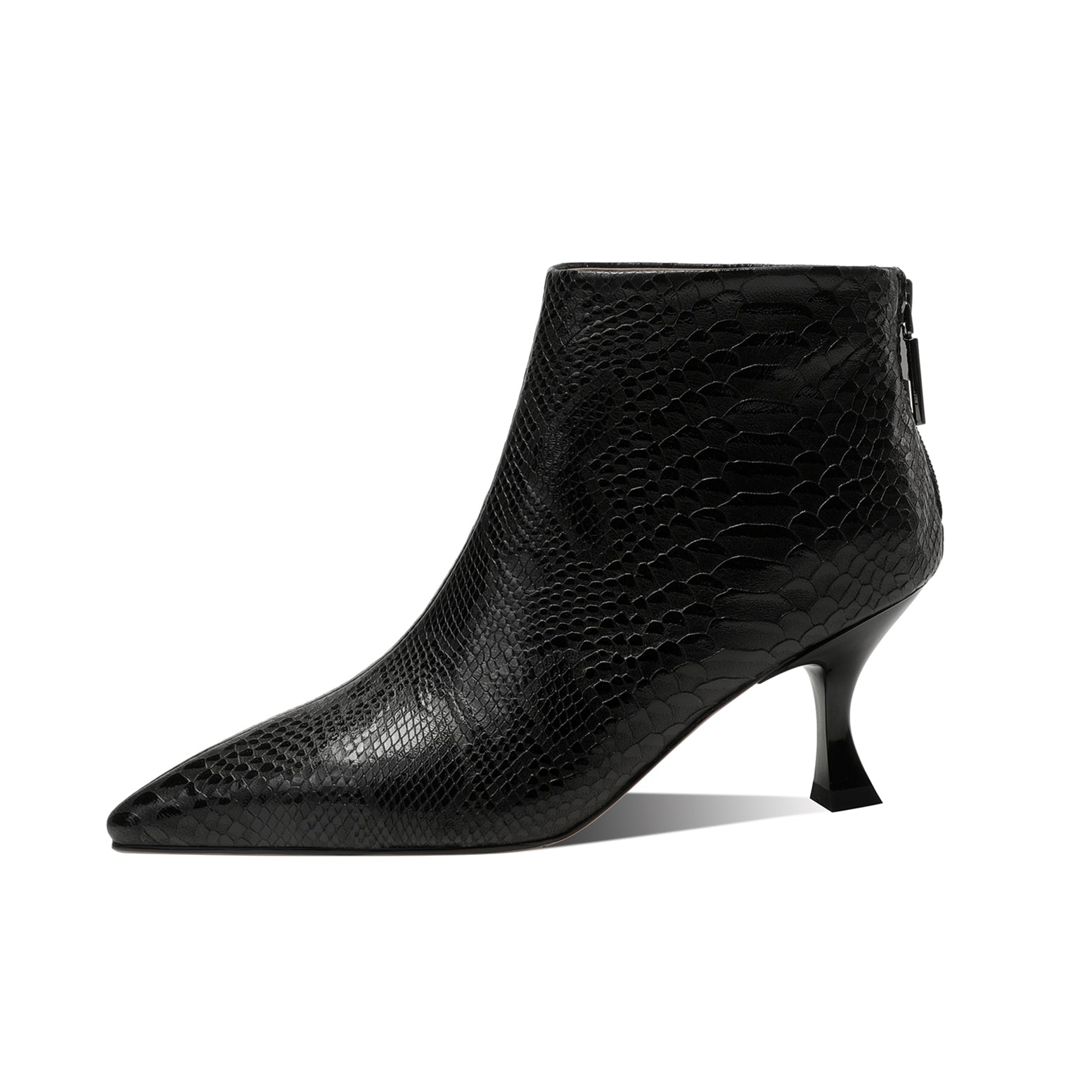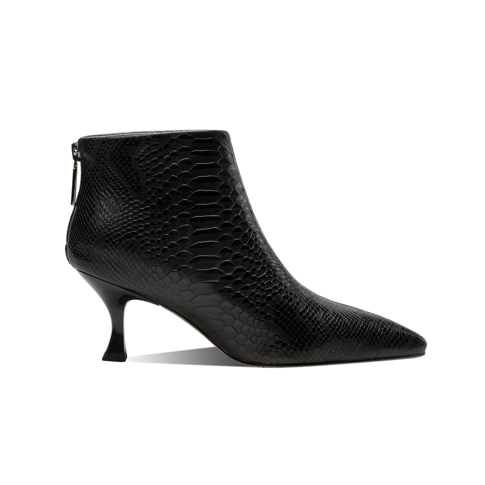 Ankle boots are designed with pointed toe, genuine leather, zip and kitten heel.