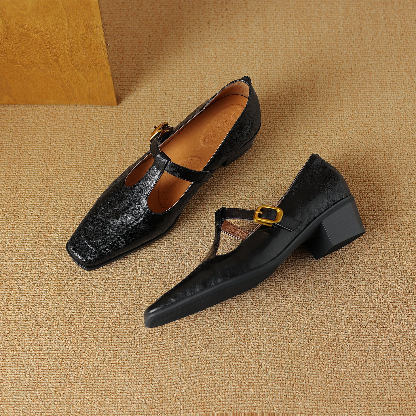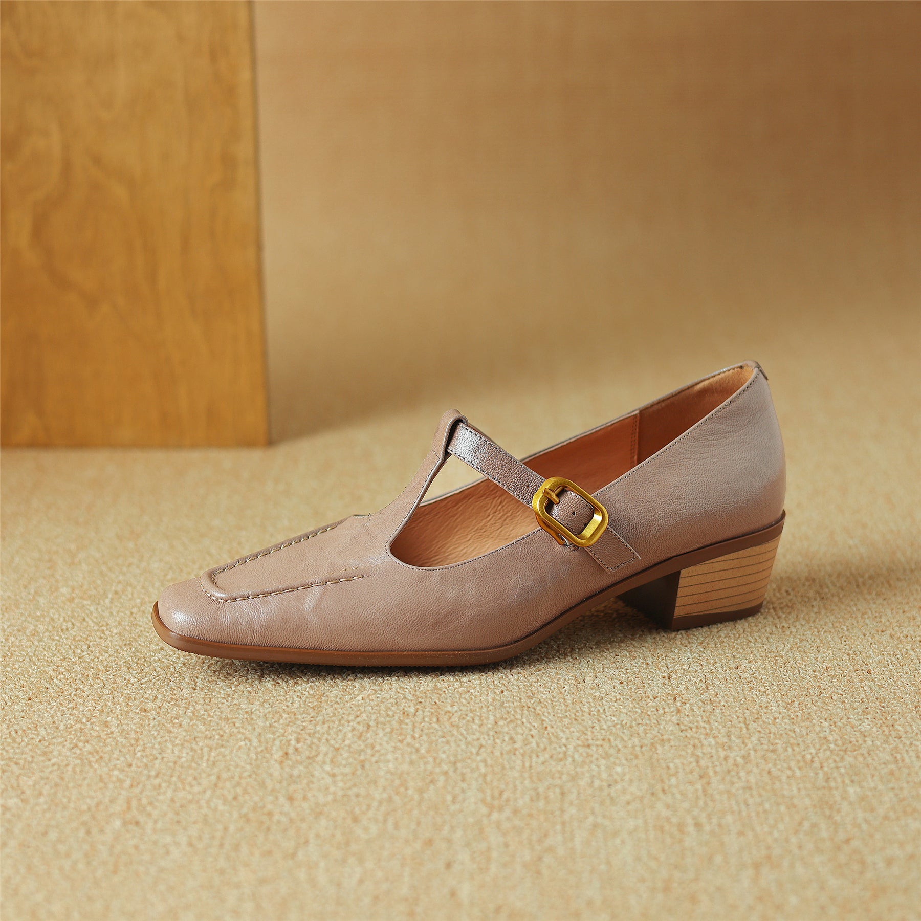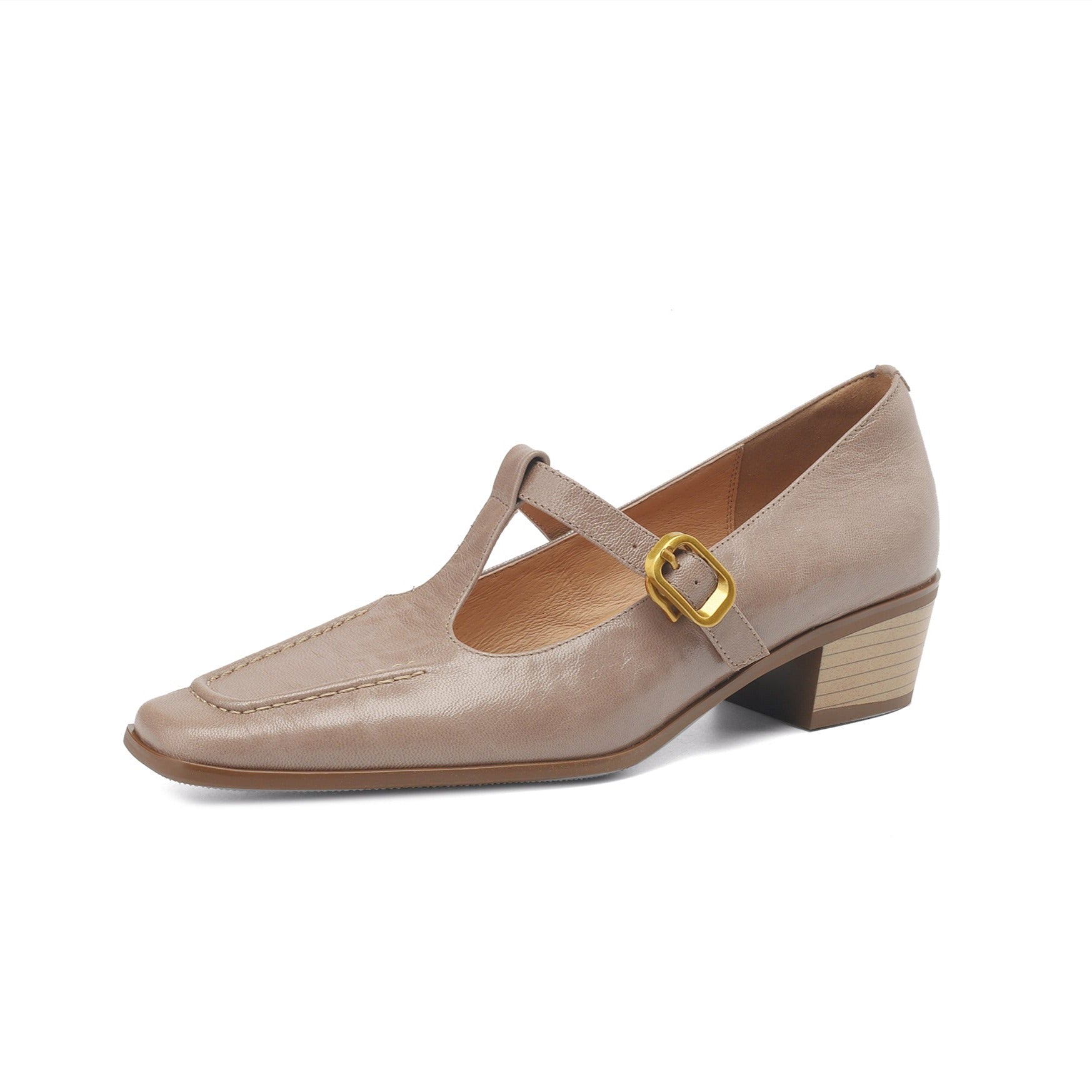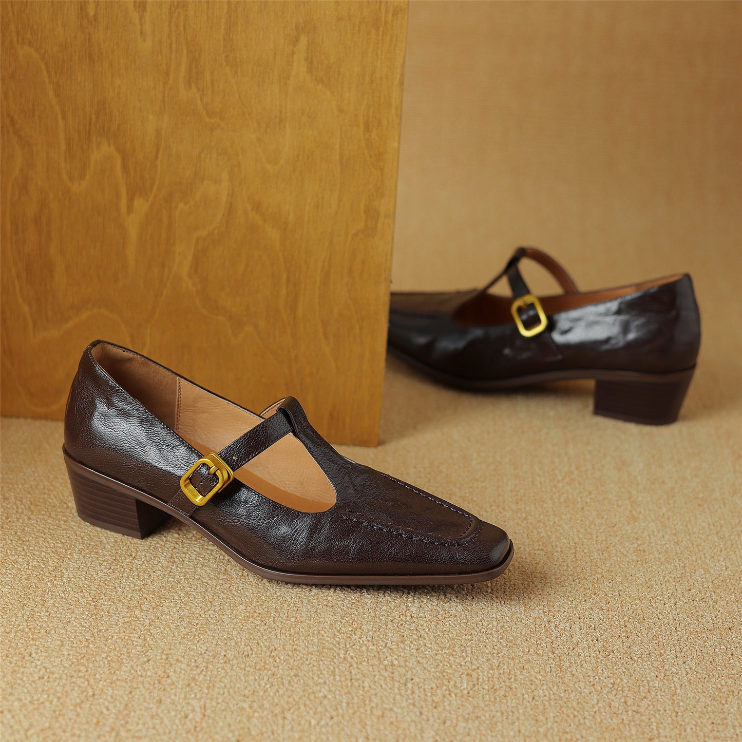 TinaCus Women's Genuine Leather Handmade Chunky Heel T-Strap Buckle Pumps