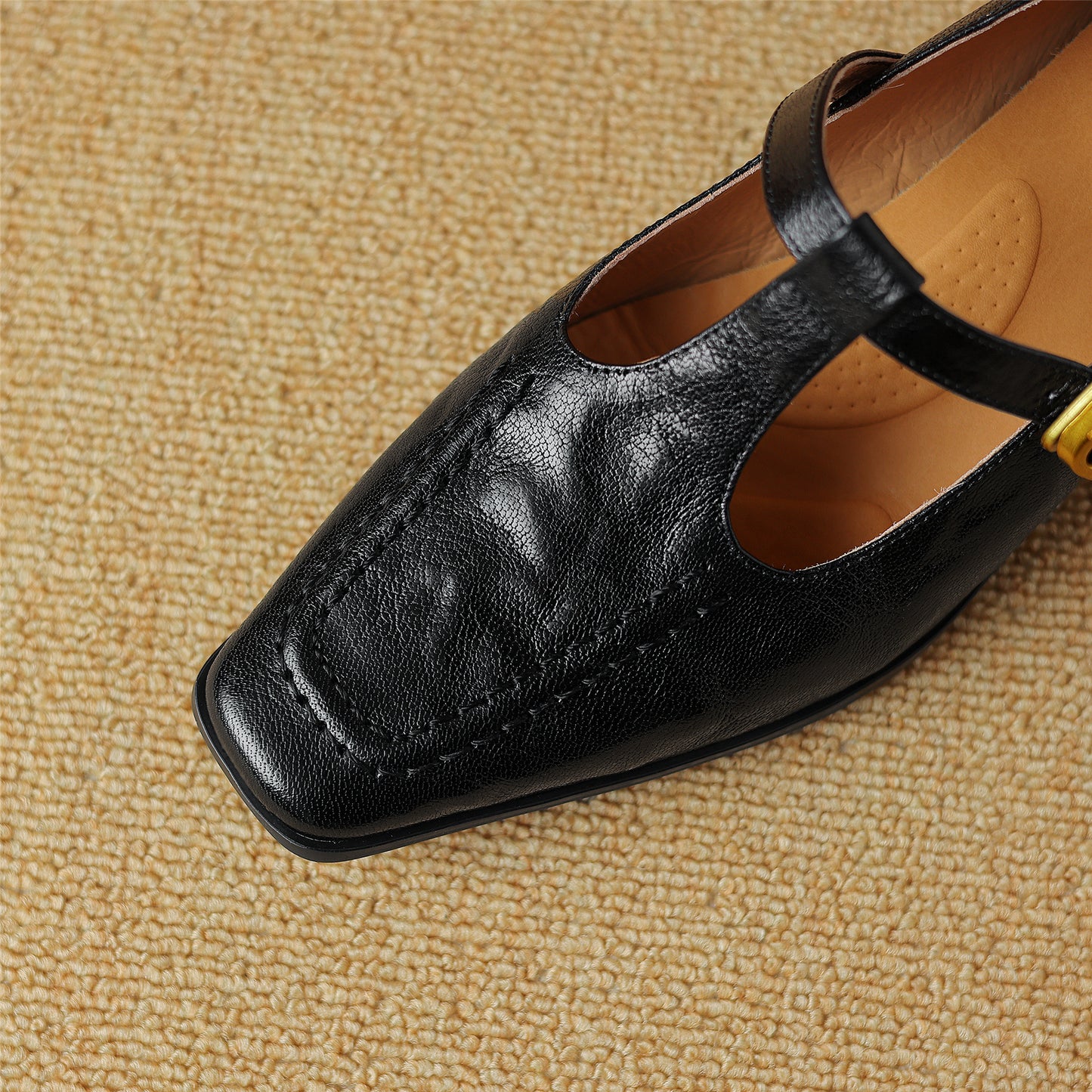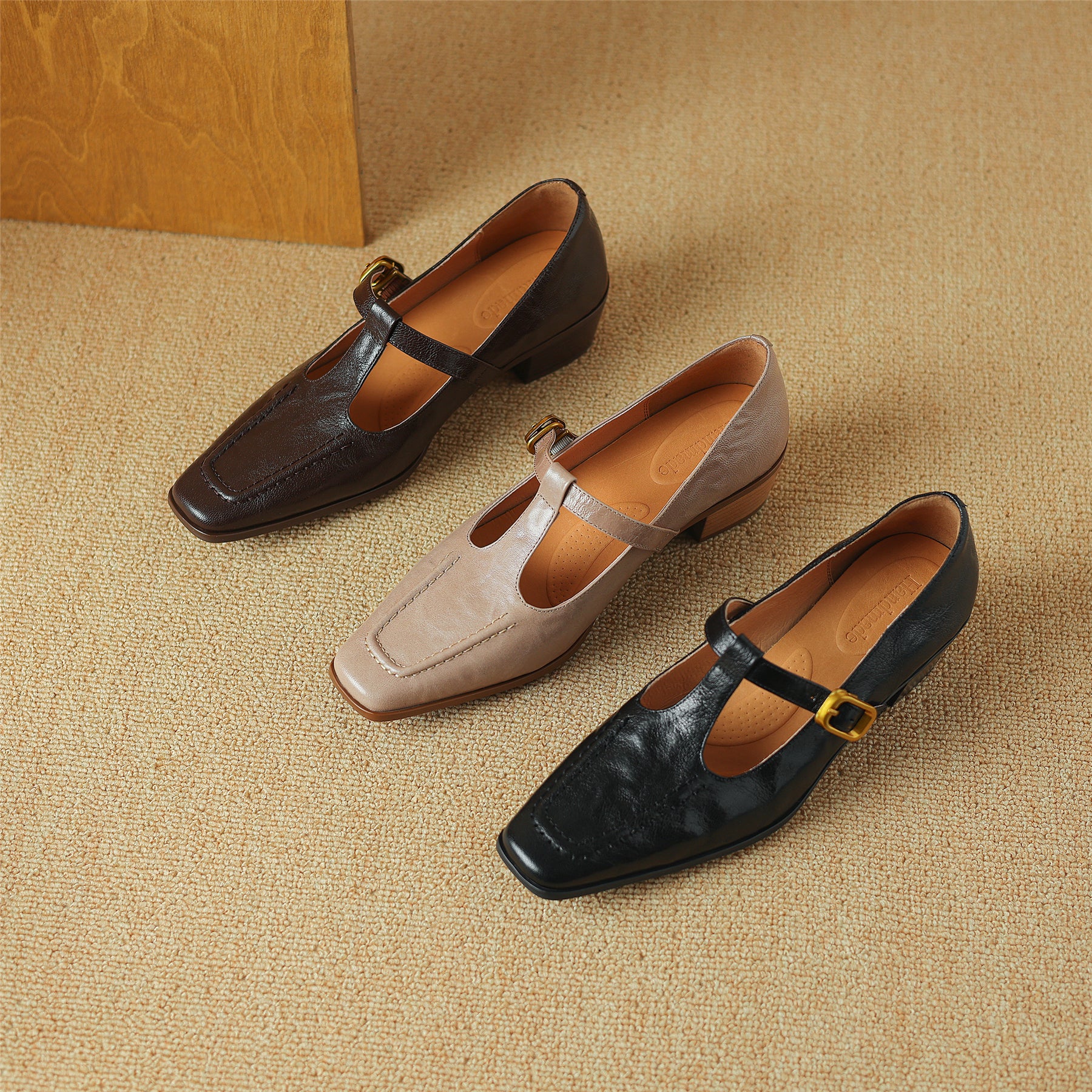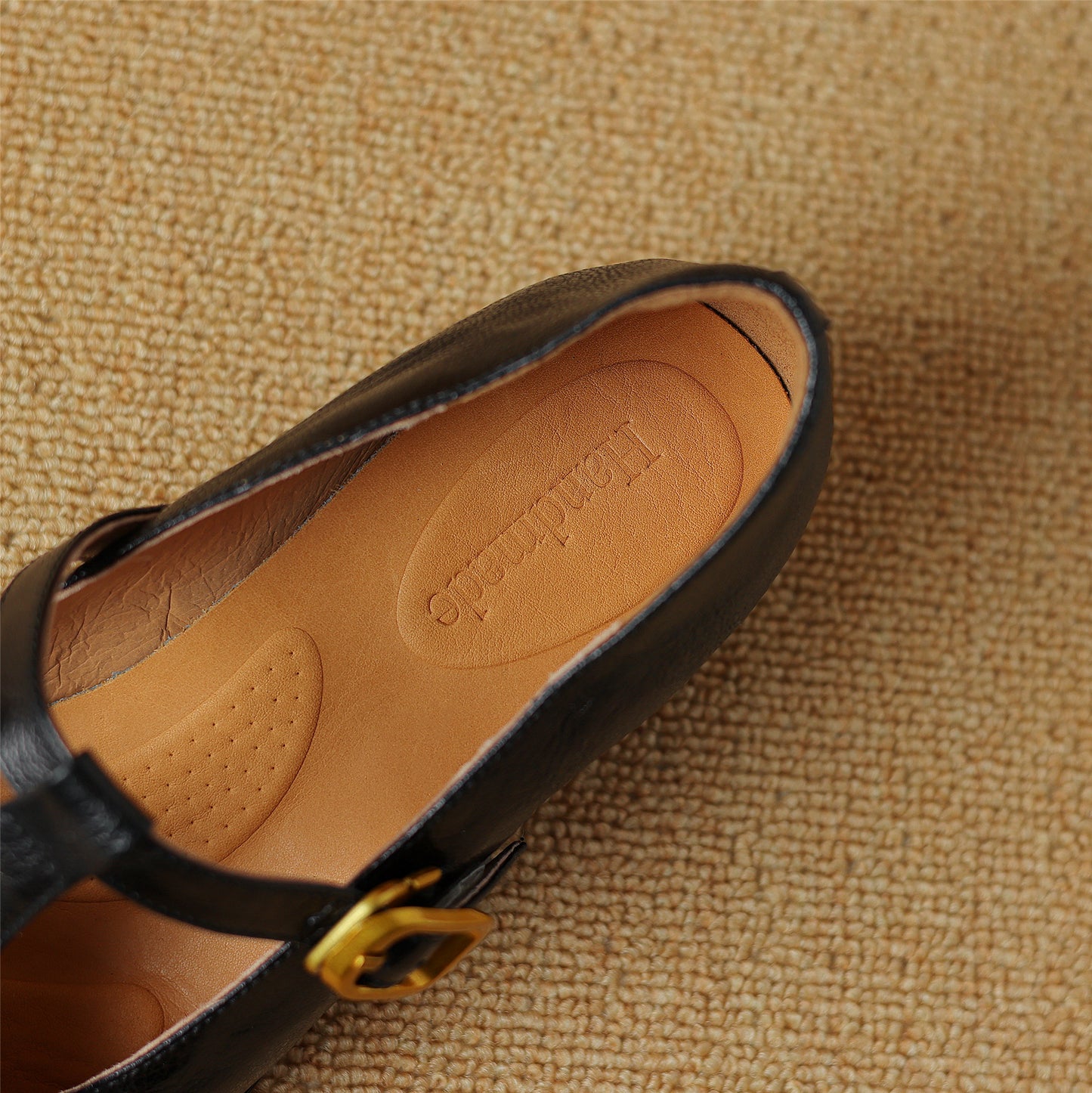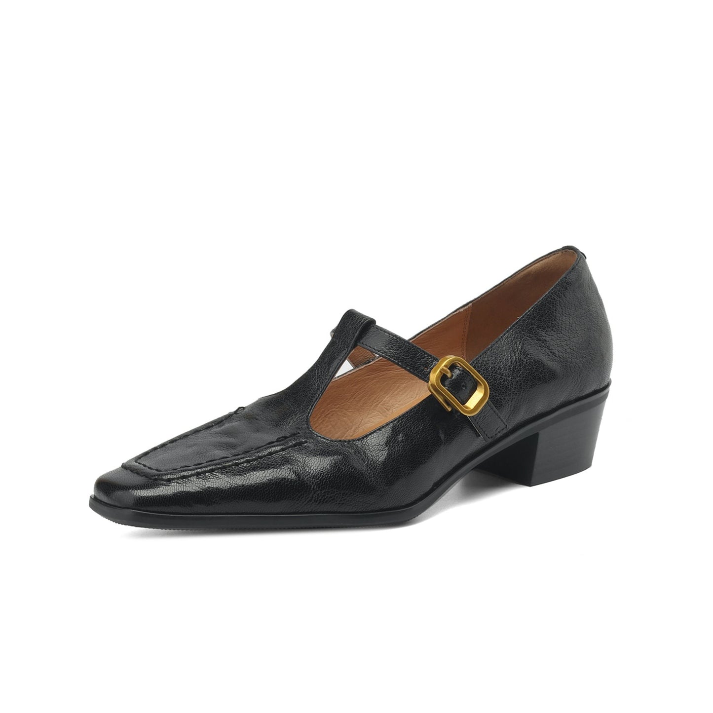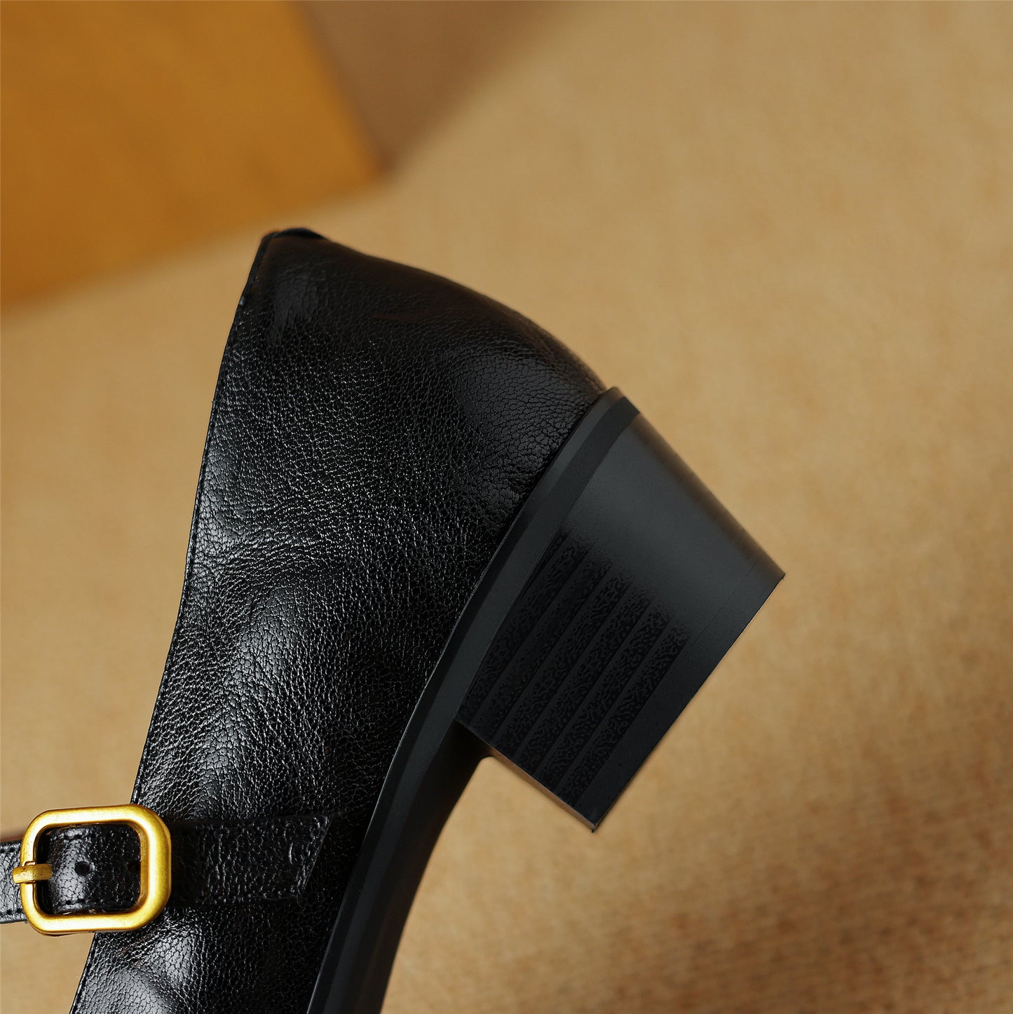 TinaCus Women's Genuine Leather Handmade Chunky Heel T-Strap Buckle Pumps