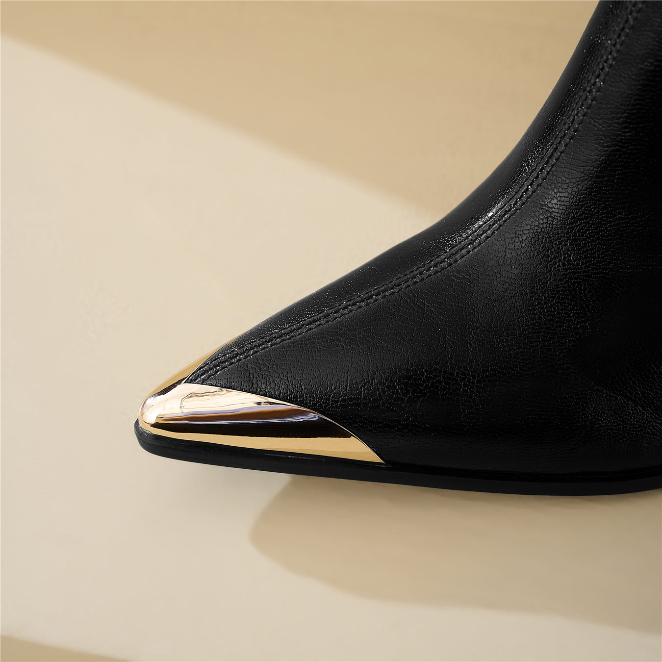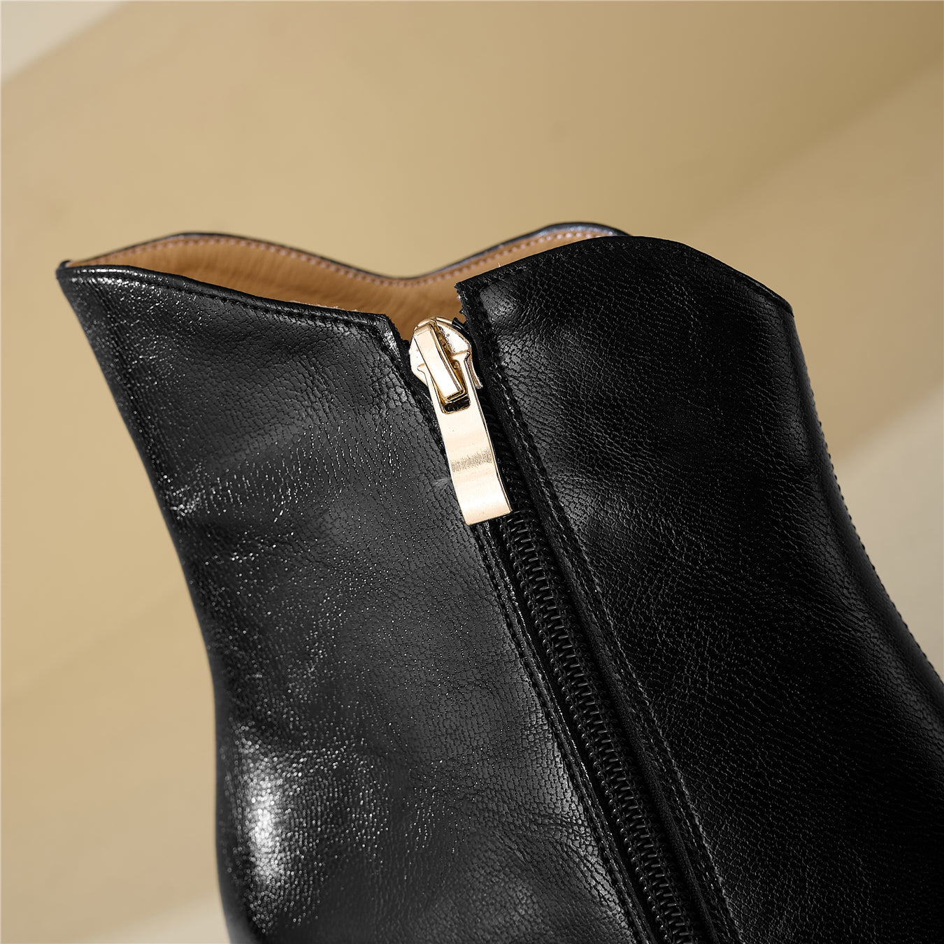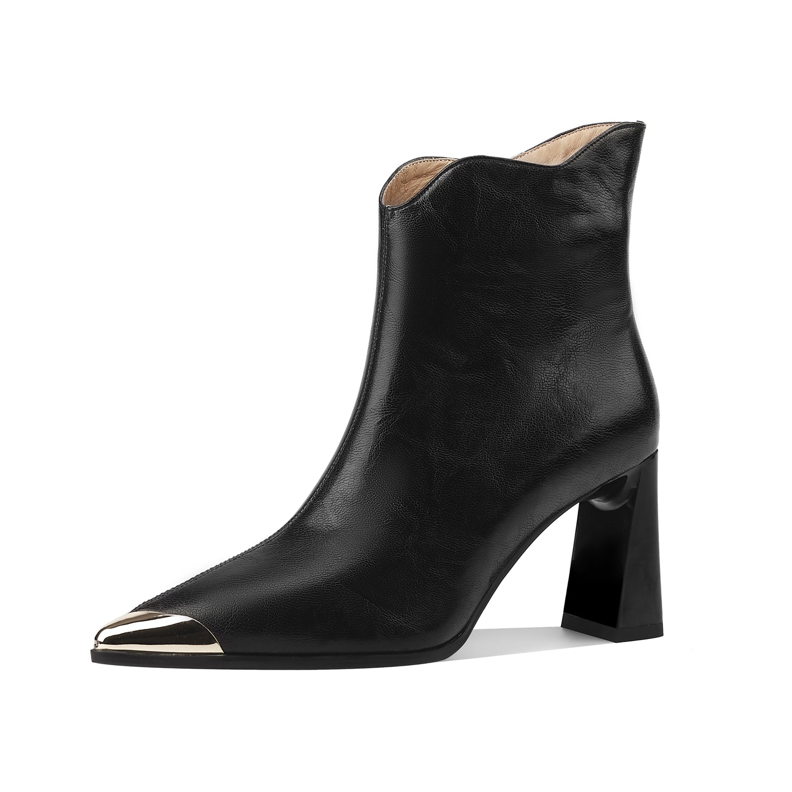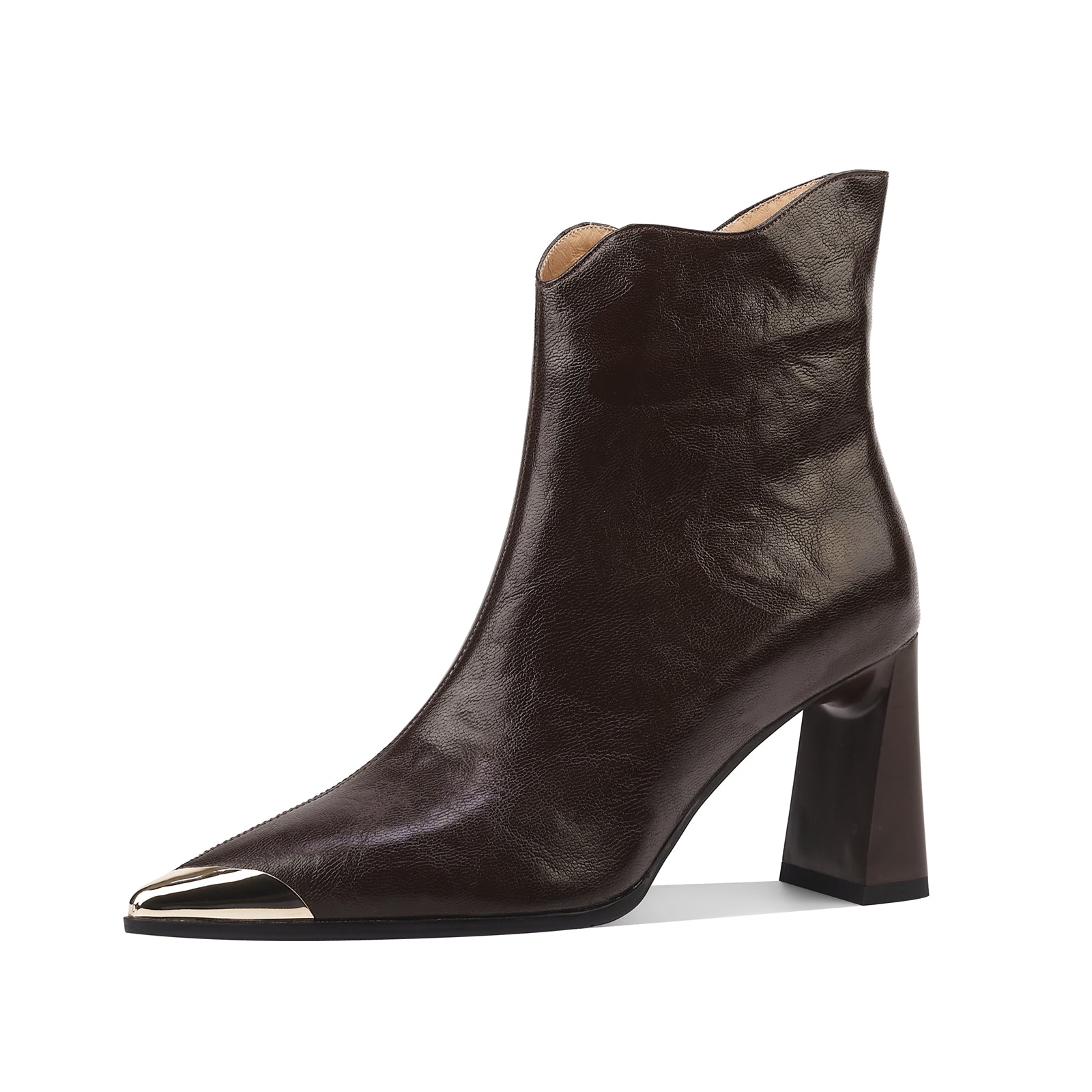 Ankle boots are designed with pointed toe, genuine leather, zip and high heel.