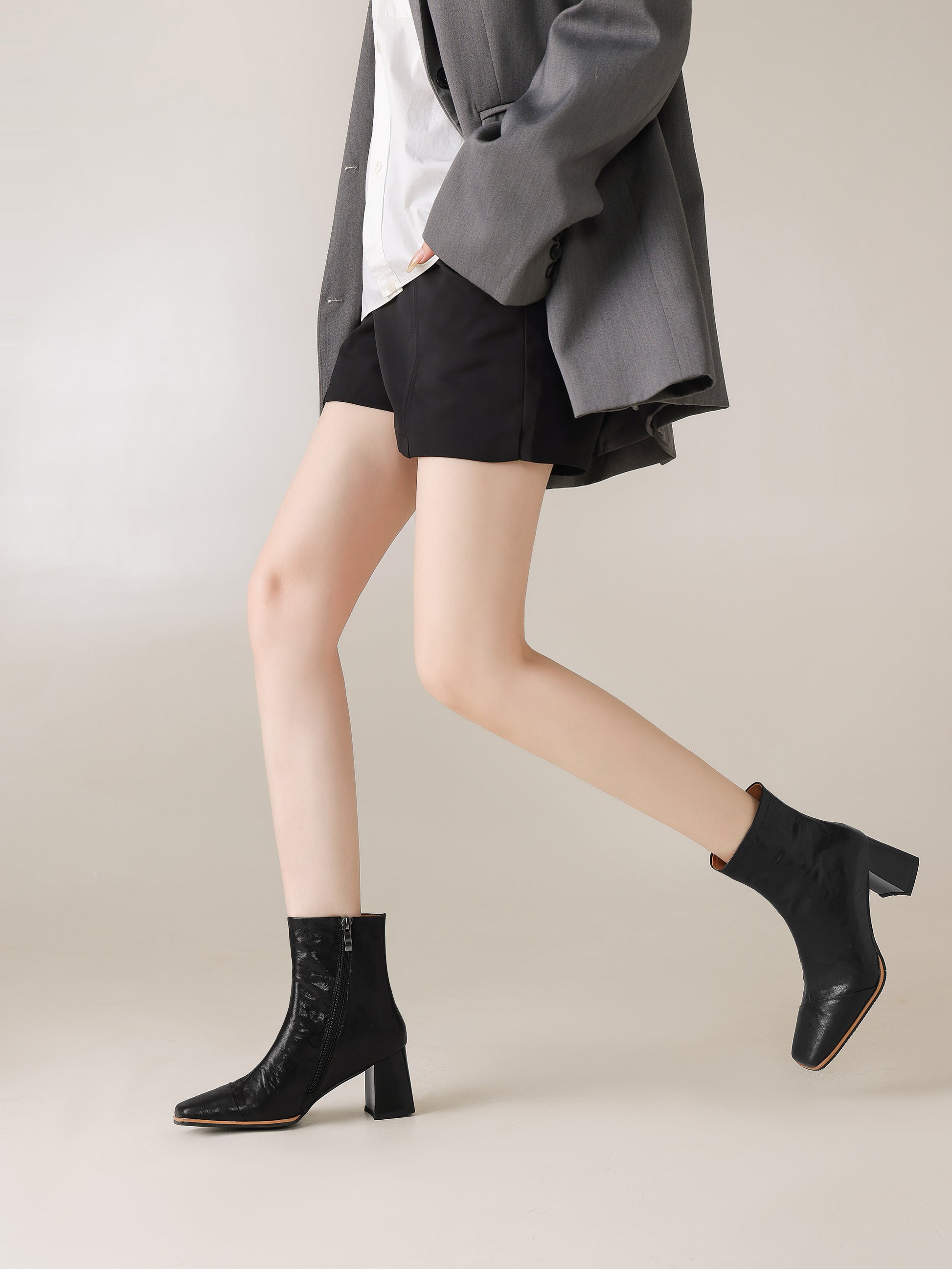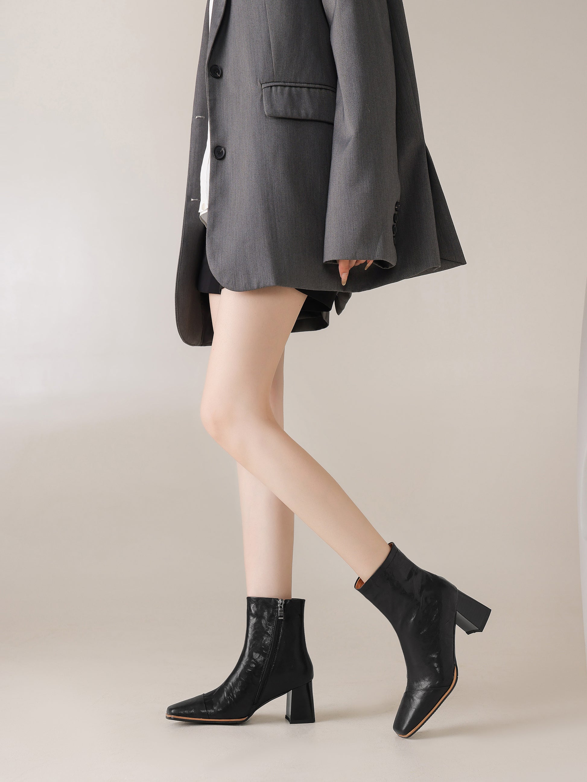 Classic square-toe ankle boots with low block heels deliver stable, all-day comfort