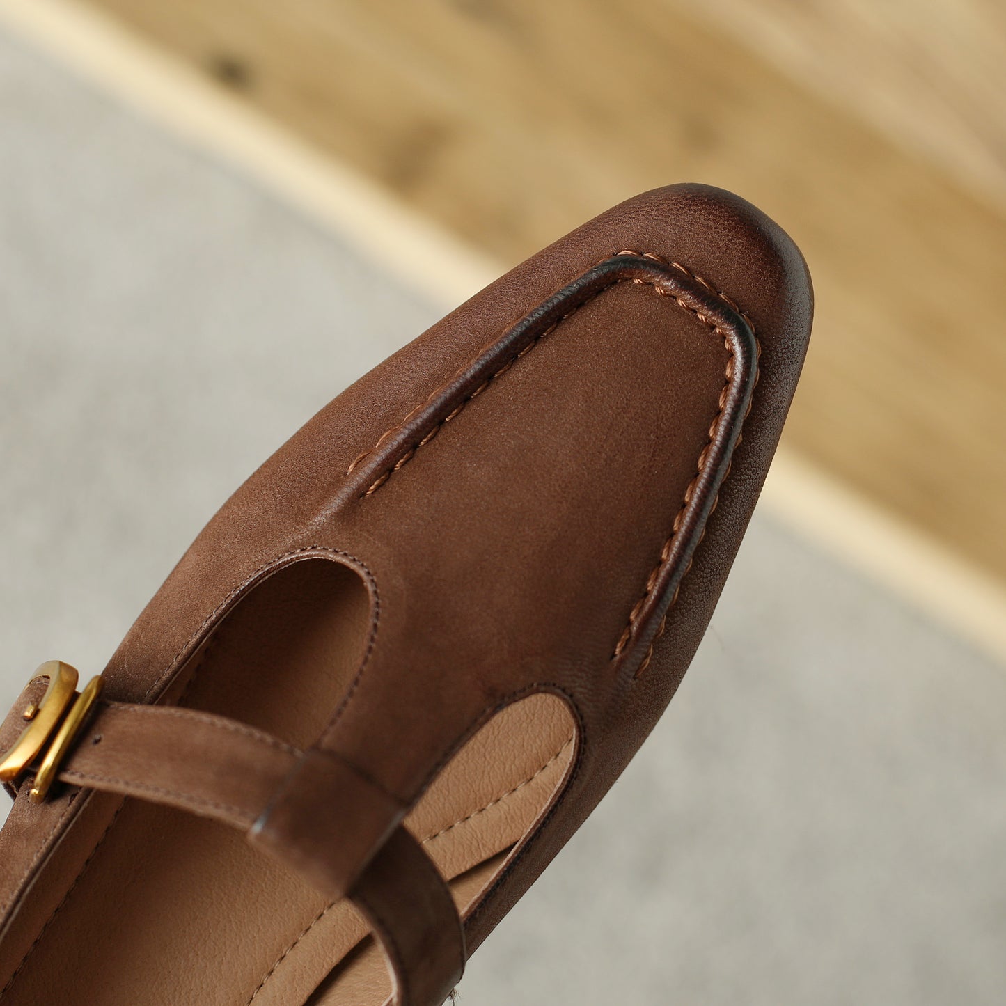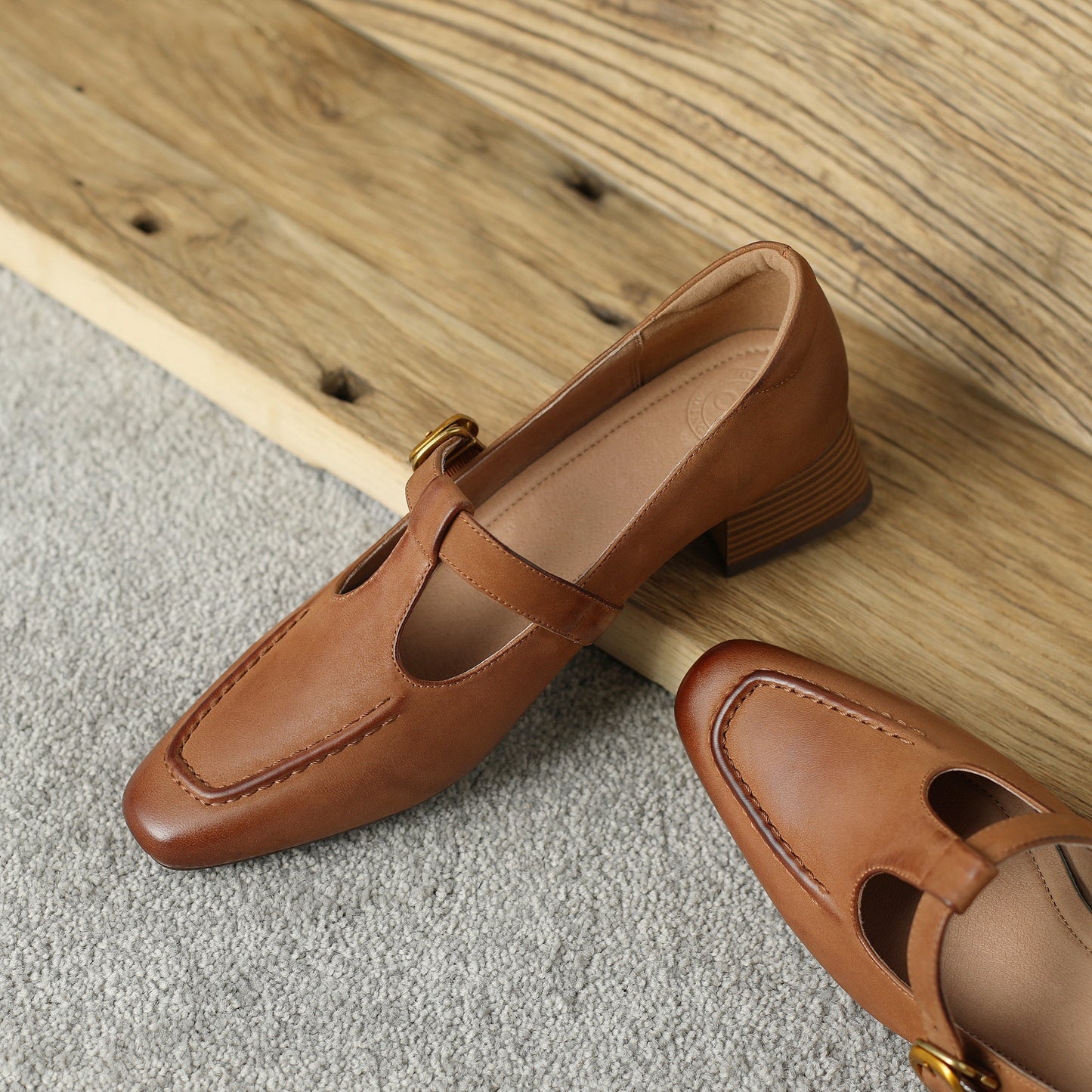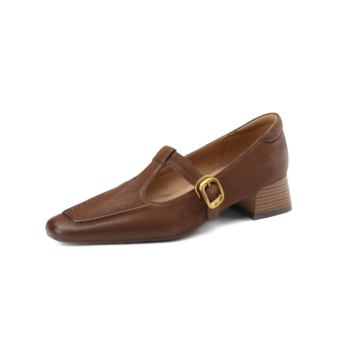 TinaCus Women's Handmade Genuine Leather Chunky Heel T-Strap Buckle Pumps