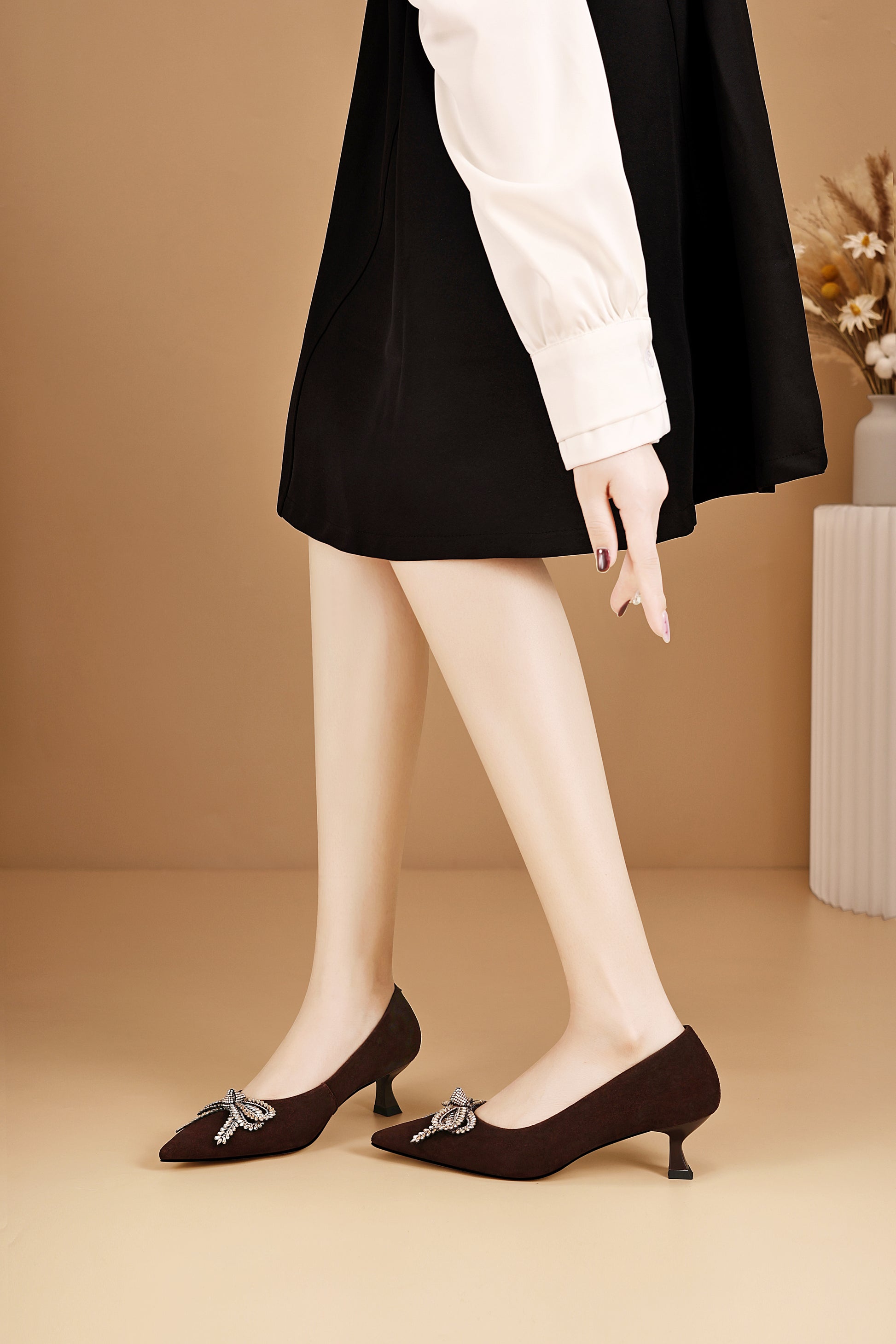 These pumps have many nice features like pointed toe pumps, slip on, rhinestone bow, and kitten Heel.