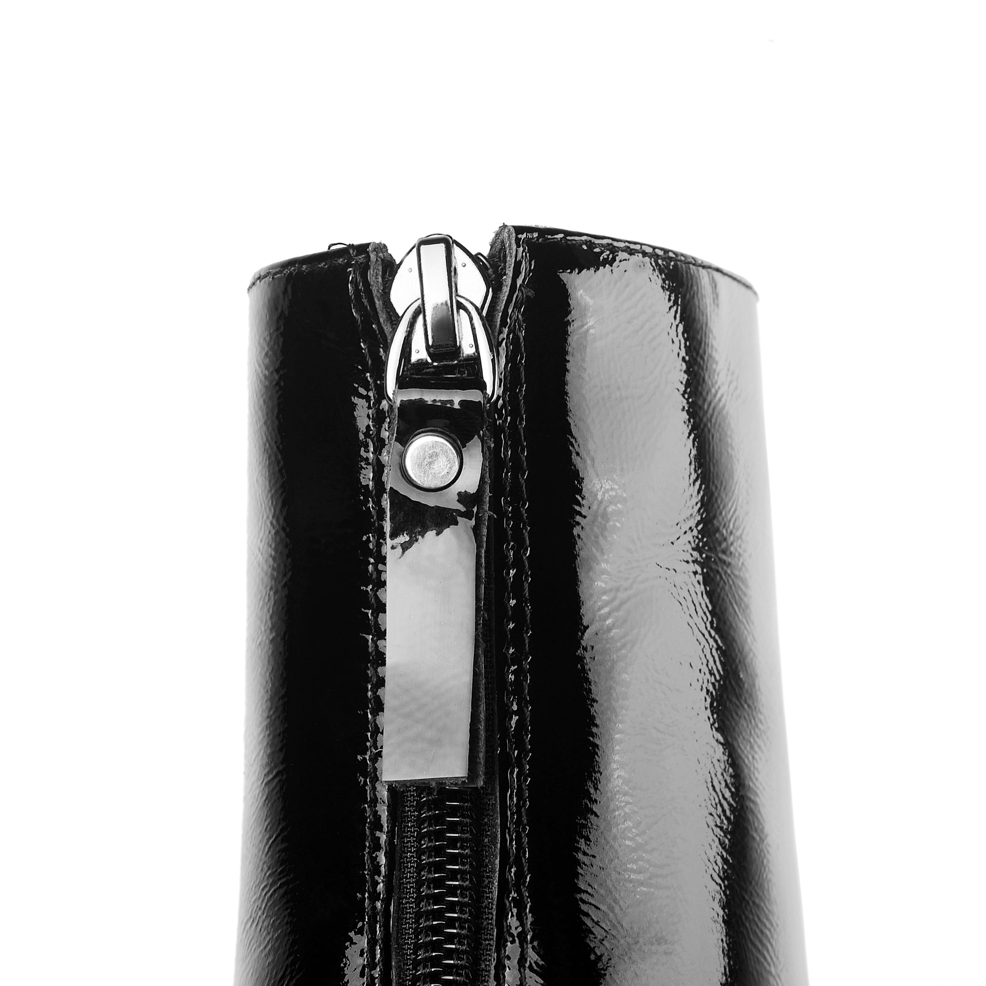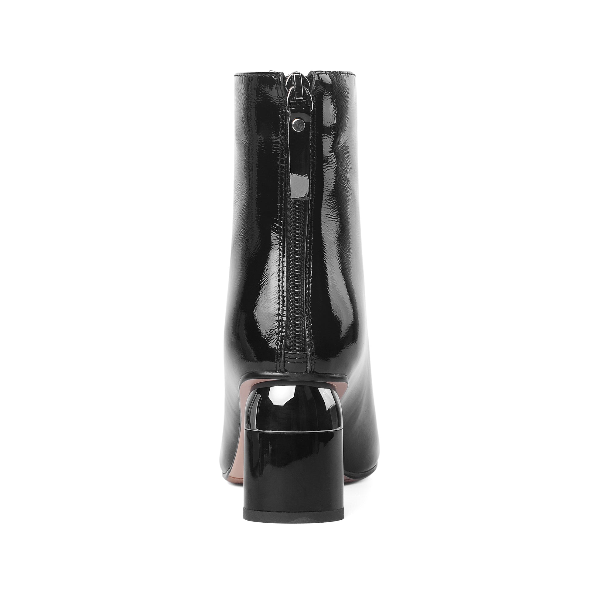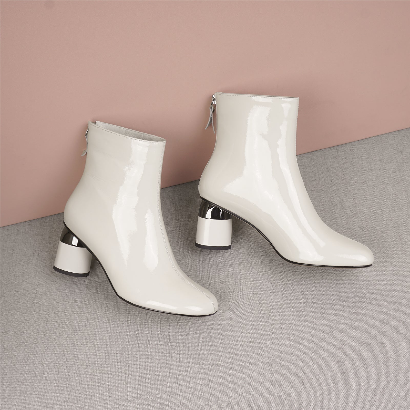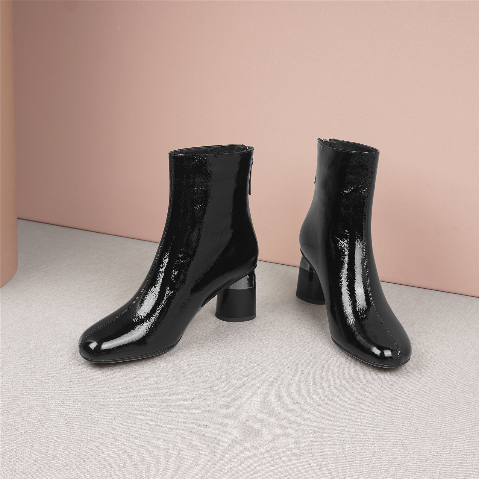 Ankle boots are designed with round toe, patent leather, zip and chunky heel.