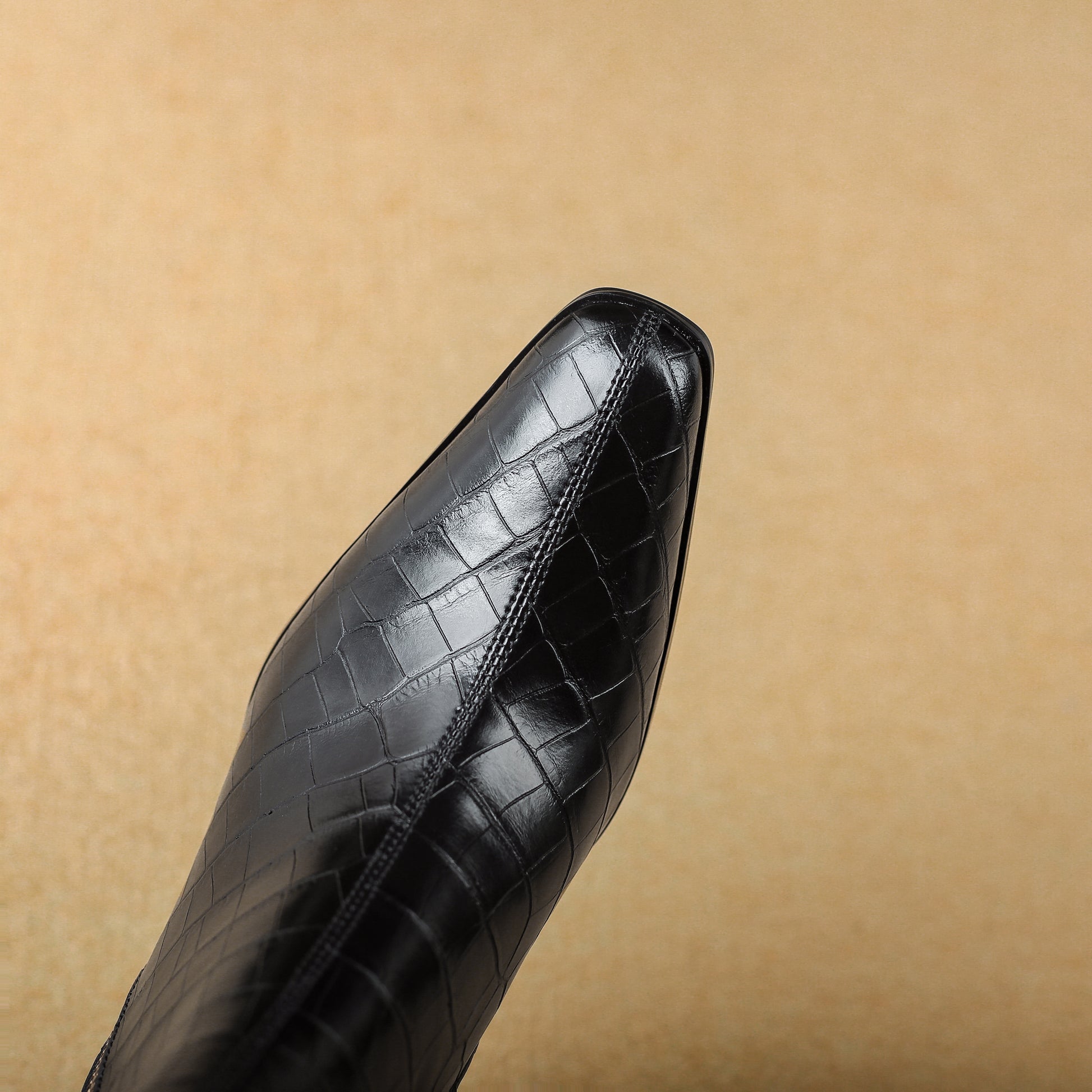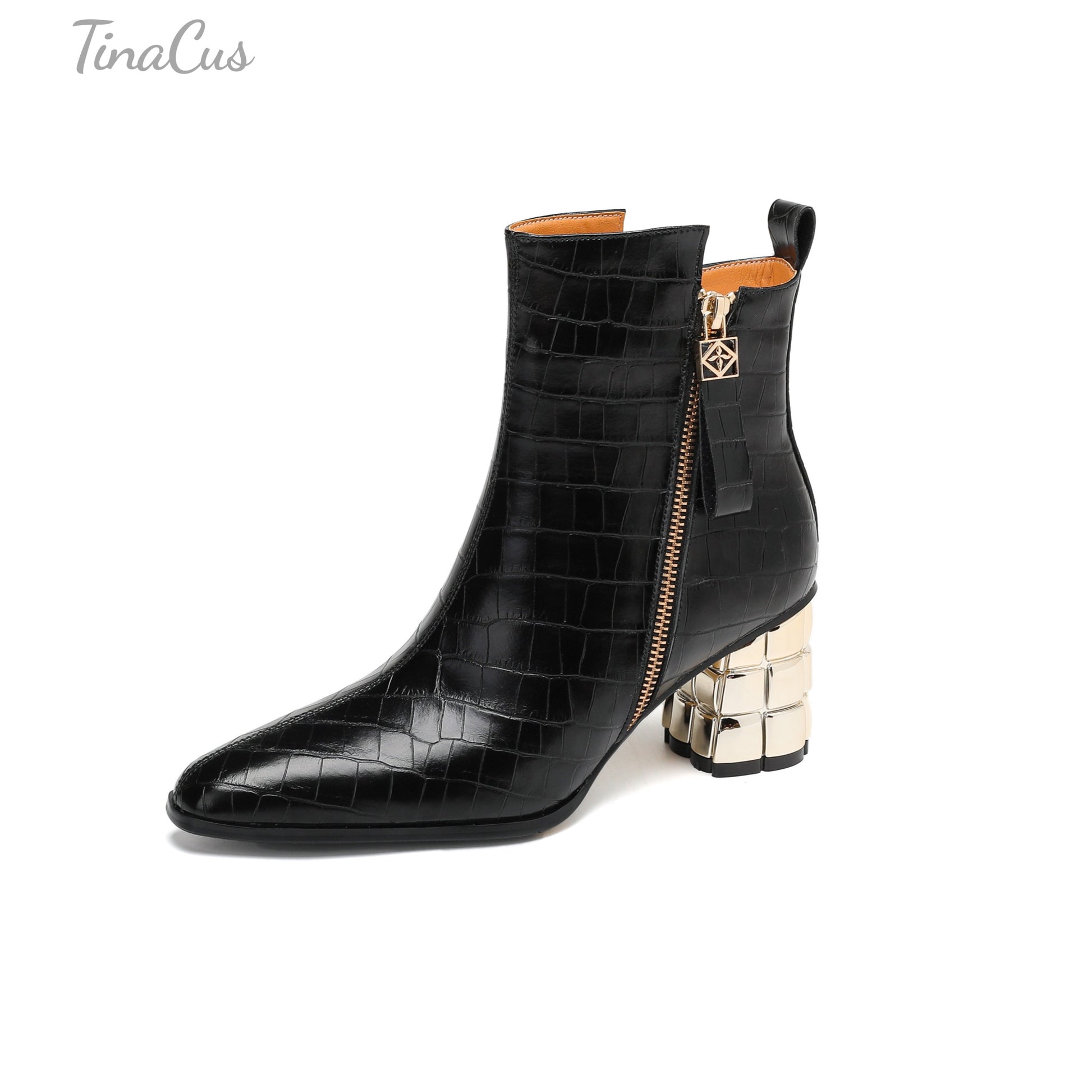 TinaCus Women's Pointed Toe Checkered Pattern Genuine Leather Handmade Zippers Mid Chunky Heels Ankle Boots