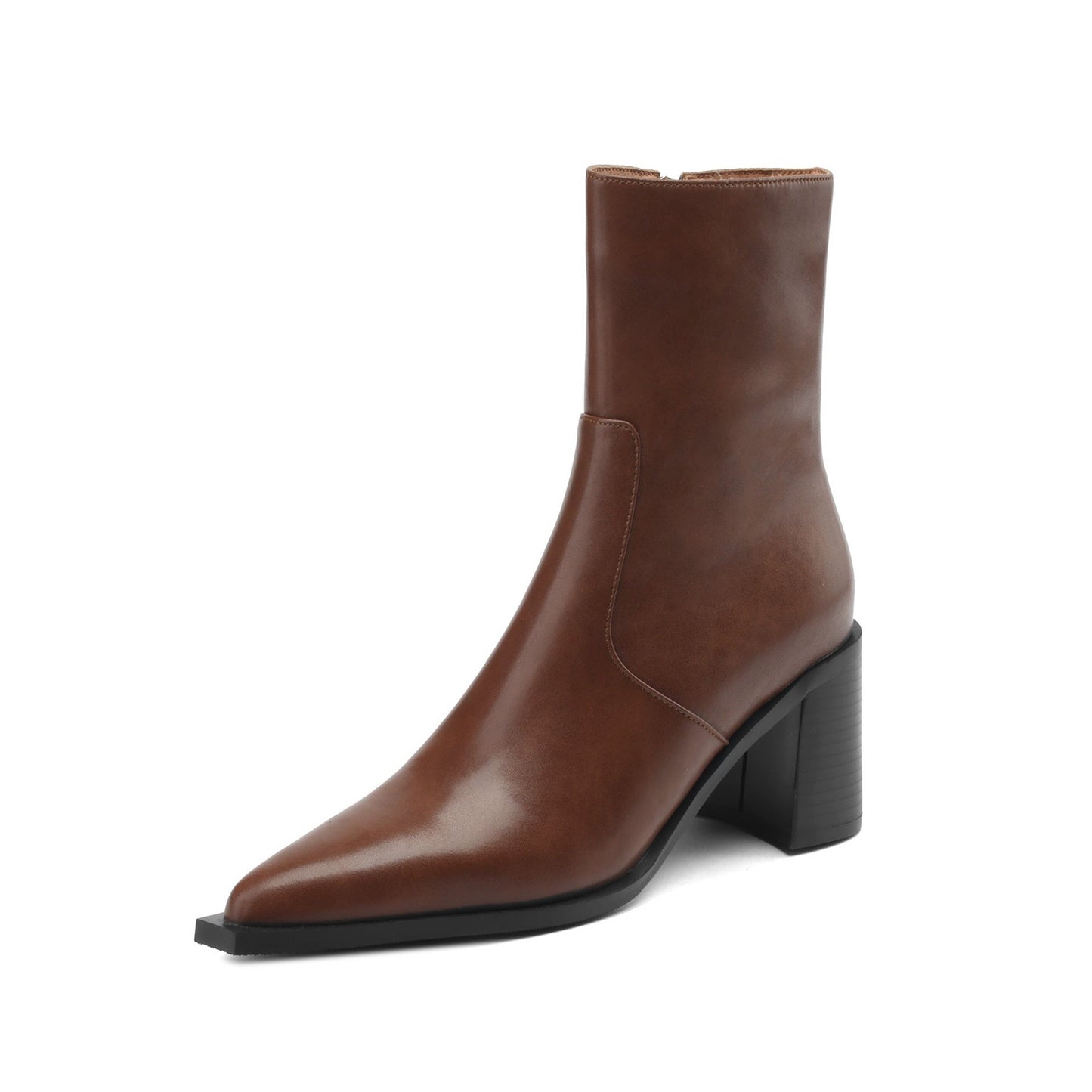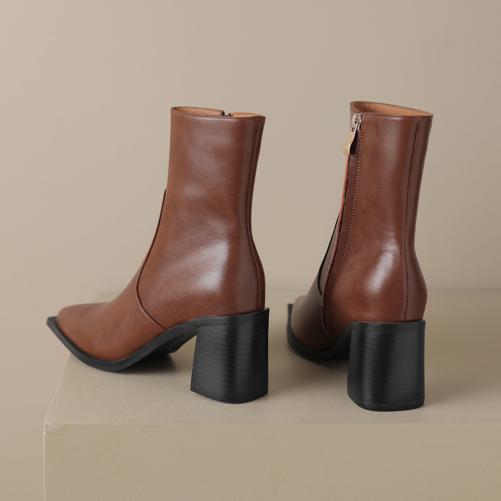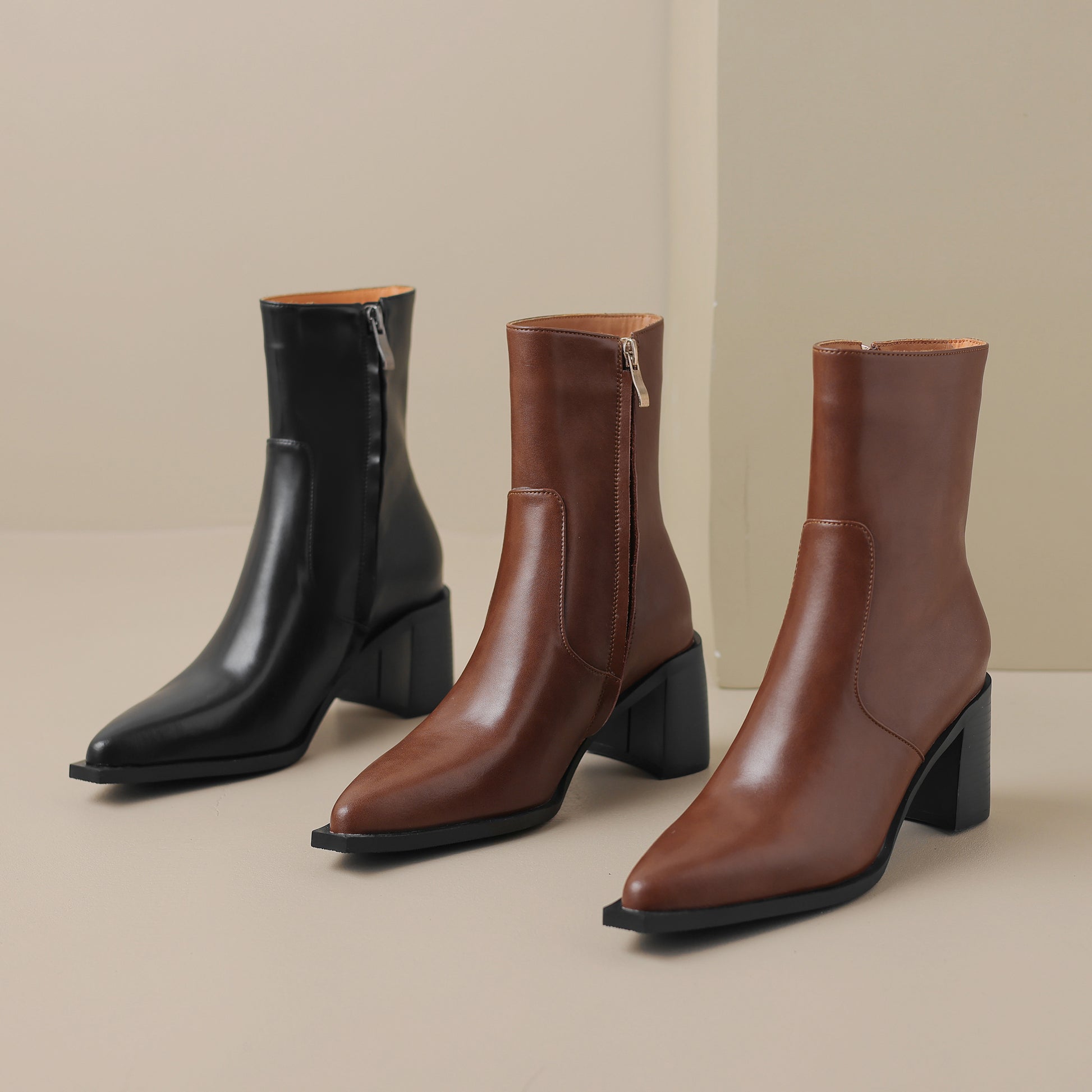 Mid calf boots are designed with genuine leather, block heel, pointed toe and zip up to keep up with fashion trend.