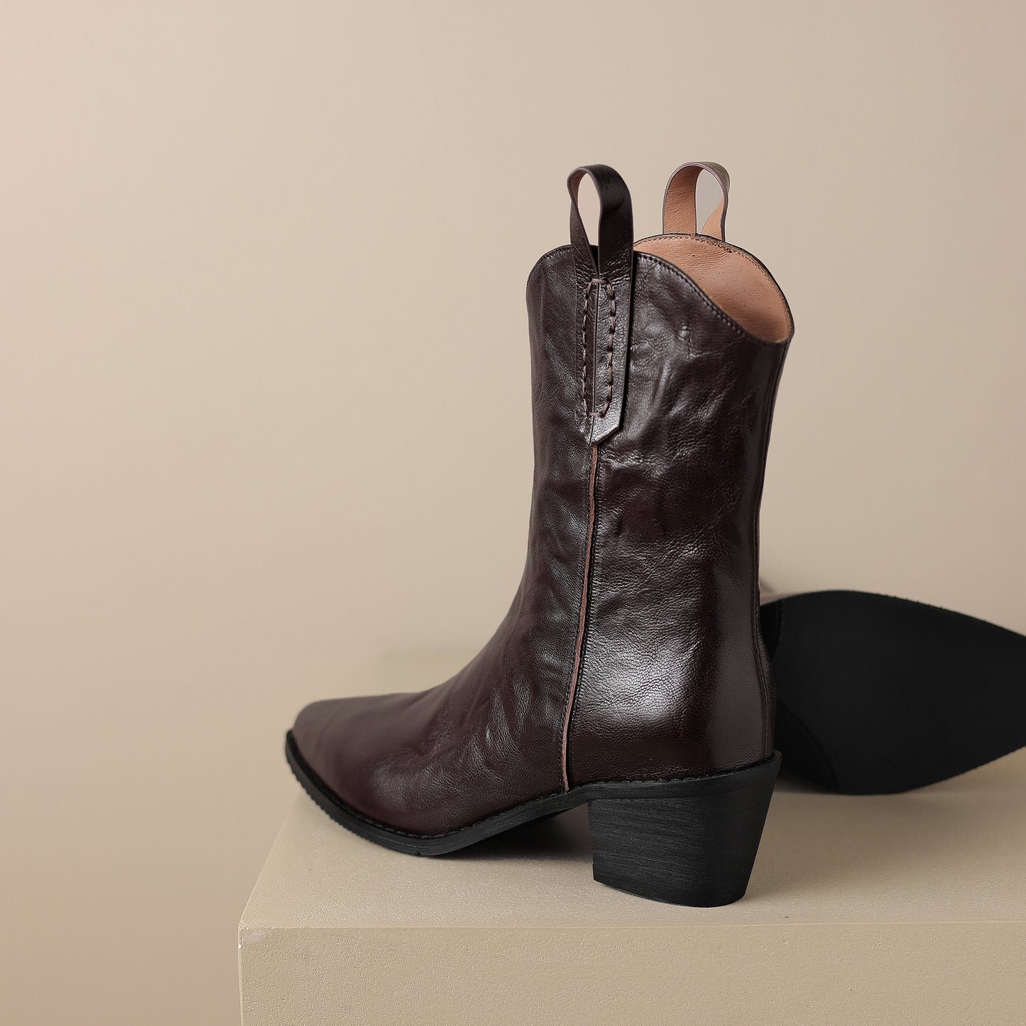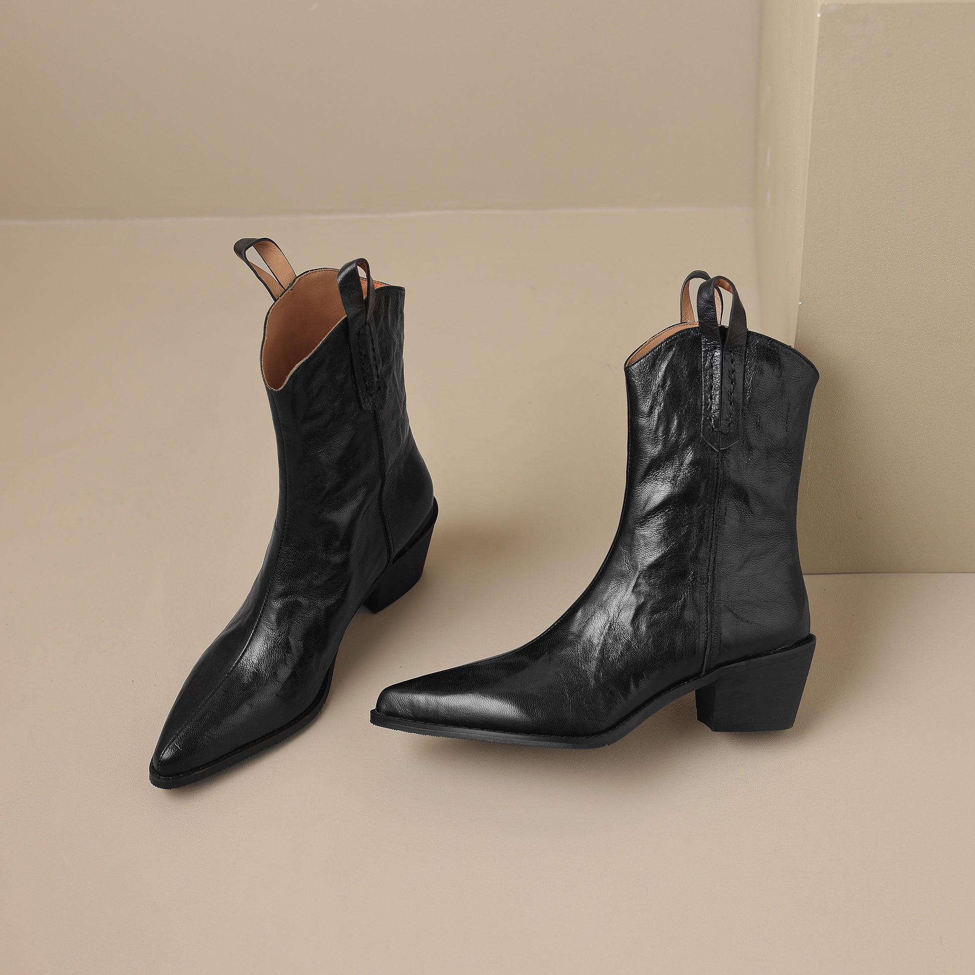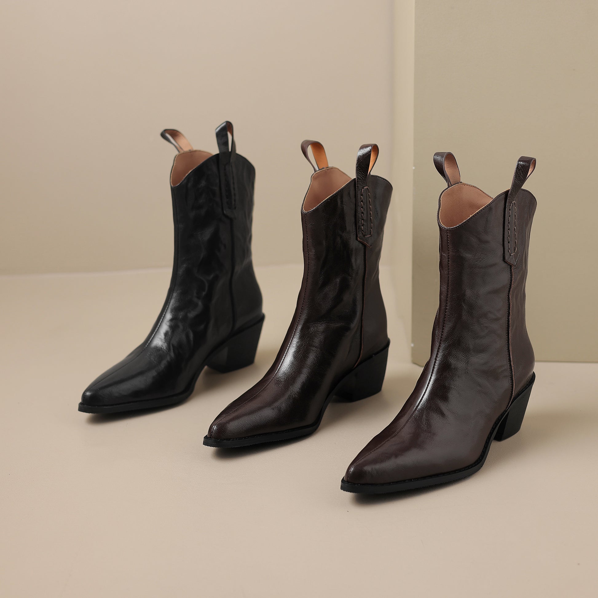 Mid calf boots are designed with genuine leather, block heel, pointed toe and pull on to keep up with fashion trend.