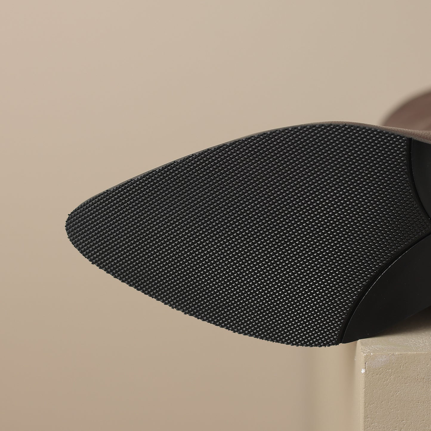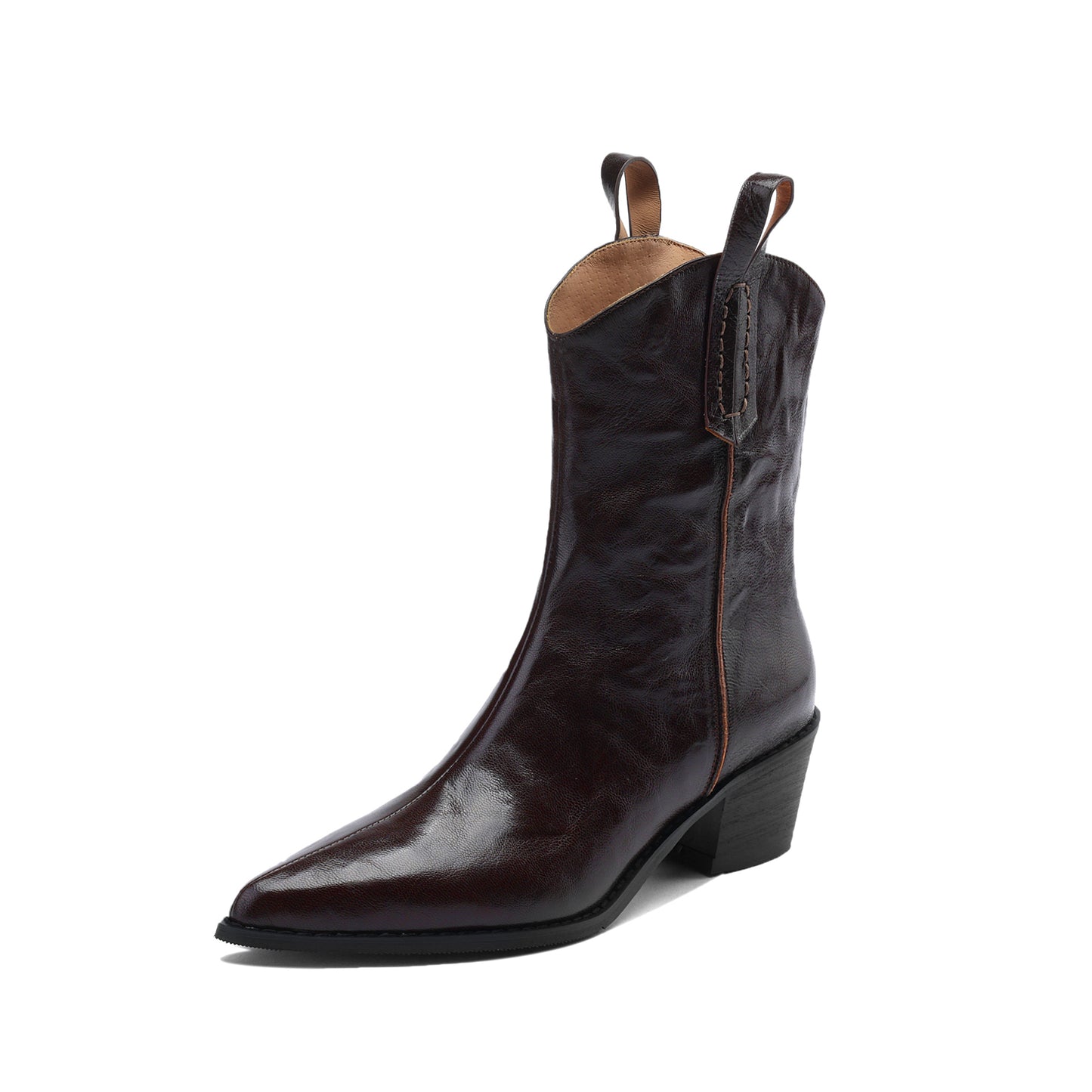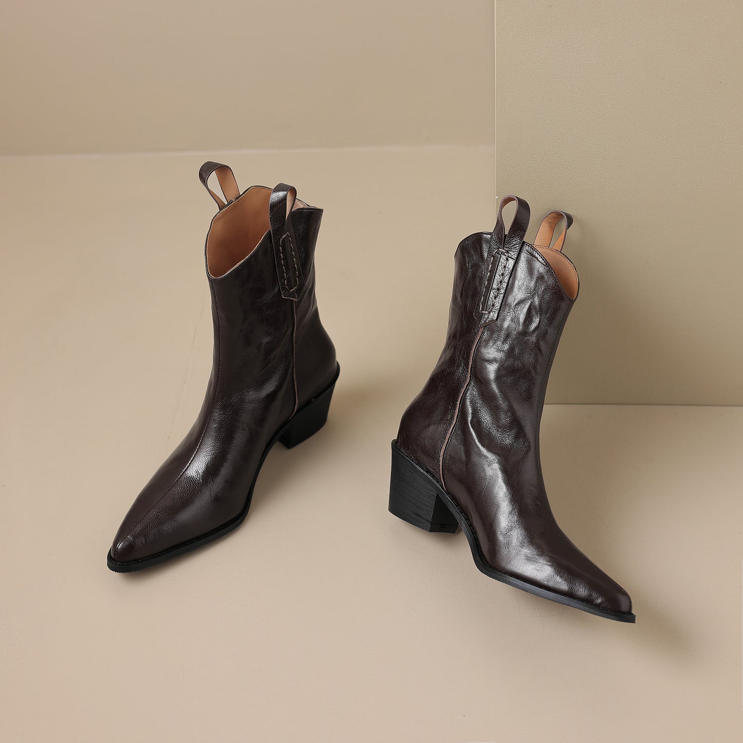 Mid calf boots are designed with genuine leather, block heel, pointed toe and pull on to keep up with fashion trend.