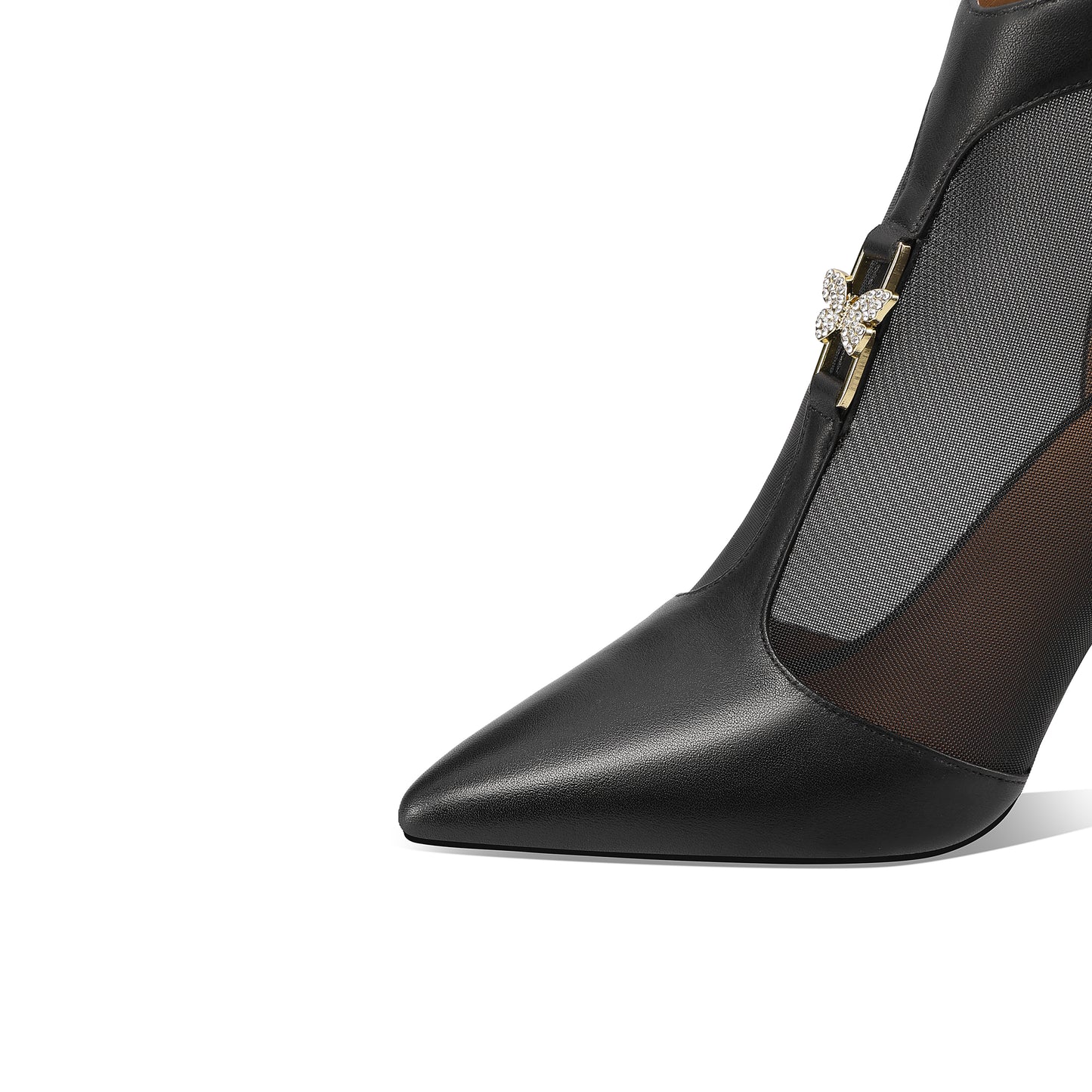 Summer mesh ankle boots with pointed toe, zipper, butterfly, genuine leather and high heels can go with kinds of outfits.