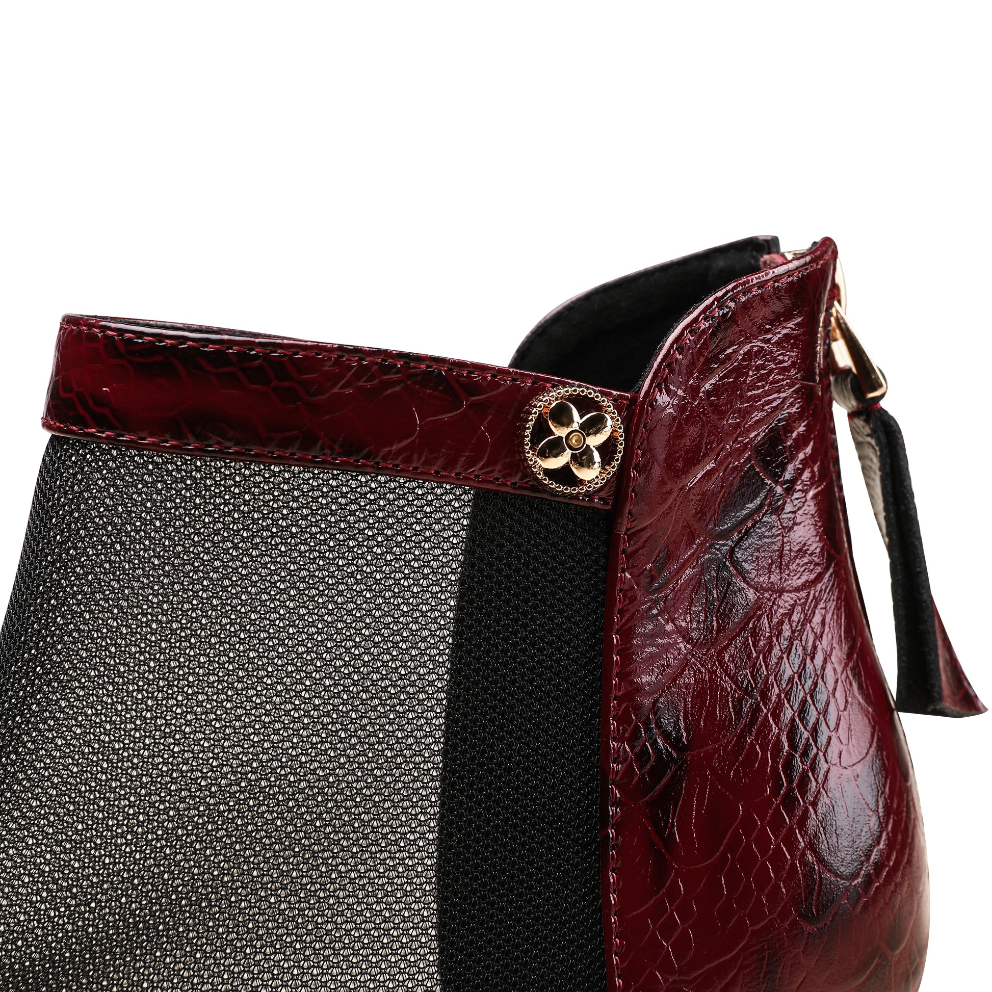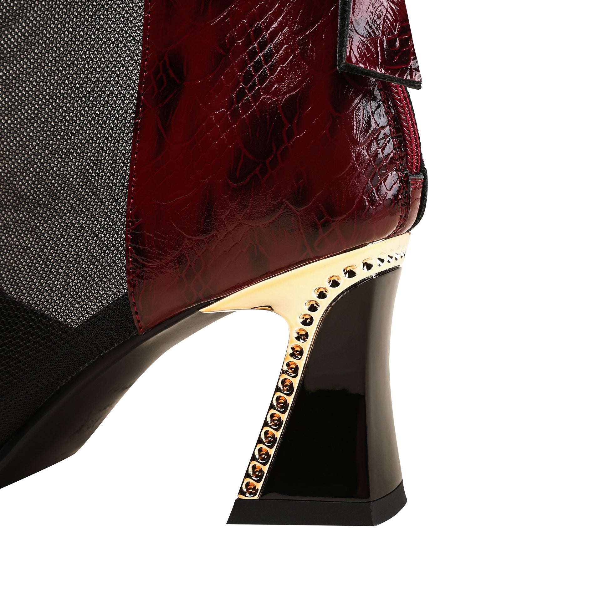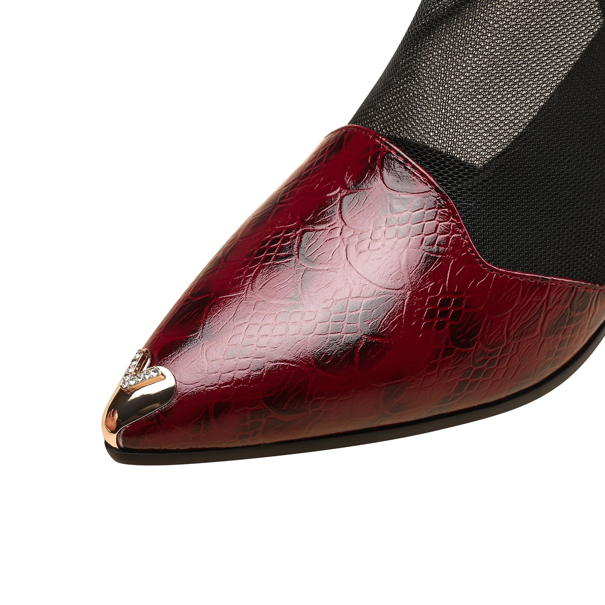 Ankle boots deisgned with pointed toe, embossed genuine leather, mesh, back zipper and mid heels to keep up with fashion trend.