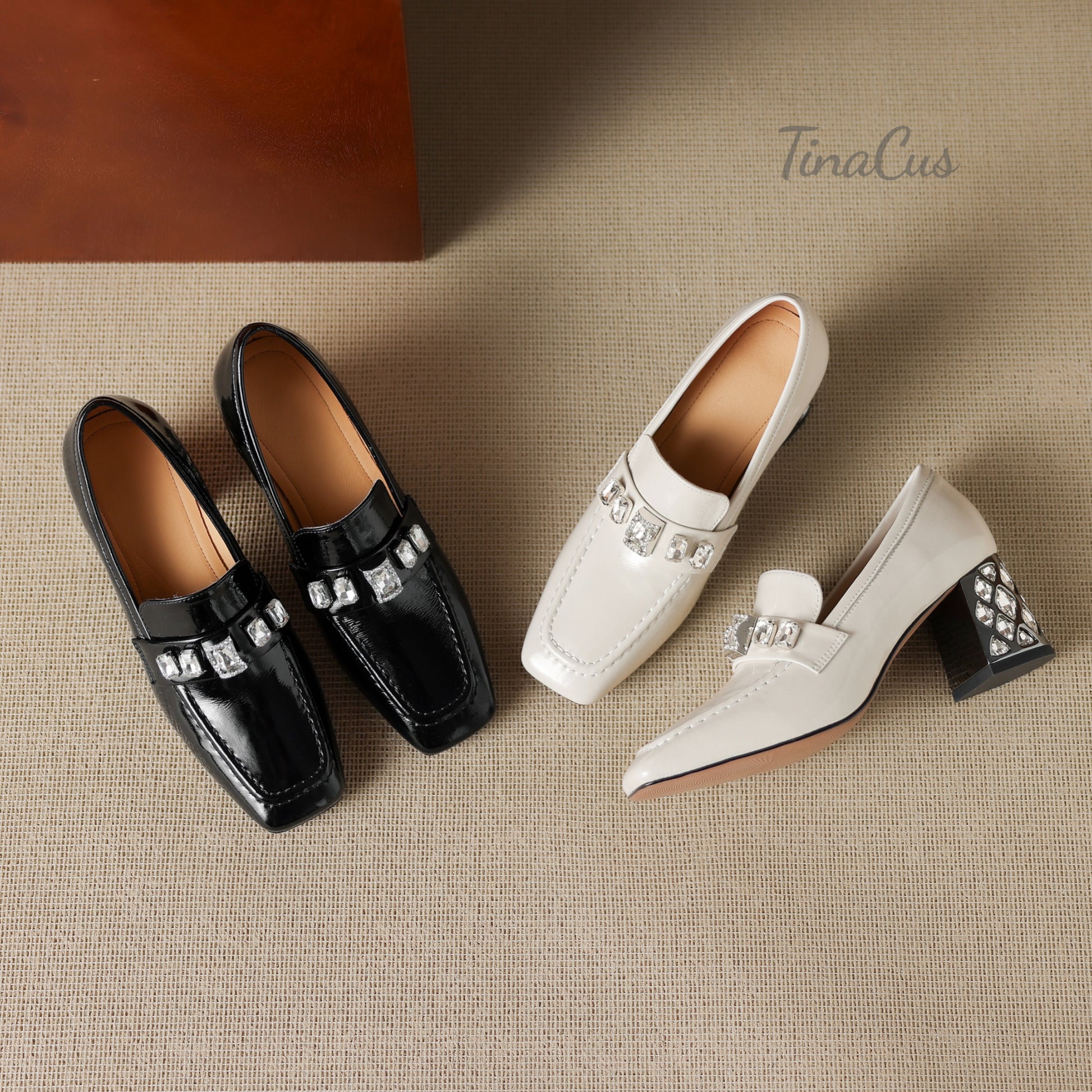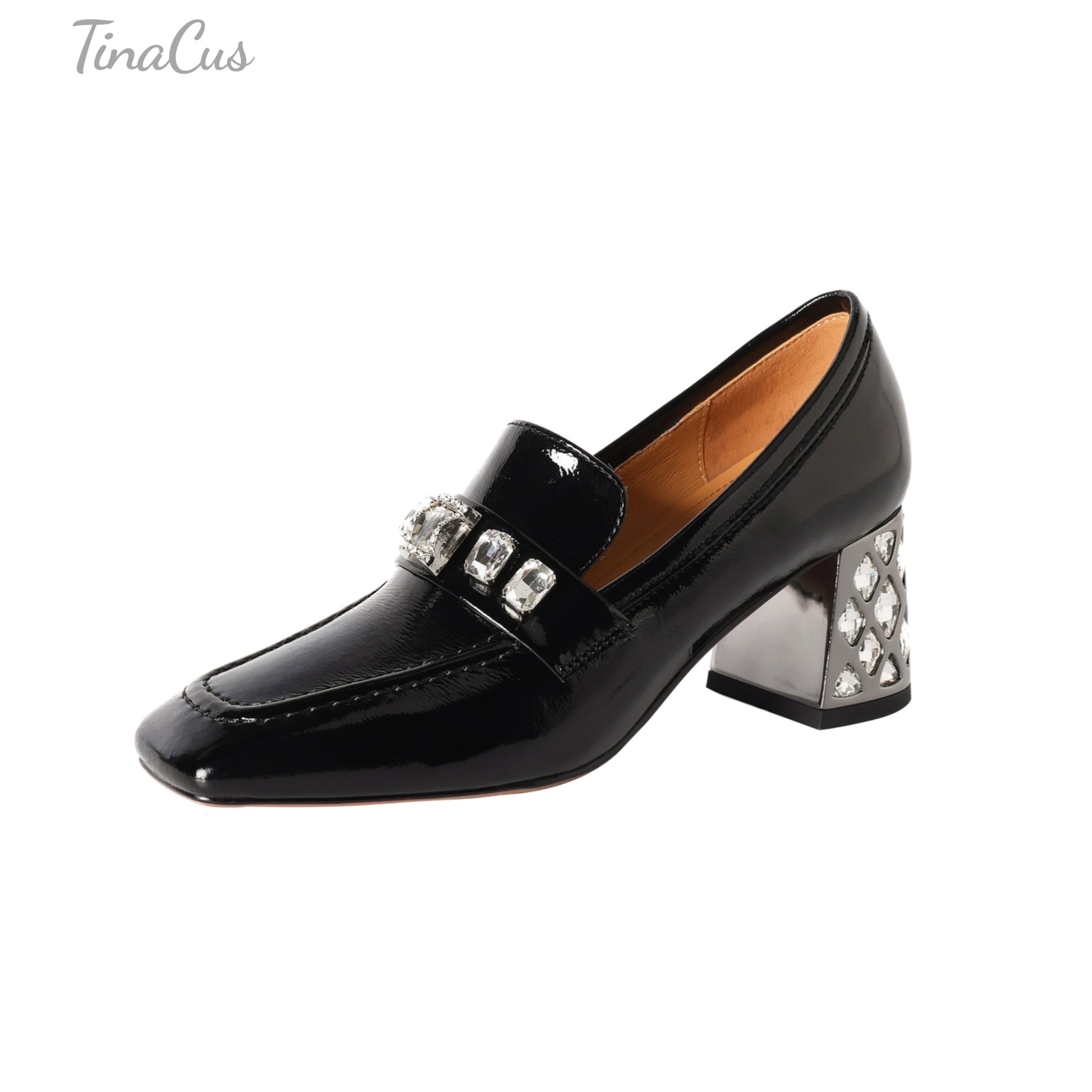 TinaCus Women's Square Toe Slip on Pumps Shoes Patent Leather Handmade Rhinestones Chunky Heels