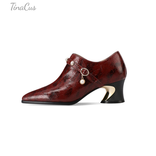 TinaCus Cap Toe Genuine Leather with Pleats Handmade Mid Heels Women's Ankle Boots with Back Zipper