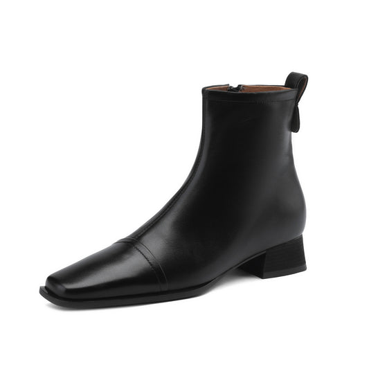 TinaCus Genuine Leather Women's Handmade Chunky Heel Side Zip Up Square Toe Ankle Boots with Front Zipper Decor