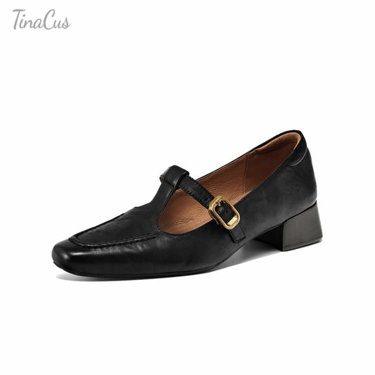 TinaCus Genuine Leather Women's Handmade Square Toe Buckle Block Heel T-Strap Pumps