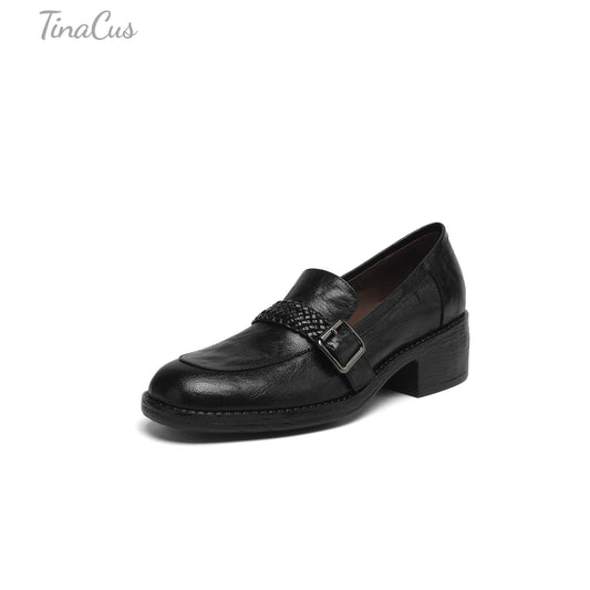 TinaCus Handmade Women's Genuine Leather Round Toe Woven Buckle Chunky Heel Slip On Loafer Shoes