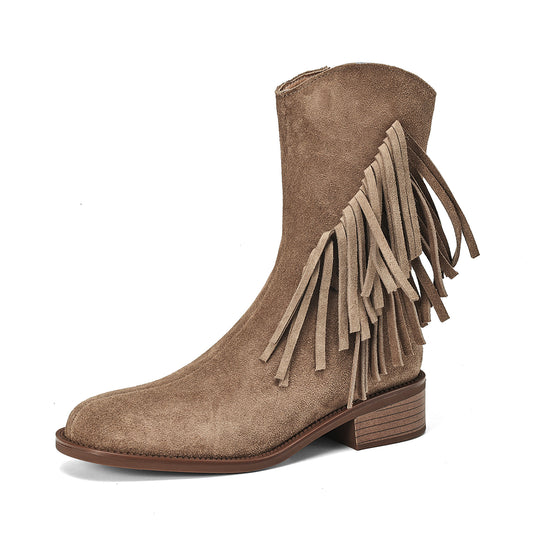 TinaCus Women's Genuine Leather Block Heel Handmade Side Zip Tassel Mid Calf Boots
