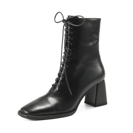 TinaCus Women's Square Toe Genuine Leather Handmade Chains Deocr High Chunky Heel Boots with Back Zipper
