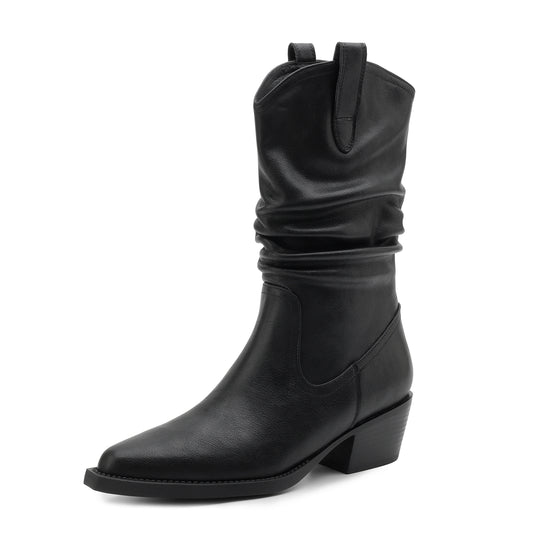 TinaCus Women's Genuine Leather Ruffle Block Heel Handmade Pointed Toe Western Mid-Calf Boots