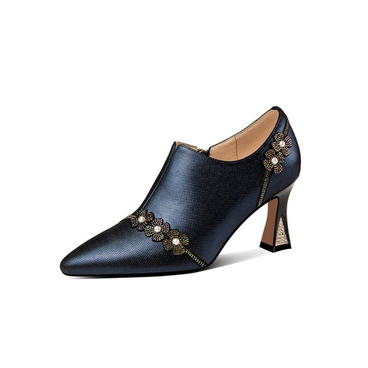 TinaCus Women's Pointed Toe Embroidered Floral Print Genuine Leather Handmade Buckle Chunky Heel Sandal Pumps