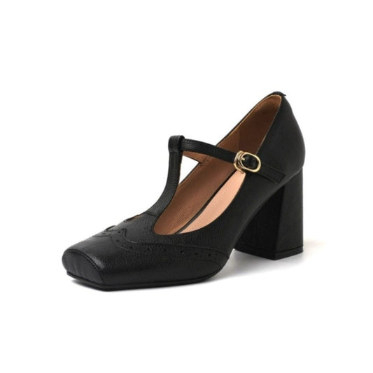 TinaCus Handmade Women's Genuine Leather T-Strap Buckle Square Toe High Block Heel Mary Janes Pumps Shoes