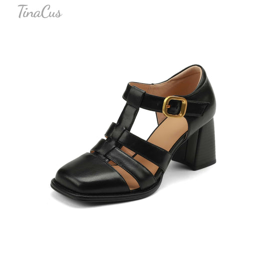 TinaCus Women's Square Toe Handmade Genuine Leather Hollow Buckle Chunky Heel Sandal Pumps