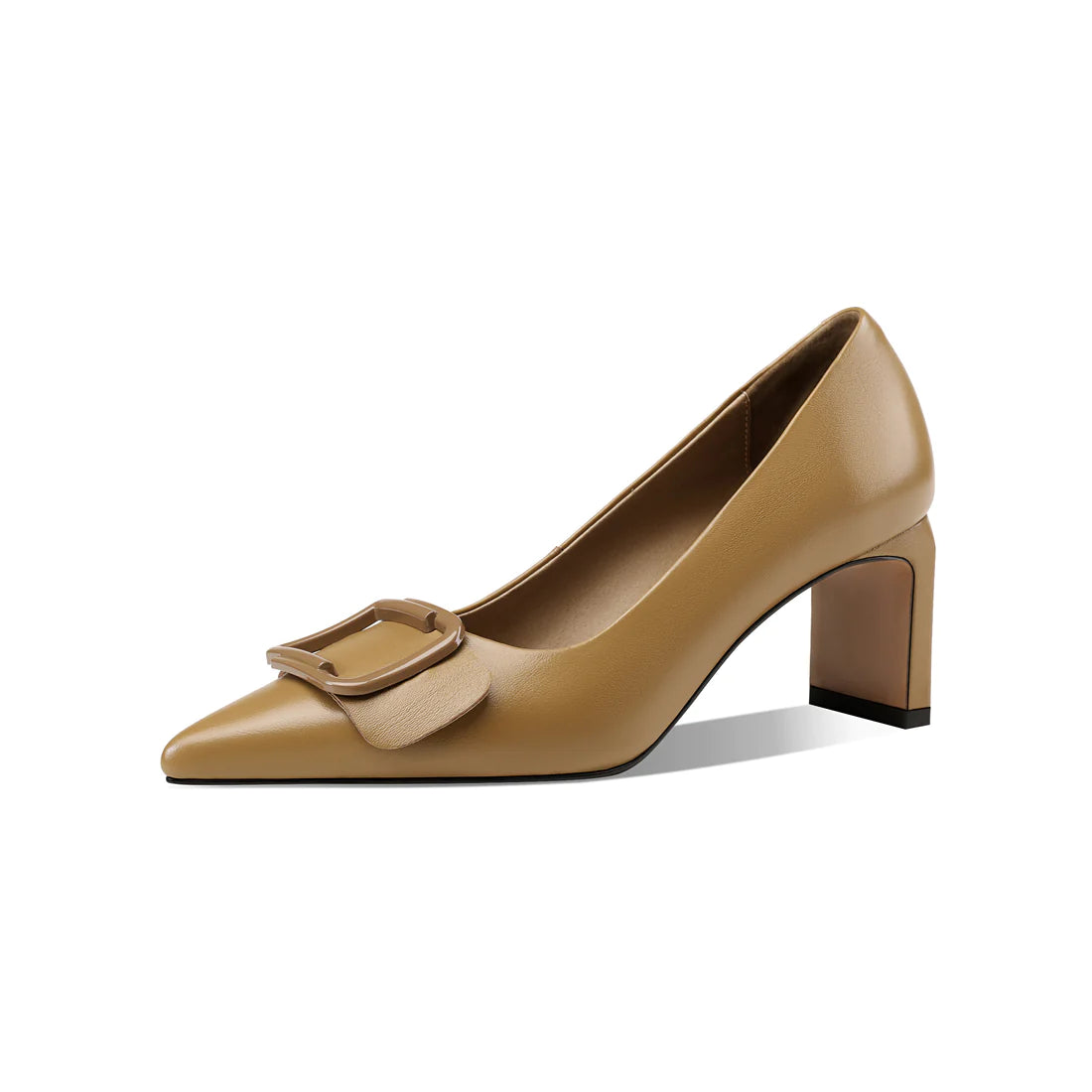Graceful pumps shoes featured with genuine leather, pointed toe, buckle and mid heels are suitable for working, dating and daily life.