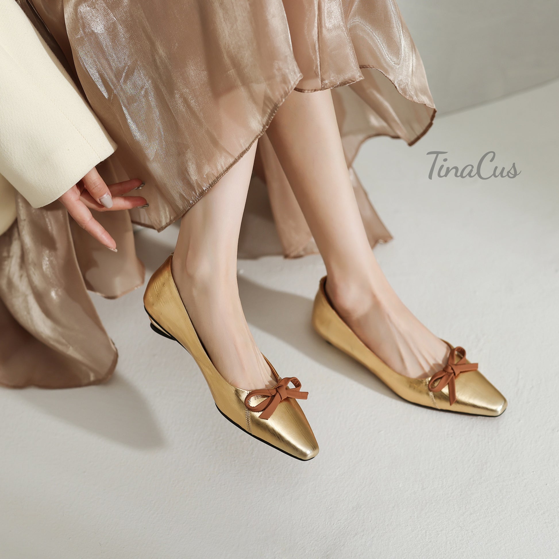 Comfortable flats with genuine leather, square-pointed toe and bowknot can go with kinds of outfits