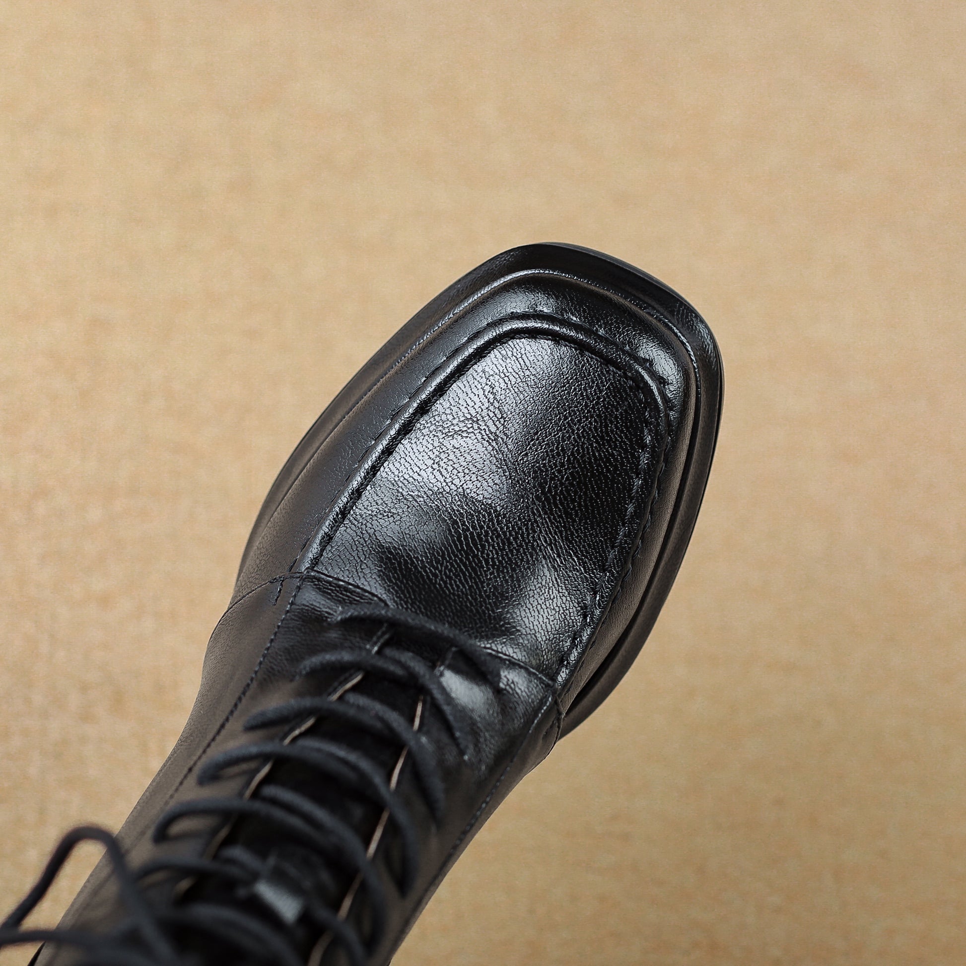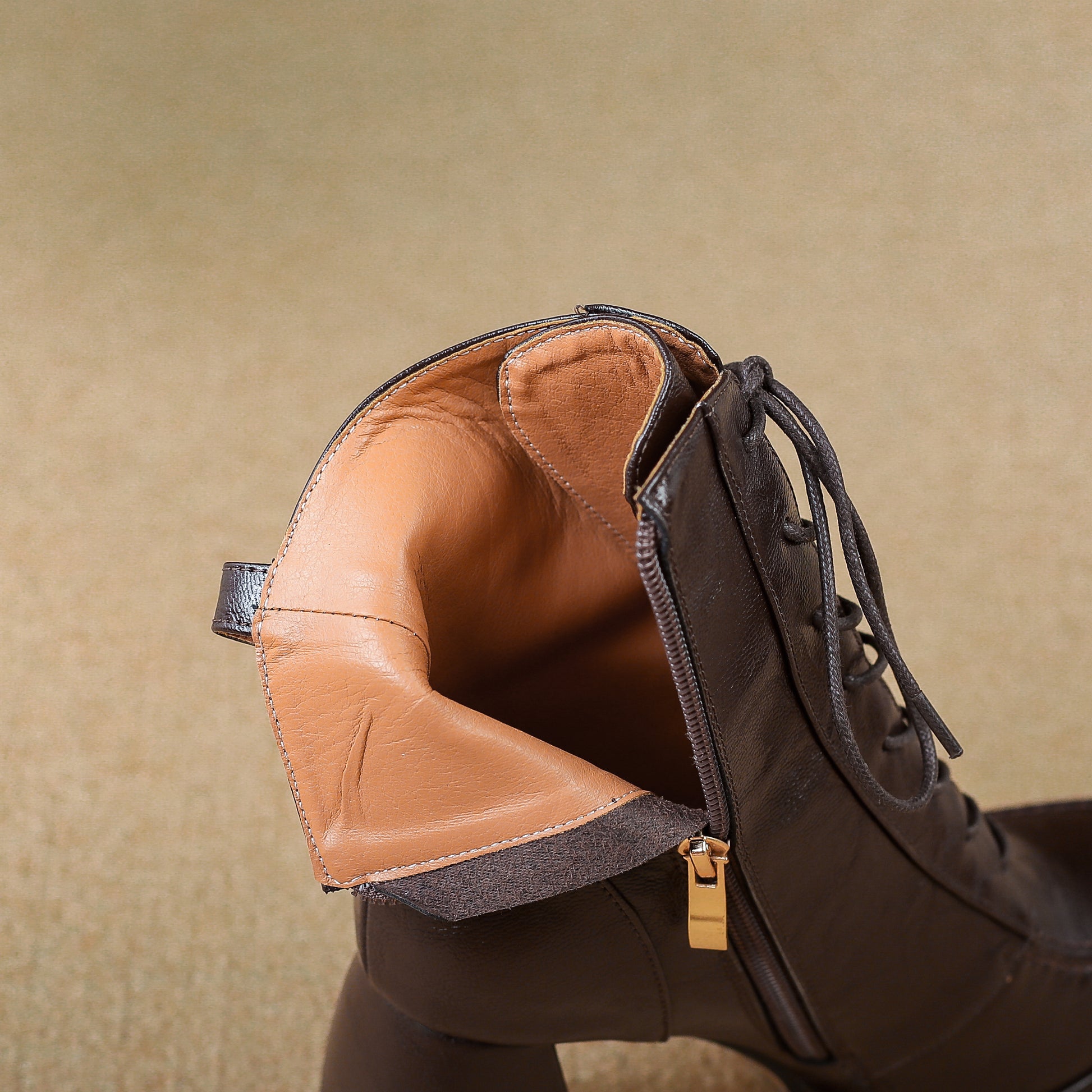 Ankle boots designed with square toe, self-tie, zipper, genuine leather and high heels can go with kinds of outfits