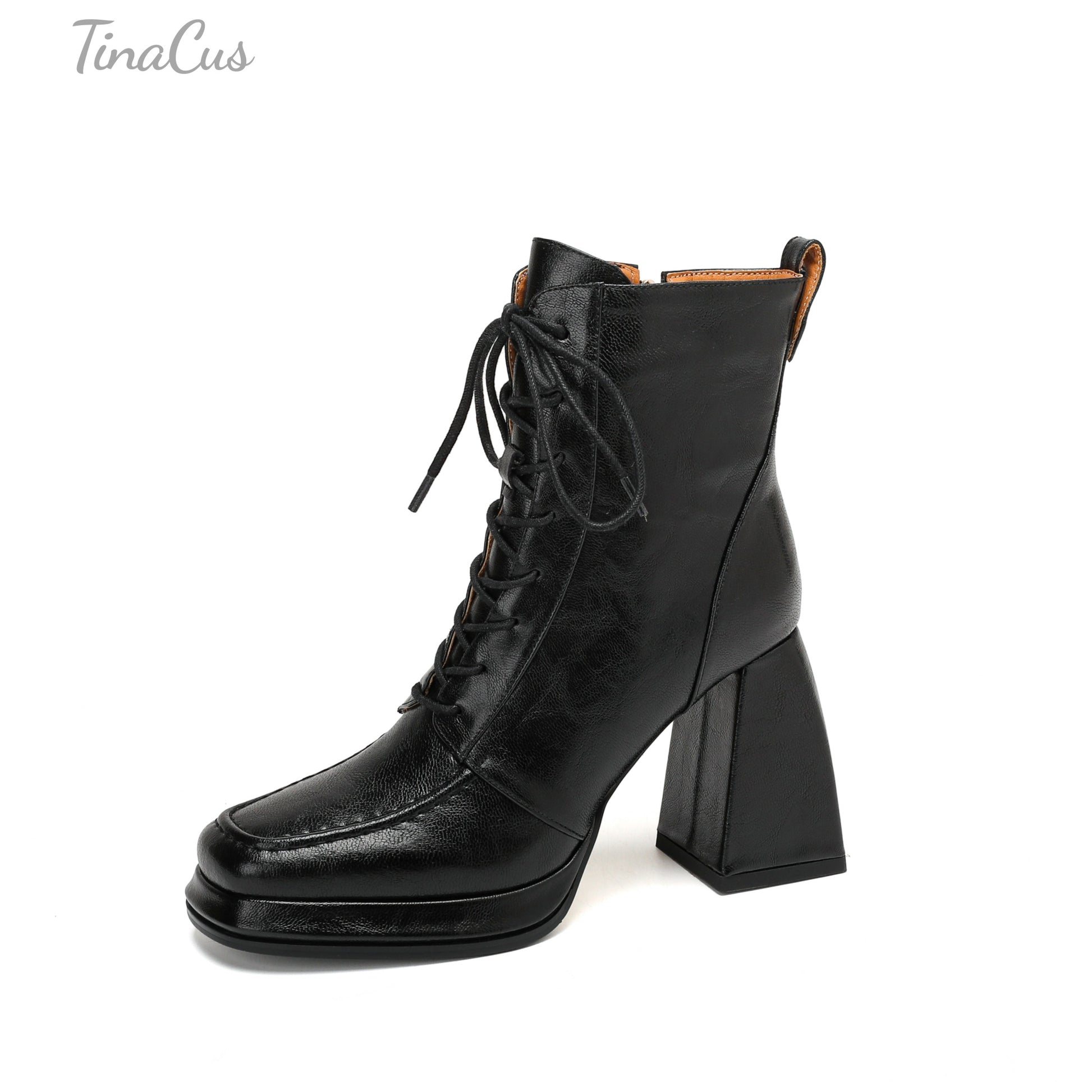 TinaCus Genuine Leather Lace/Zip up Short Boots Women's Square Toe Handmade Platform High Chunky Heels Booties