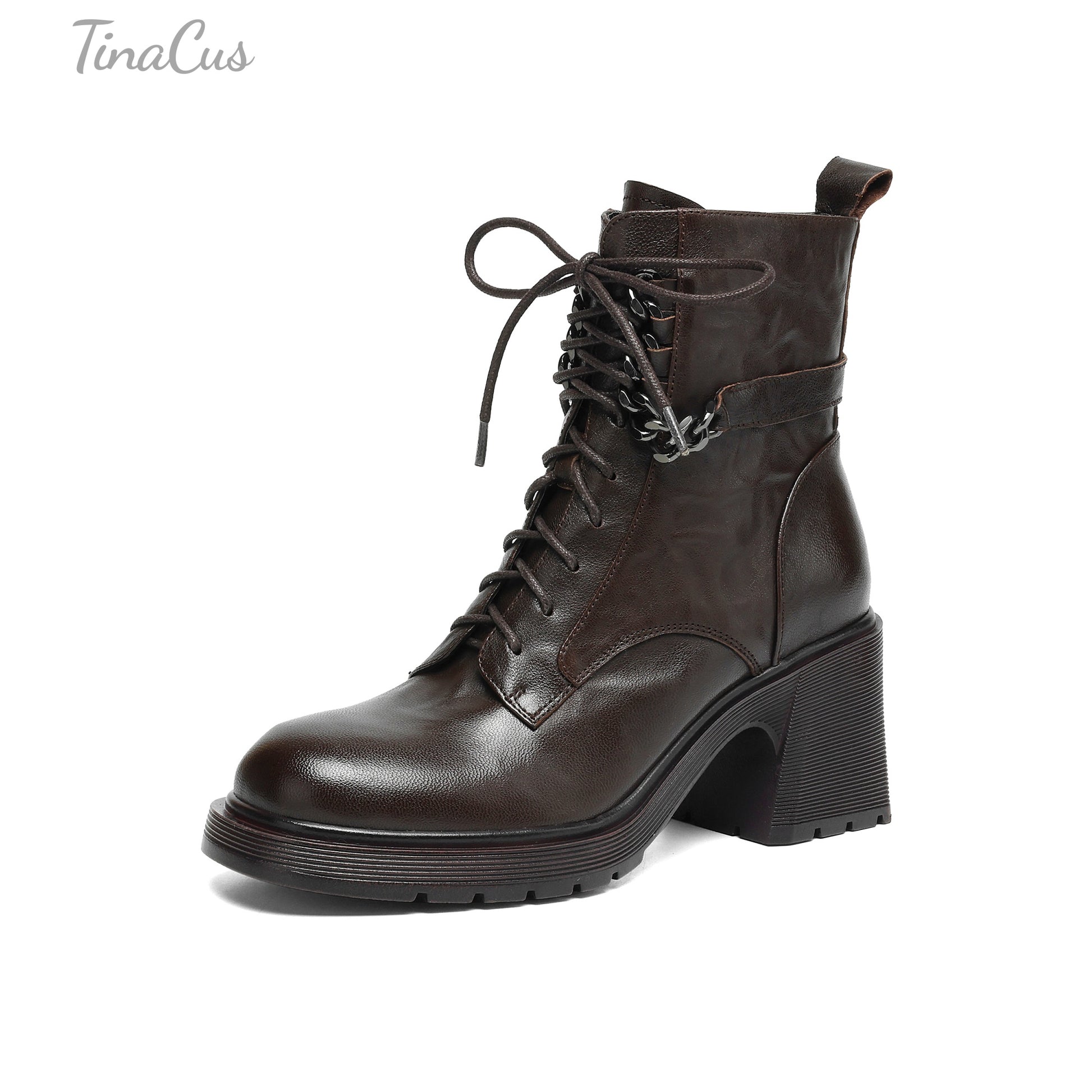 TinaCus Genuine Leather Women's Combat Boots Round Toe Handmade Chunky Heels Lace/Zip up Booties