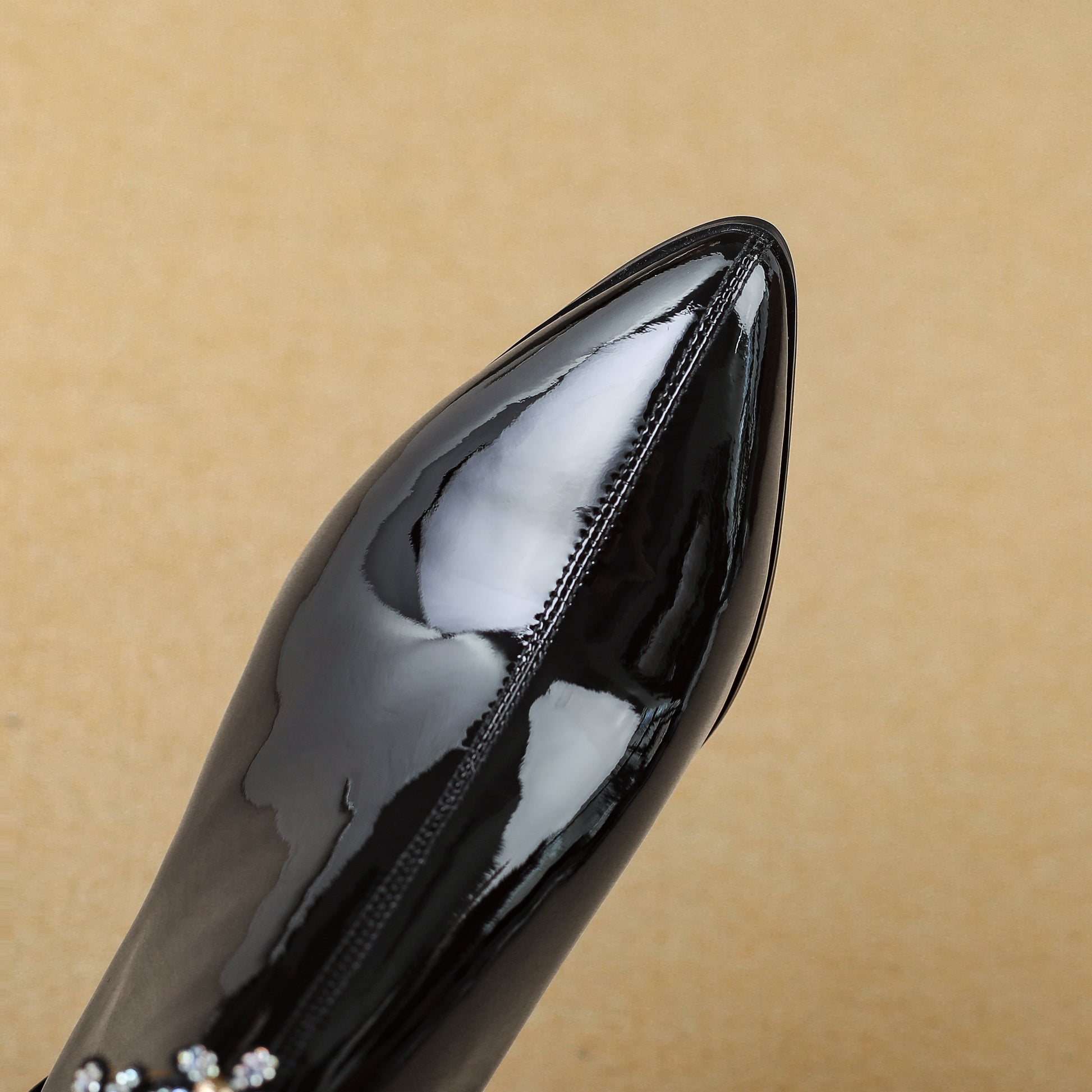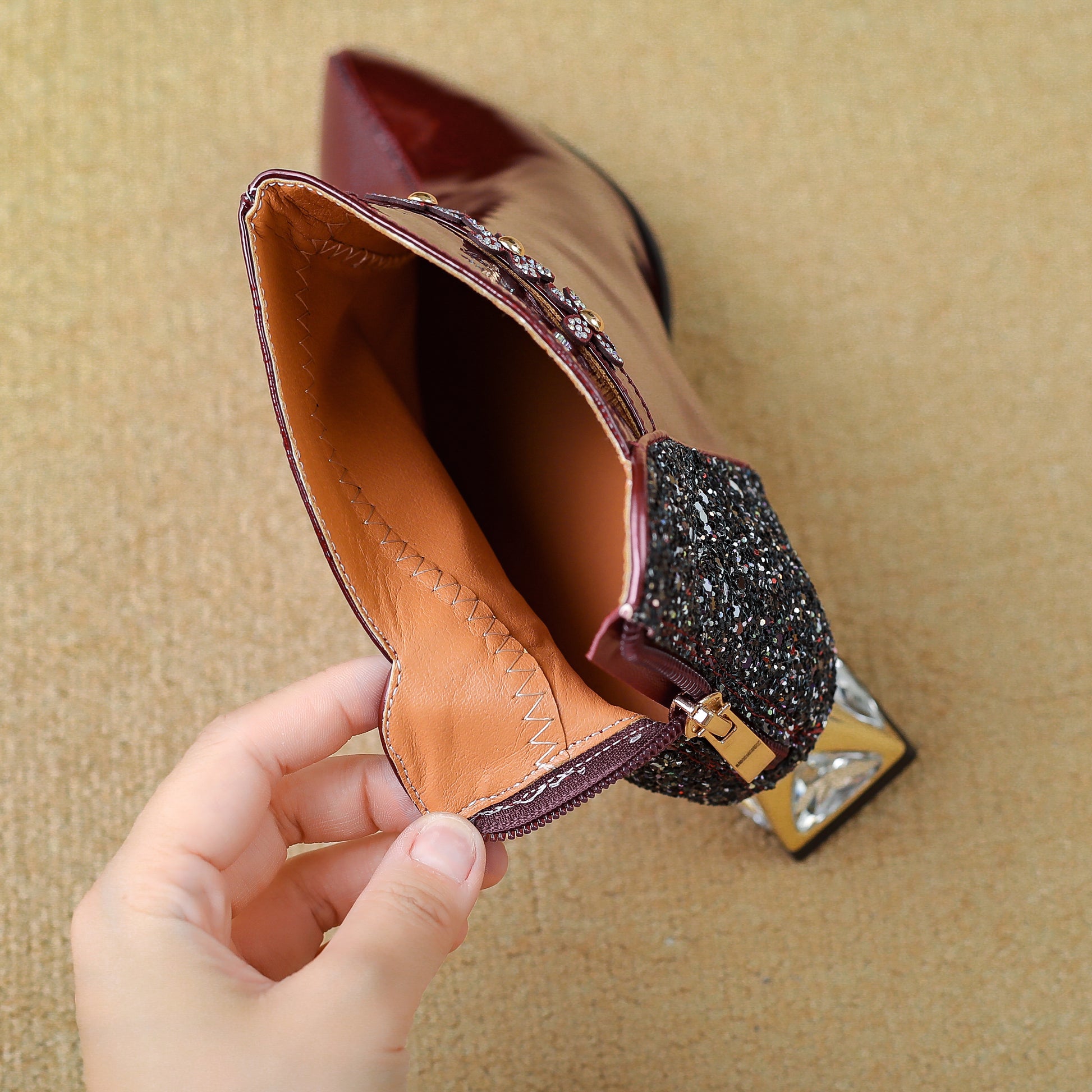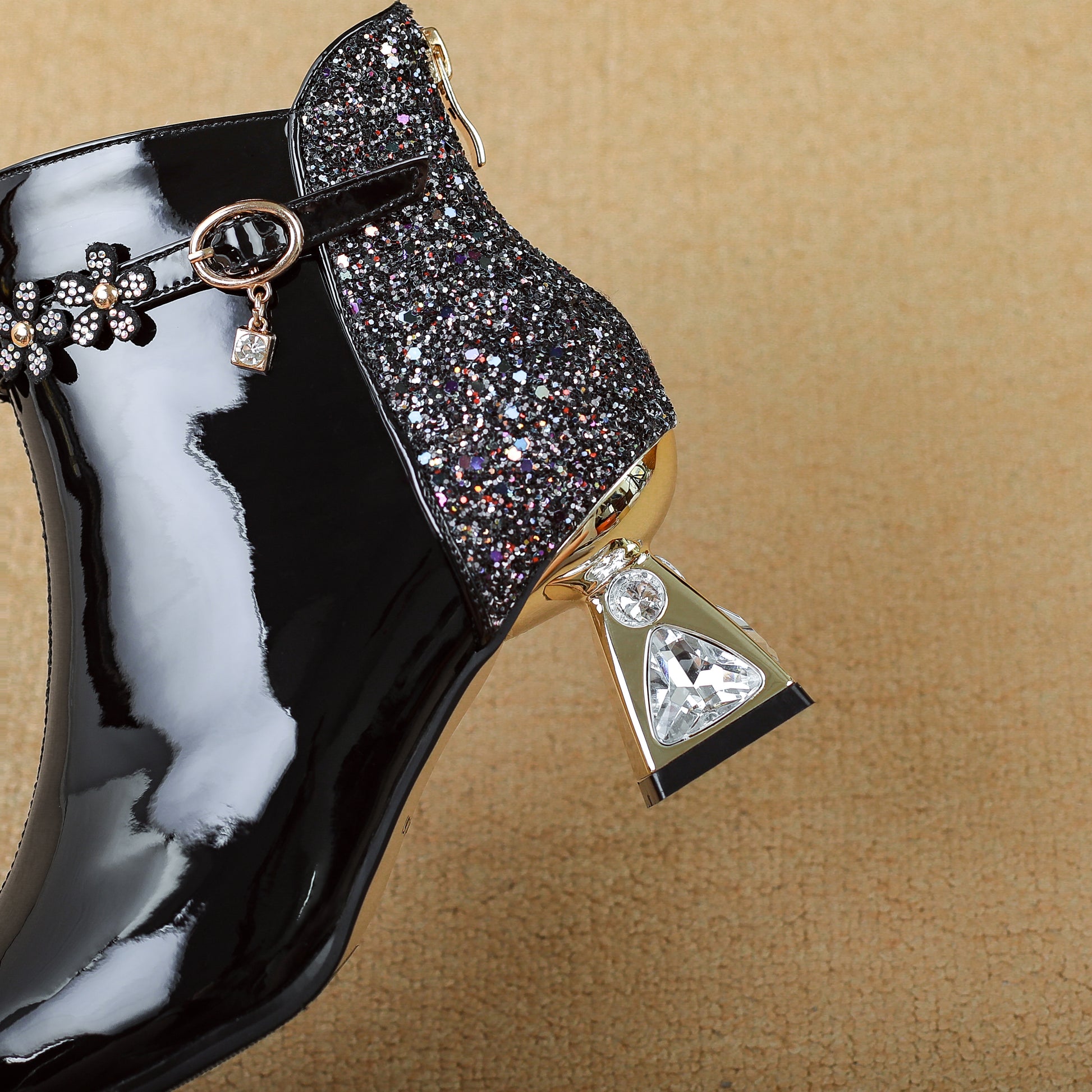 Ankle boots designed with pointed toe, flowers, zipper, genuine leather and mid heels can go with kinds of outfits