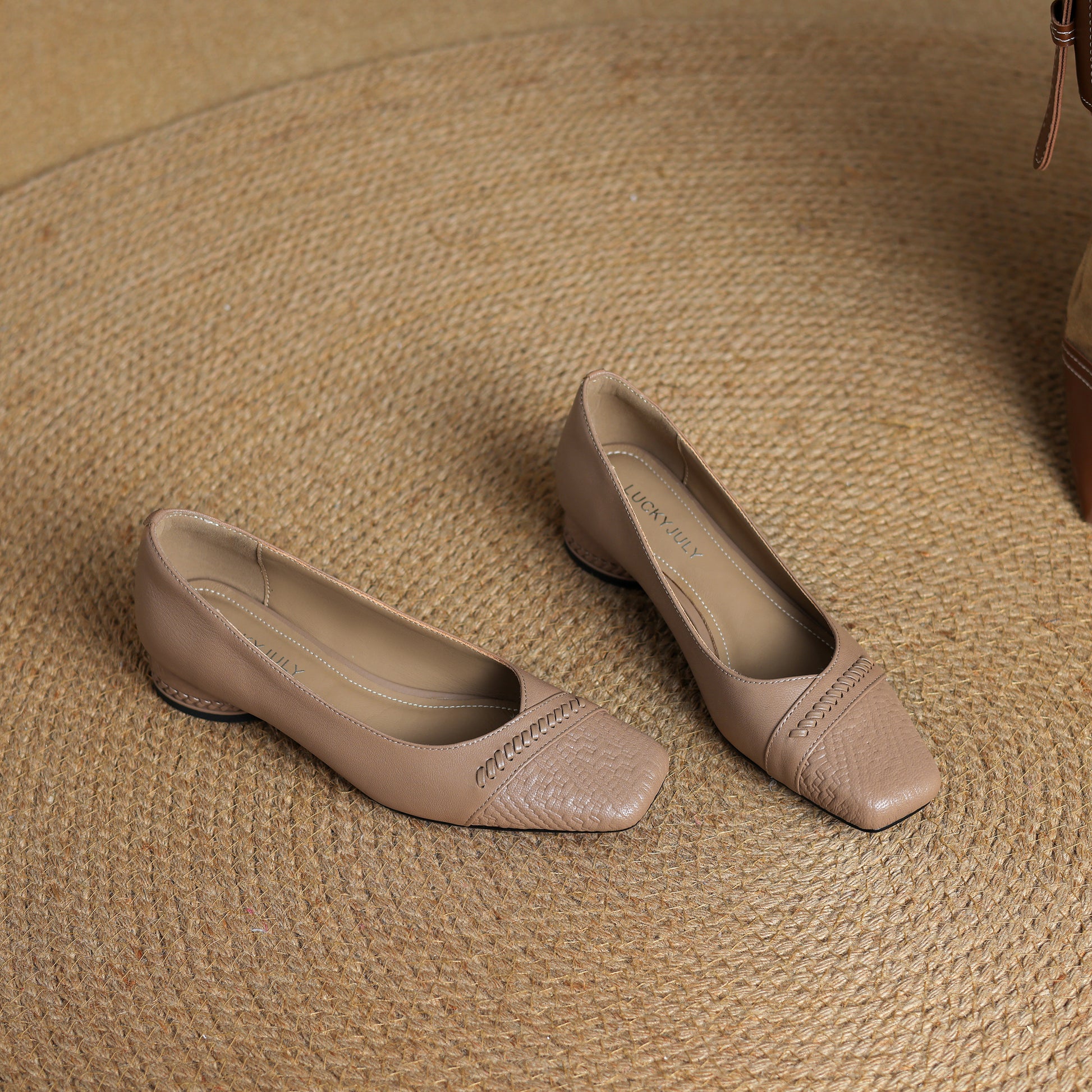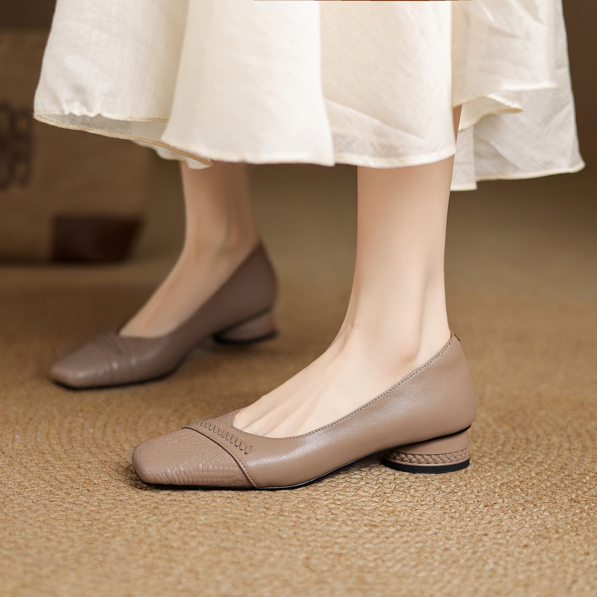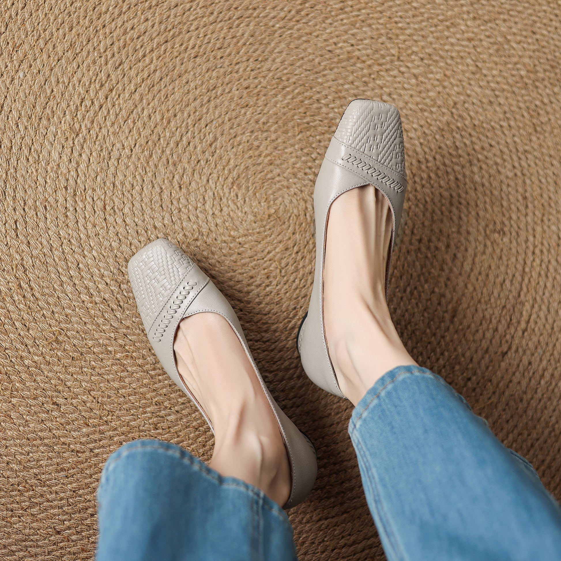 TinaCus Handmade Women's Genuine Leather Square Toe Stitching Chunky Heel Ballet Pump Shoes