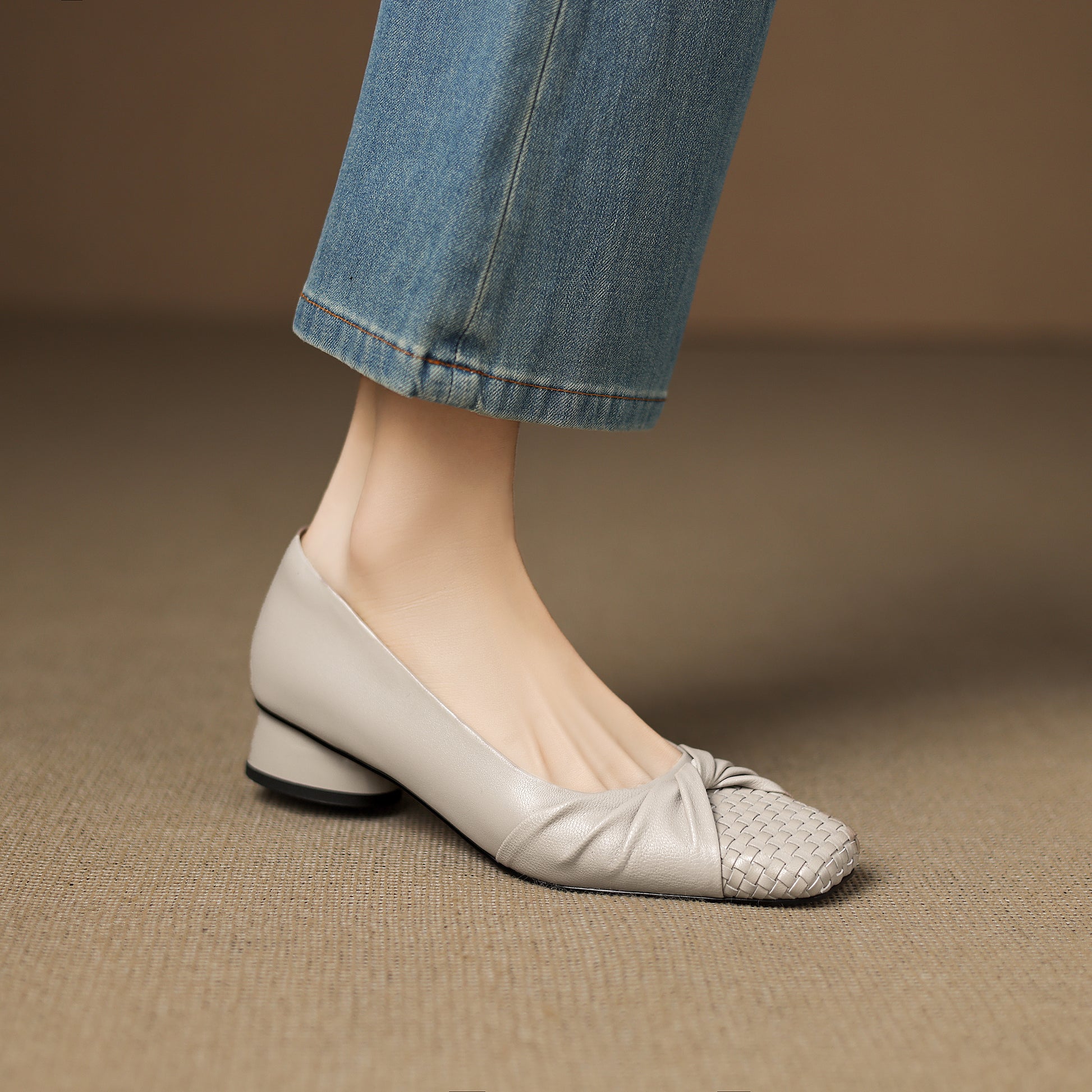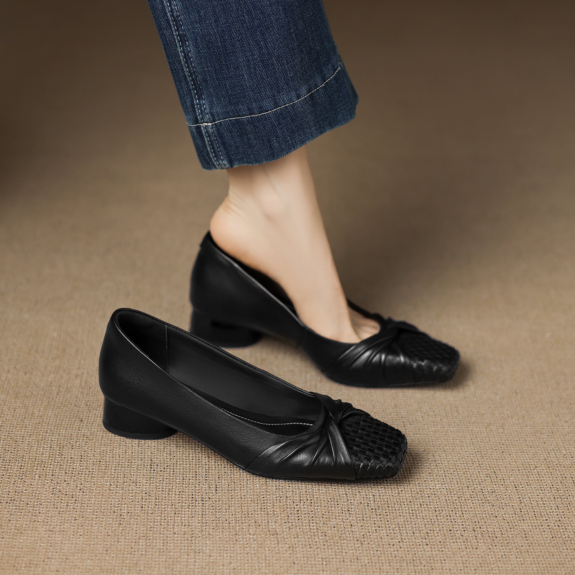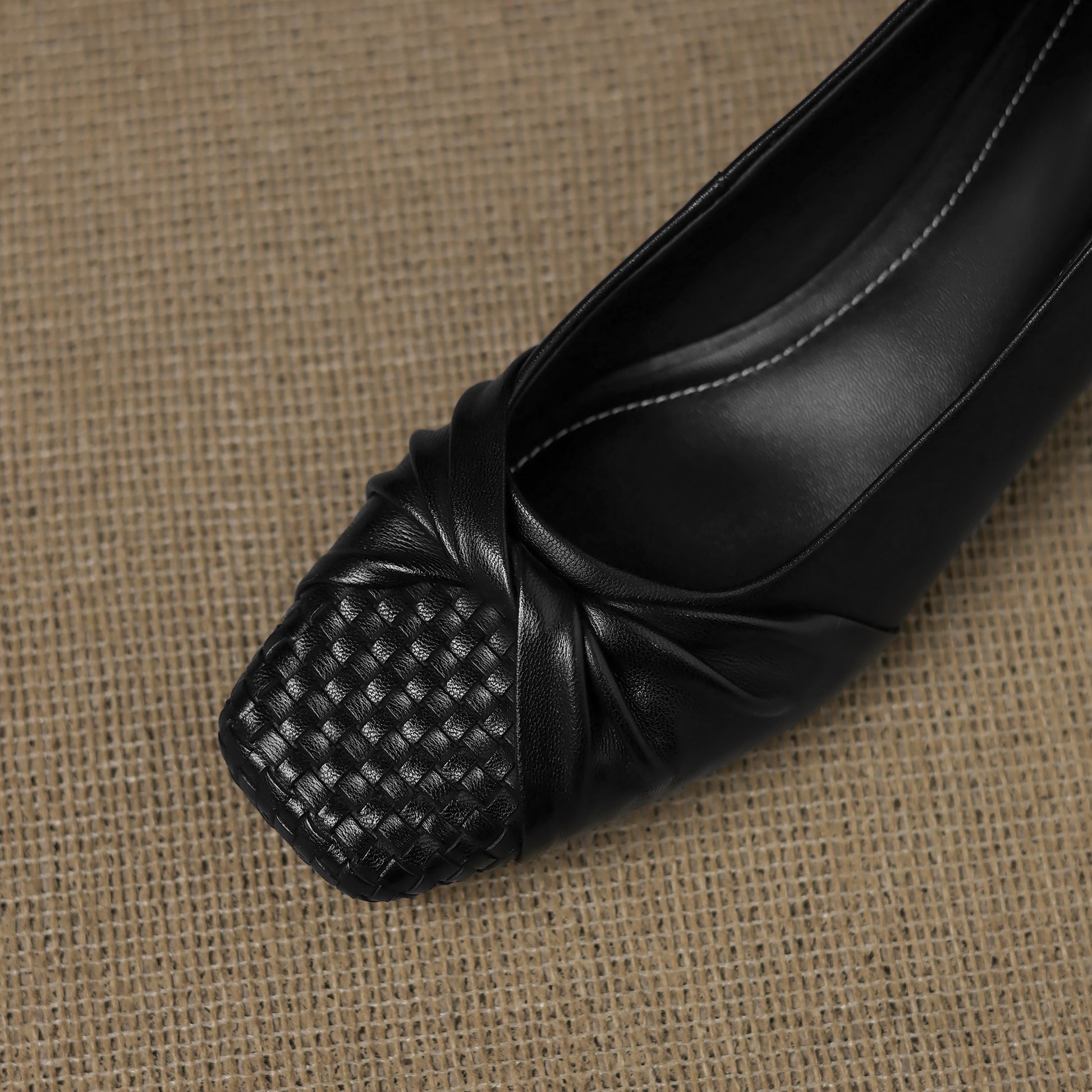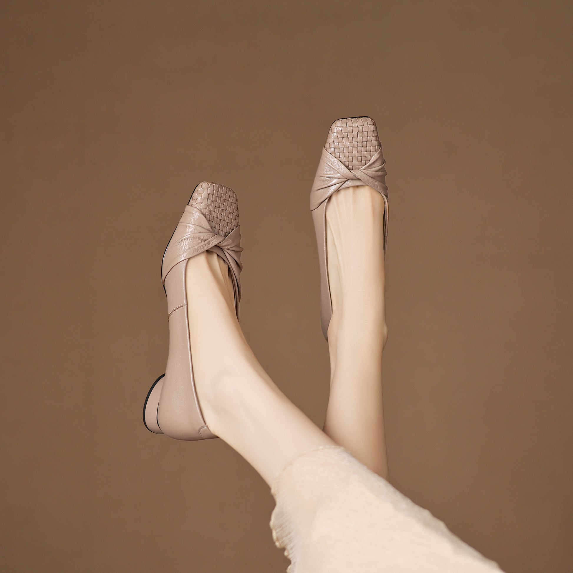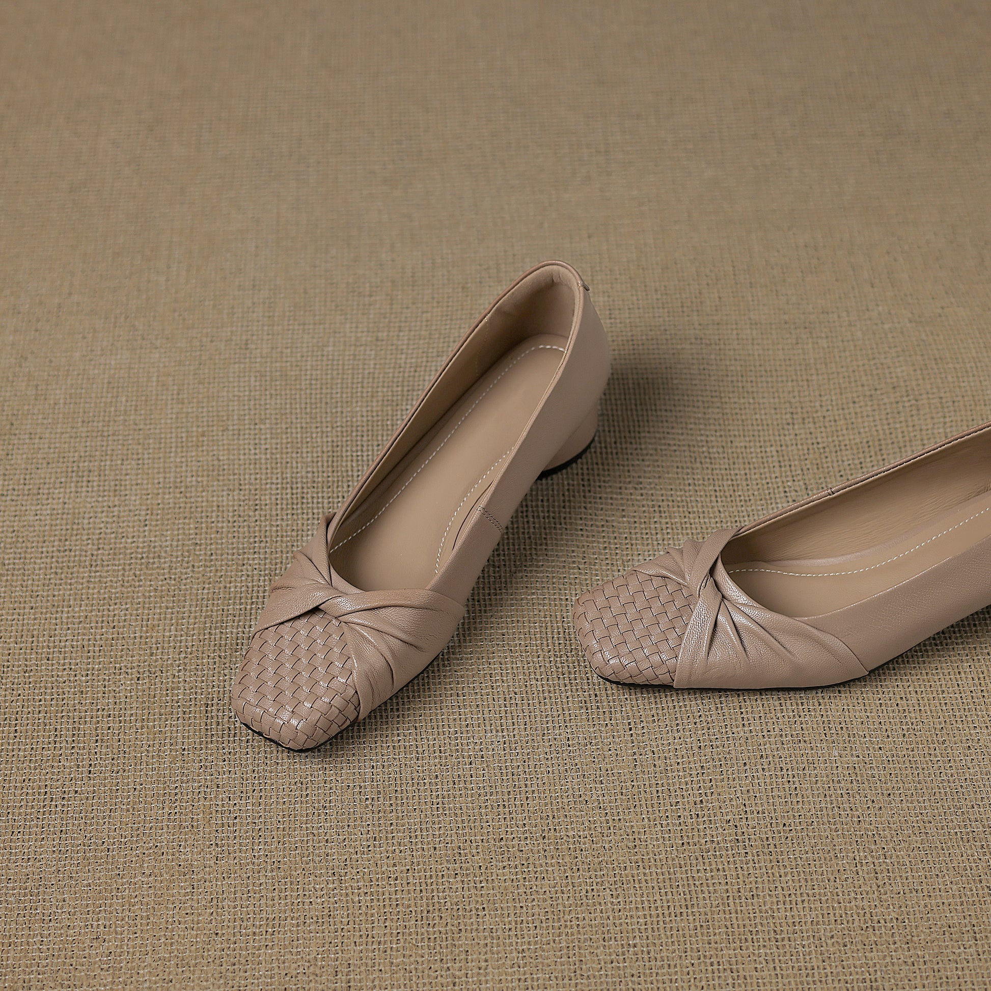 TinaCus Handmade Women's Genuine Leather Square Toe Woven Twist Knot Chunky Heel Casual Slip On Pump Shoes