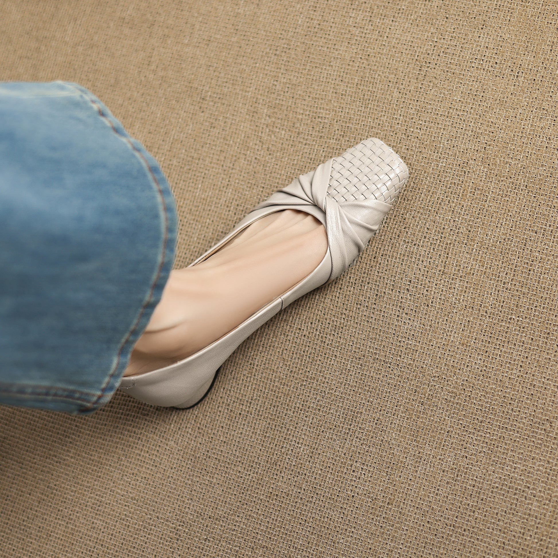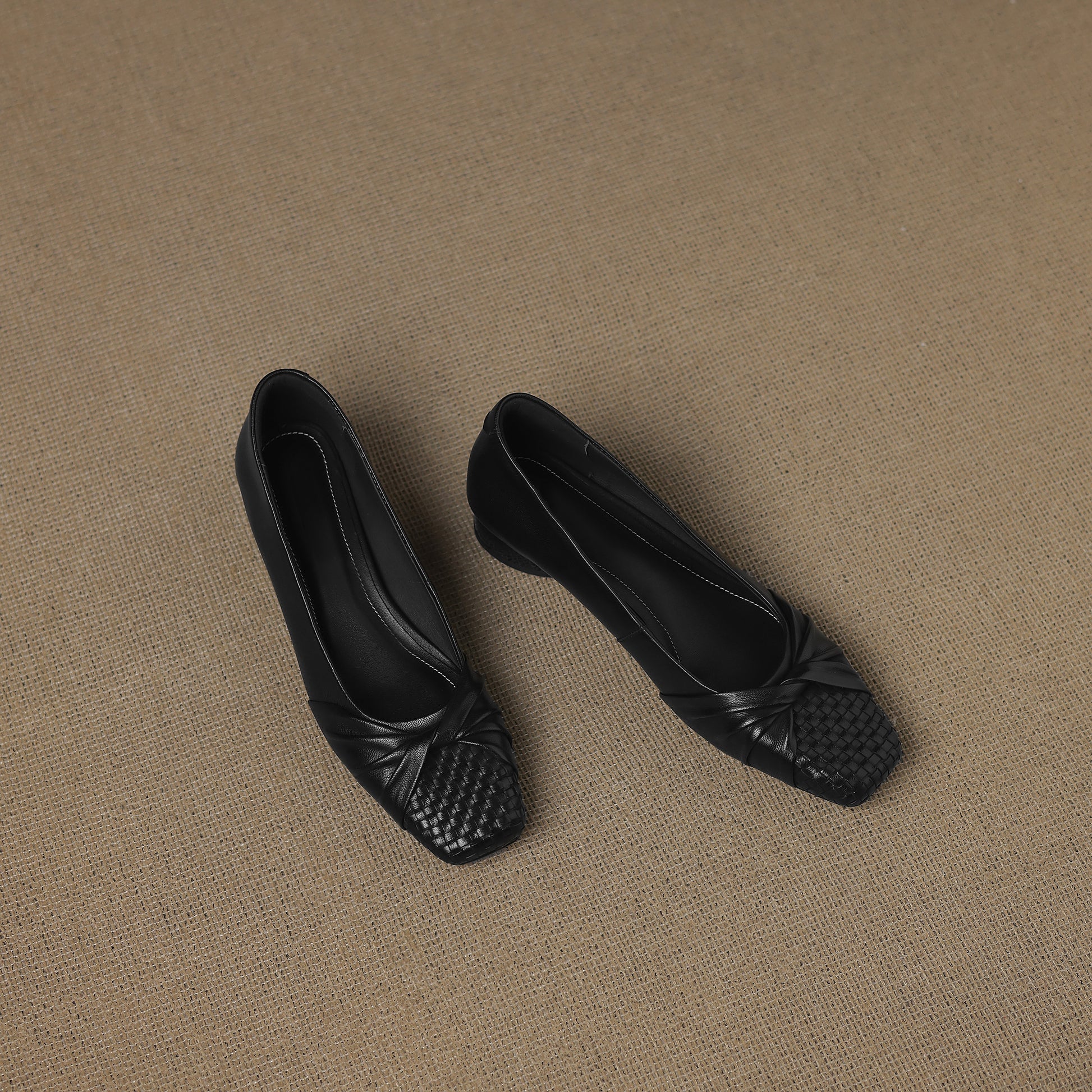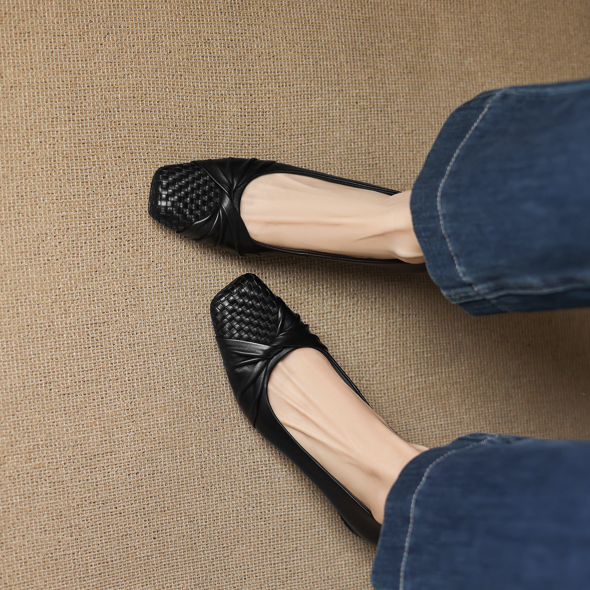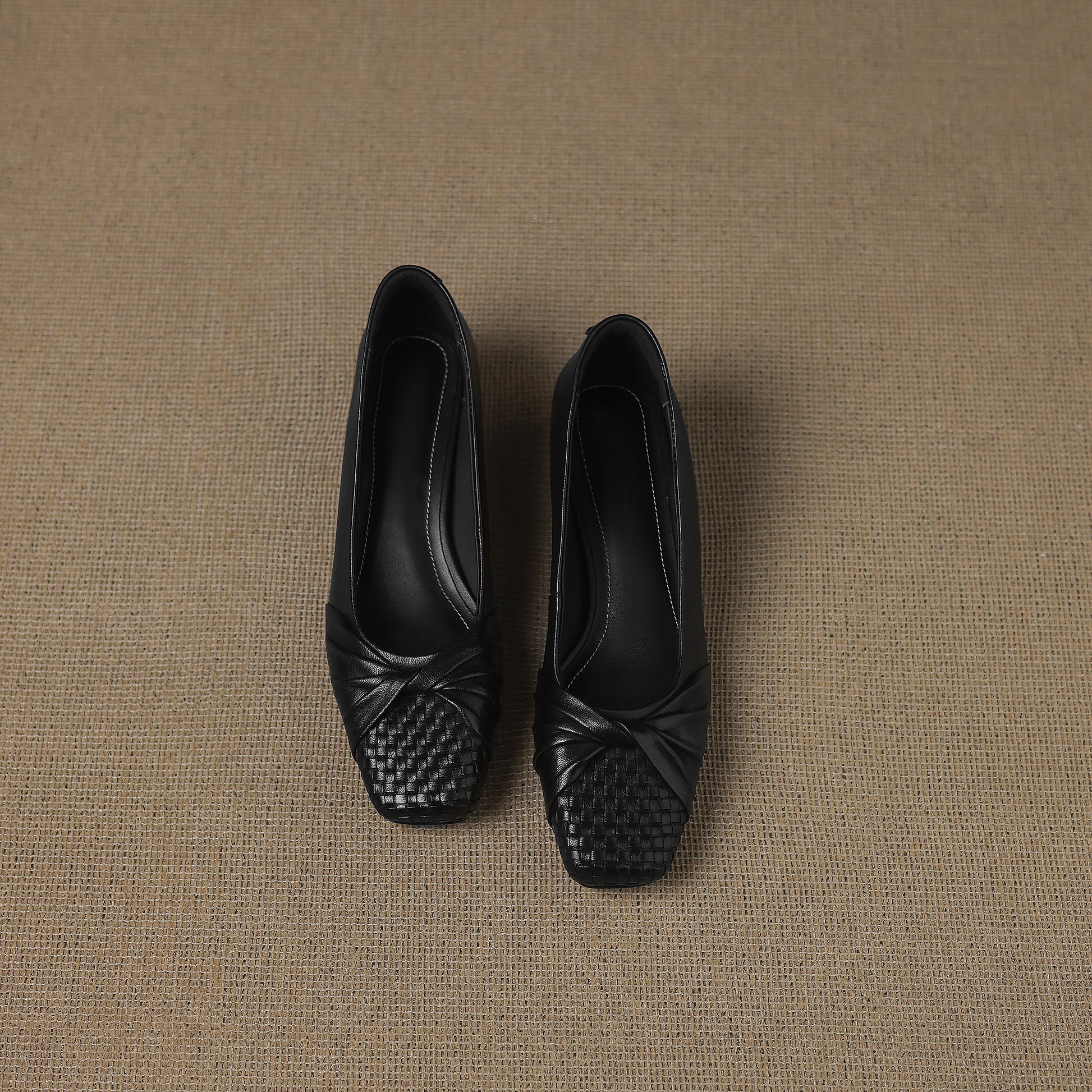 TinaCus Handmade Women's Genuine Leather Square Toe Woven Twist Knot Chunky Heel Casual Slip On Pump Shoes