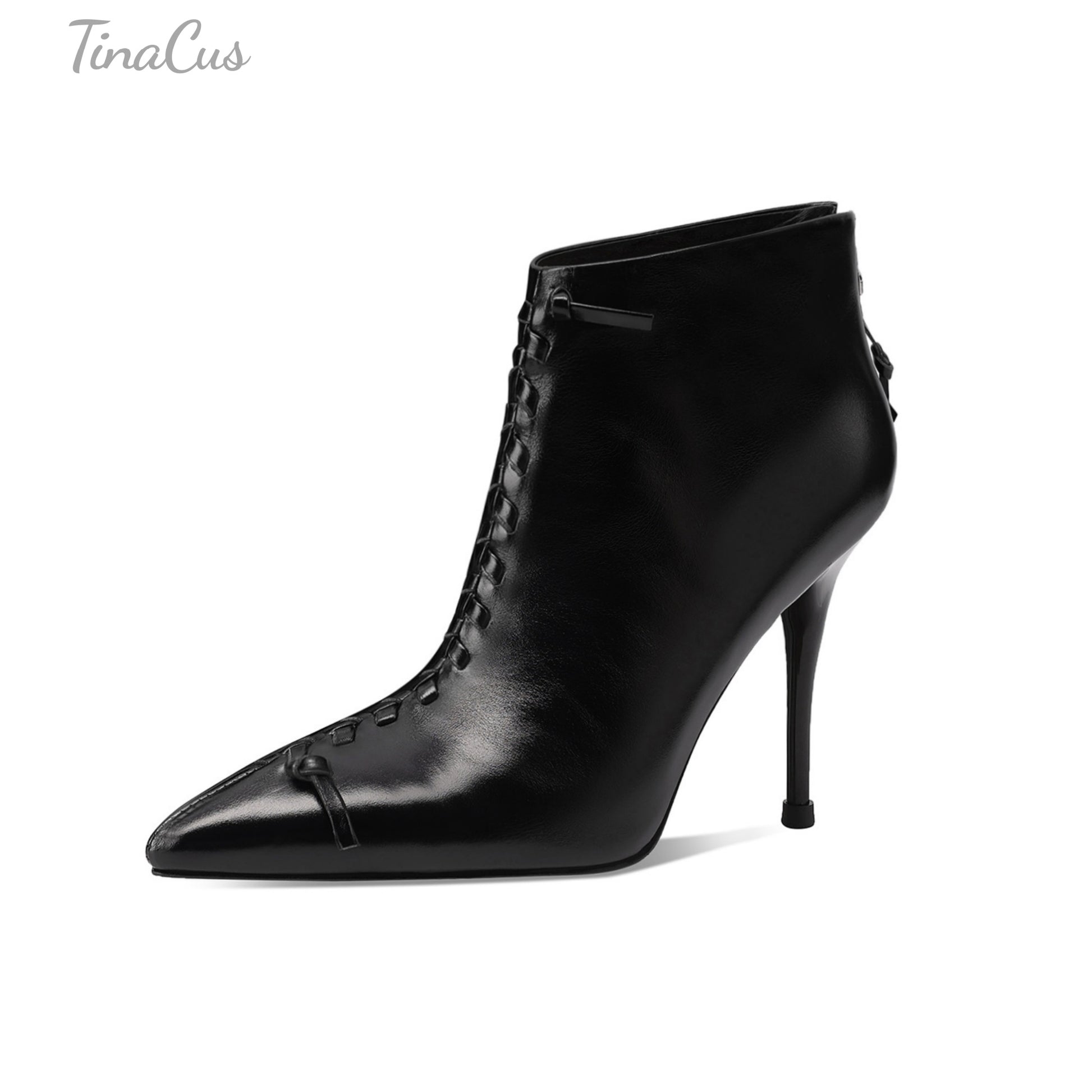 TinaCus Stiletto Heels Ankle Boots Women's Pointed Toe Genuine Leather Handmade Back Zipper Elegant Booties