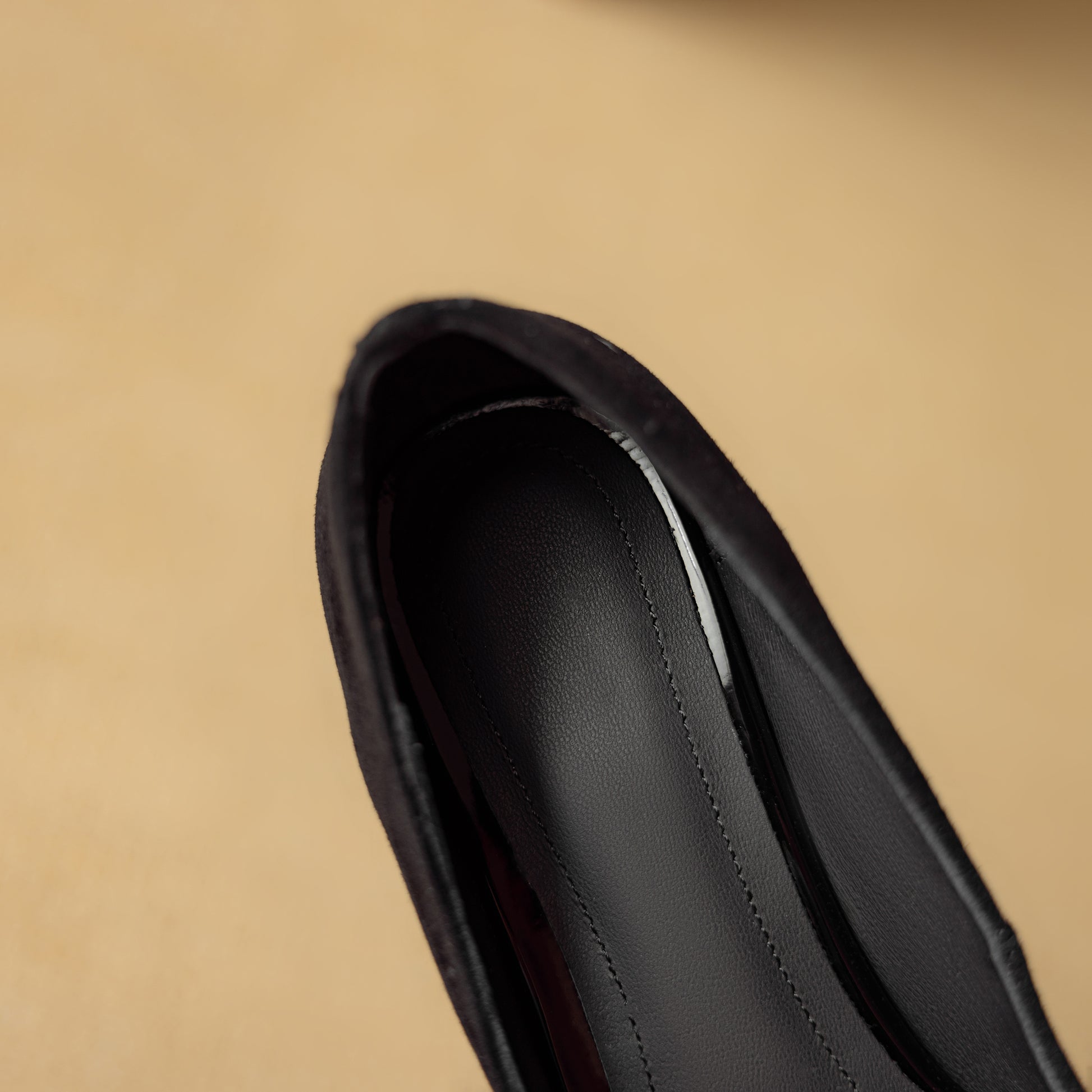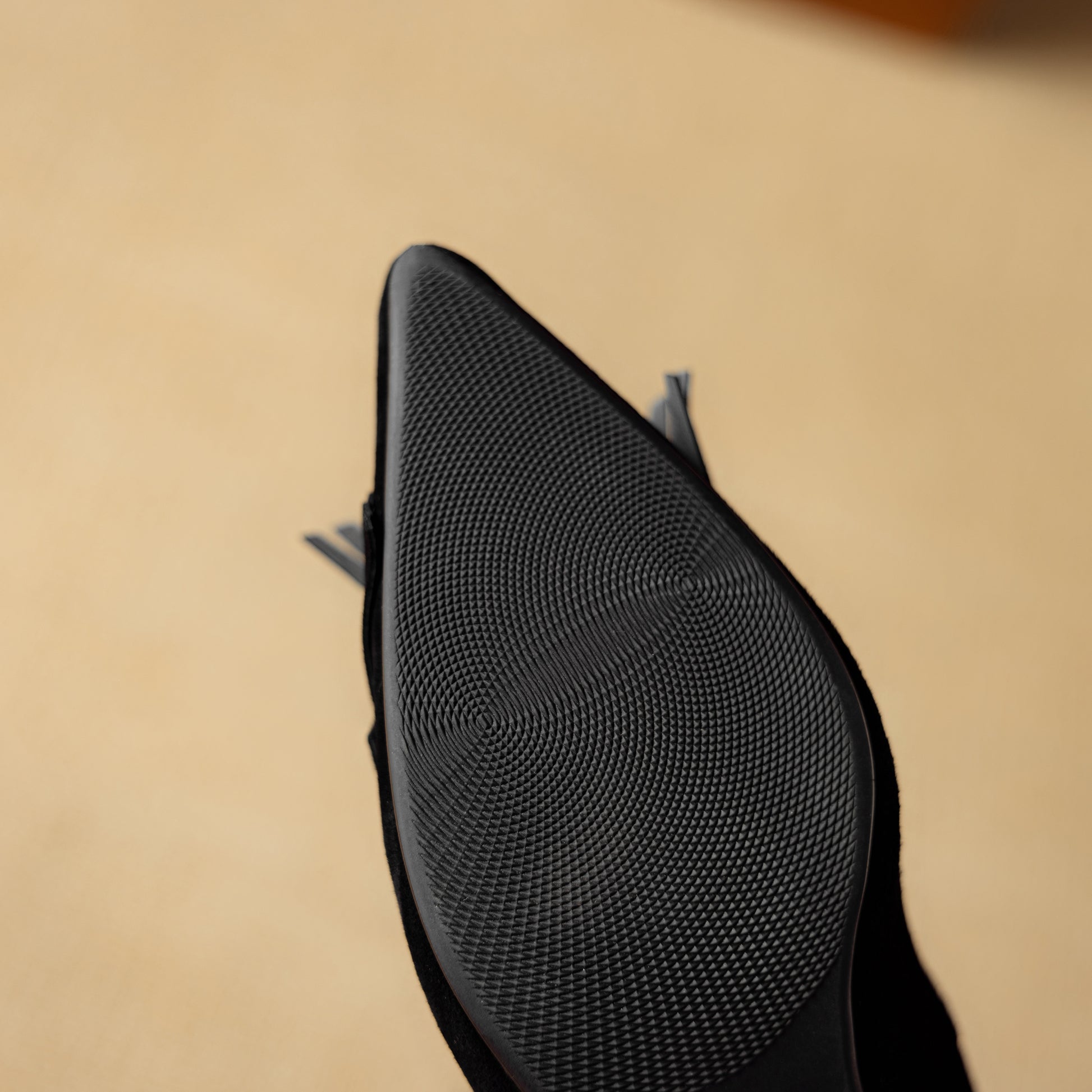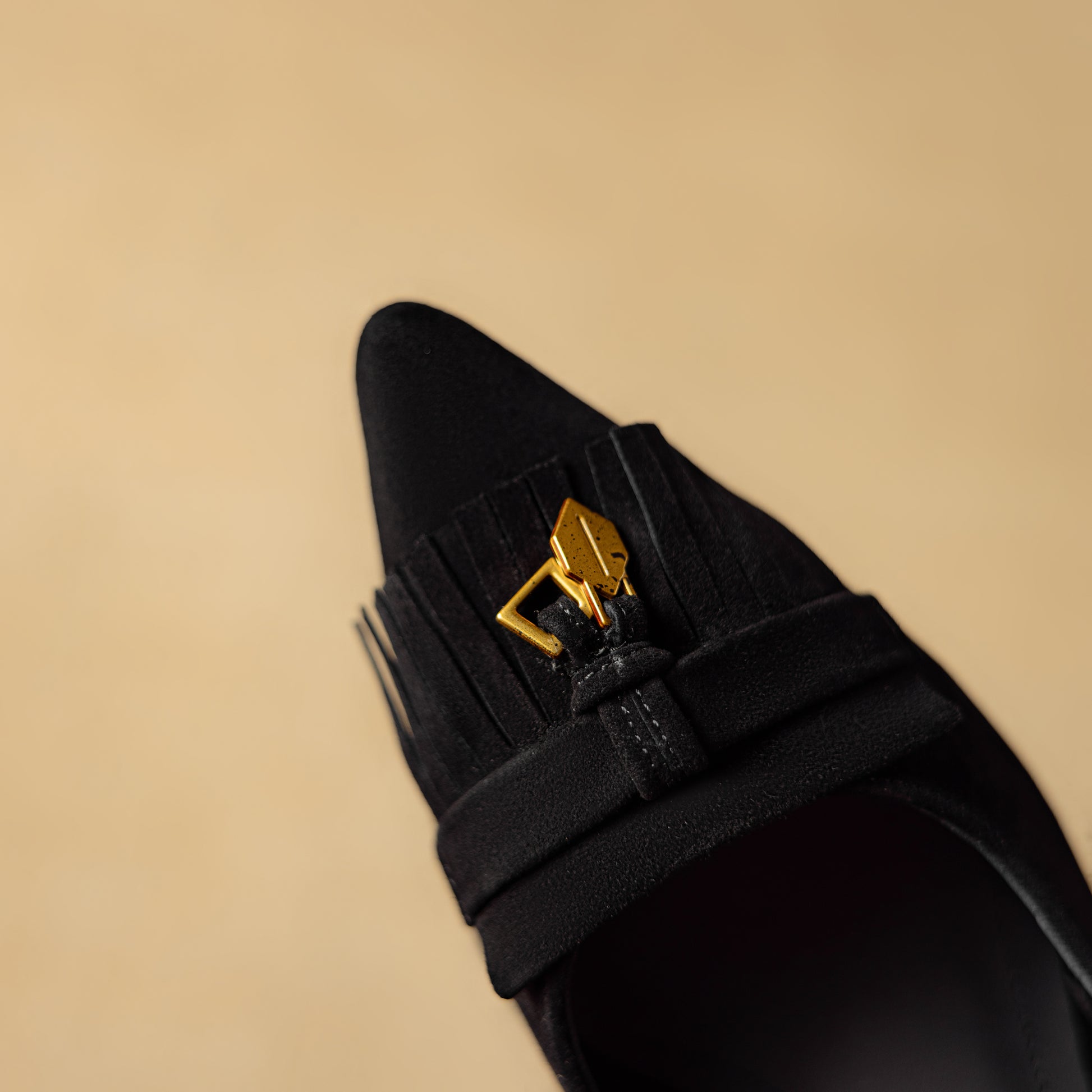 Chic pumps shoes designed with suede leather, pointed toe, tassels and low heels to keep up with fashion trend