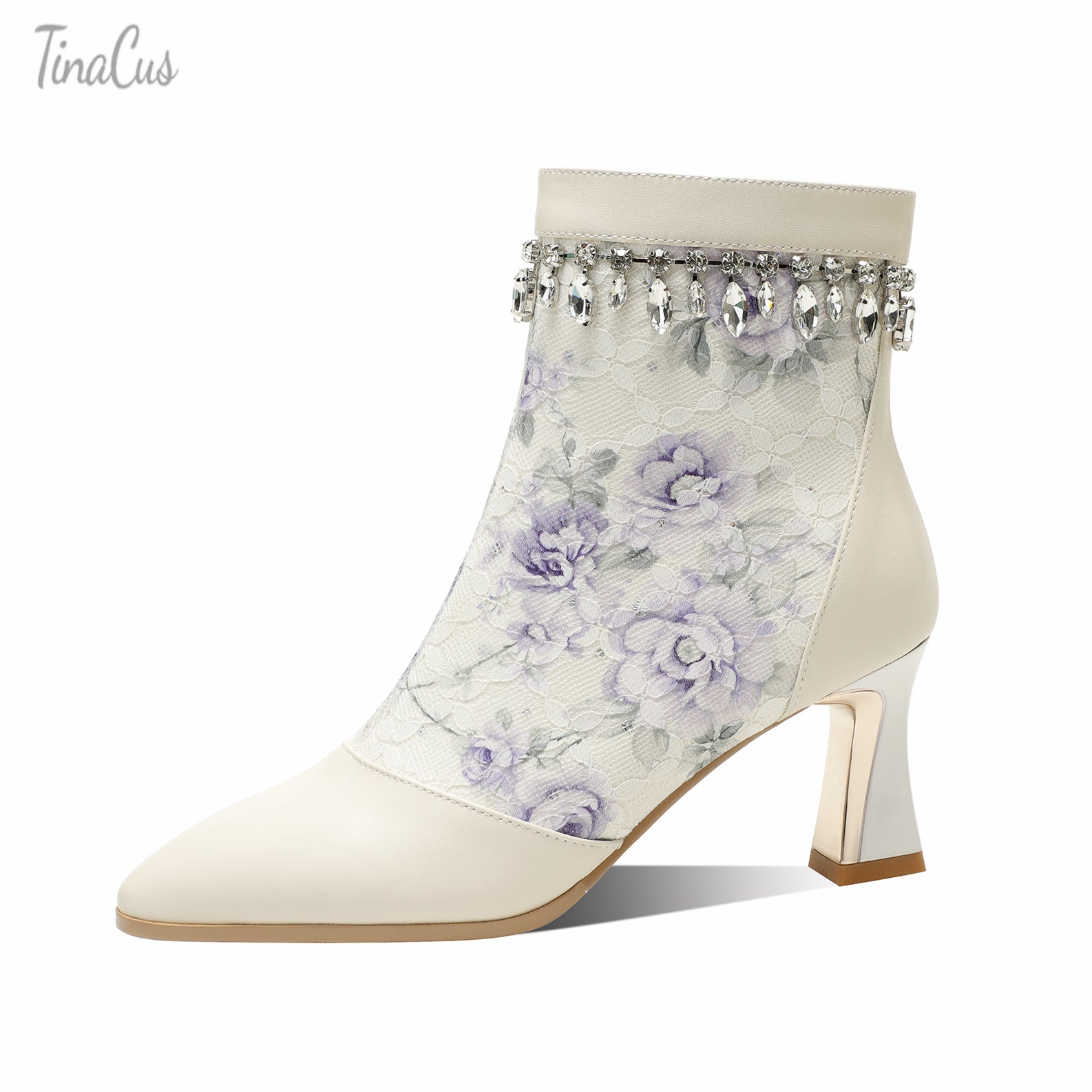 TinaCus Women's Flower Crystals Embroidery Genuine Leather Handmade Side Zip Pointed Toe Ankle Boots