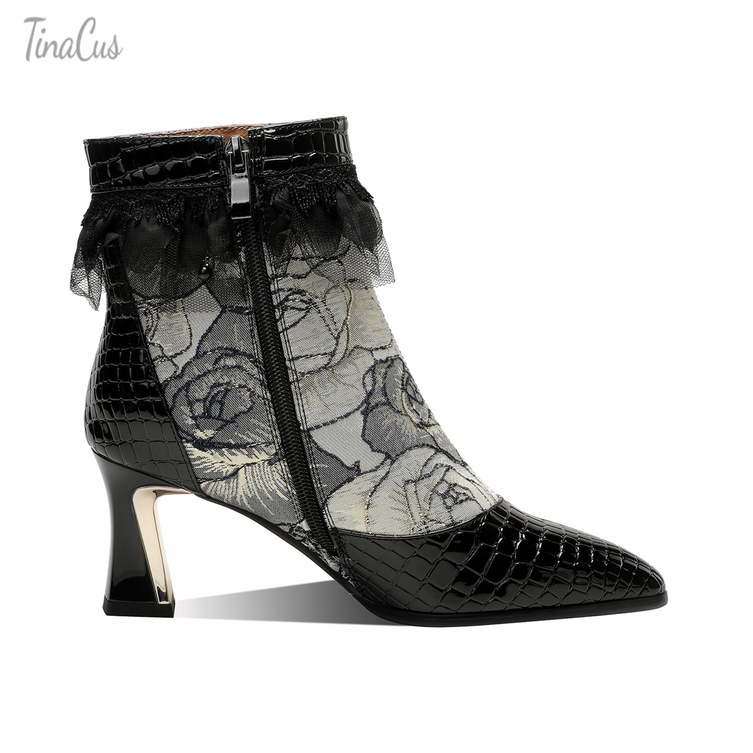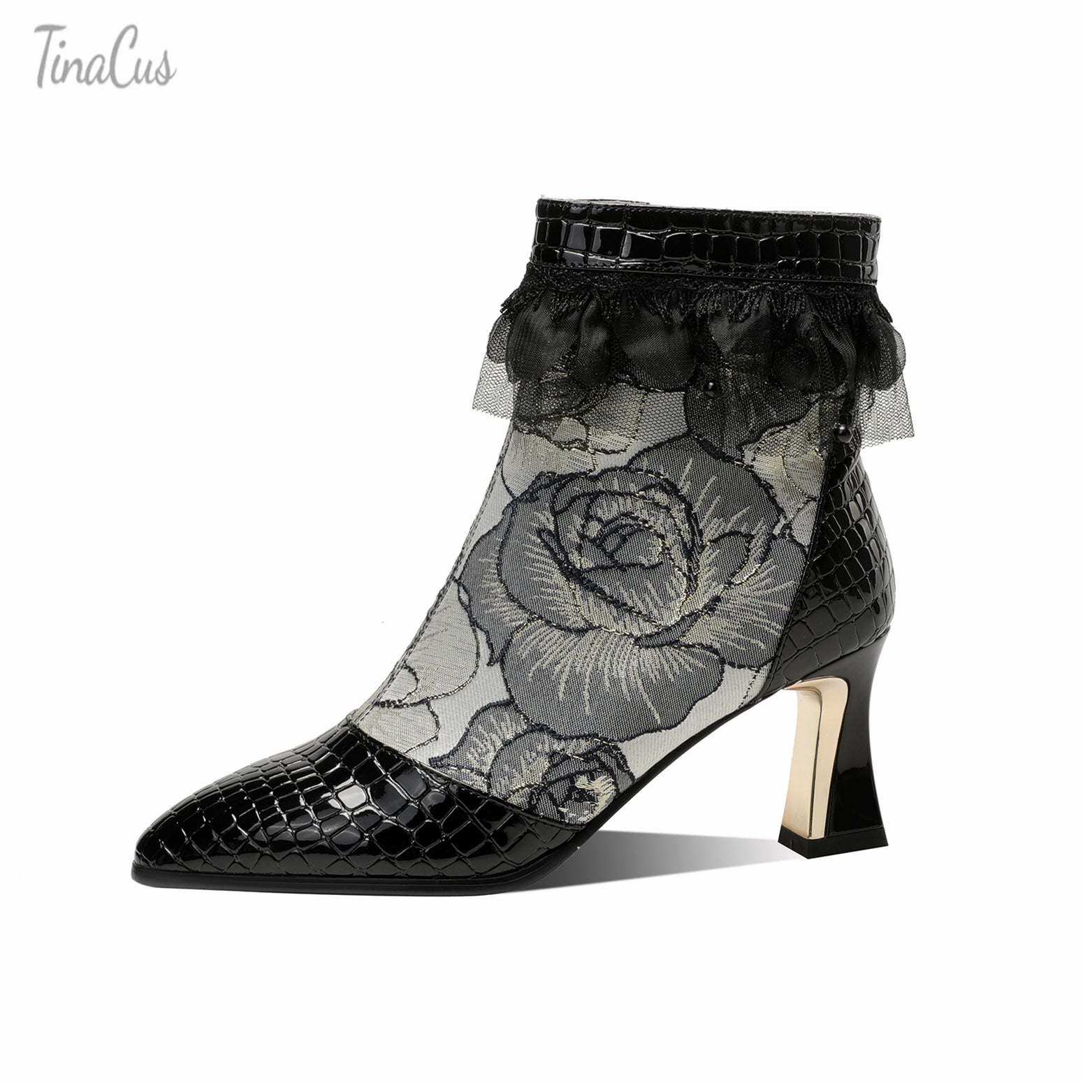 TinaCus Women's Genuine Leather Embroidery Flowers Lace Mid Heel Handmade Side Zip Ankle Boots
