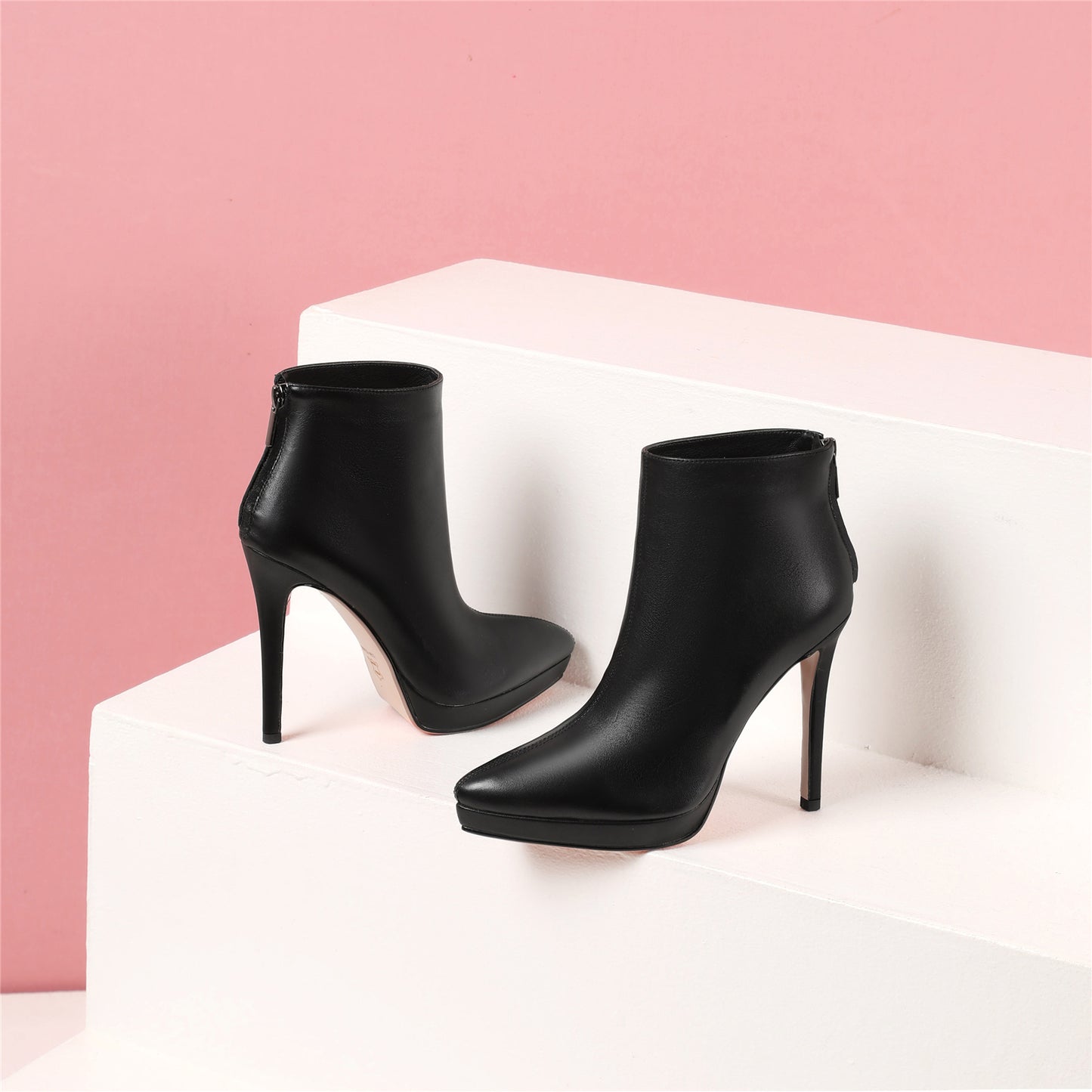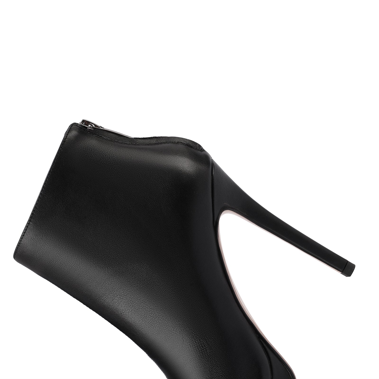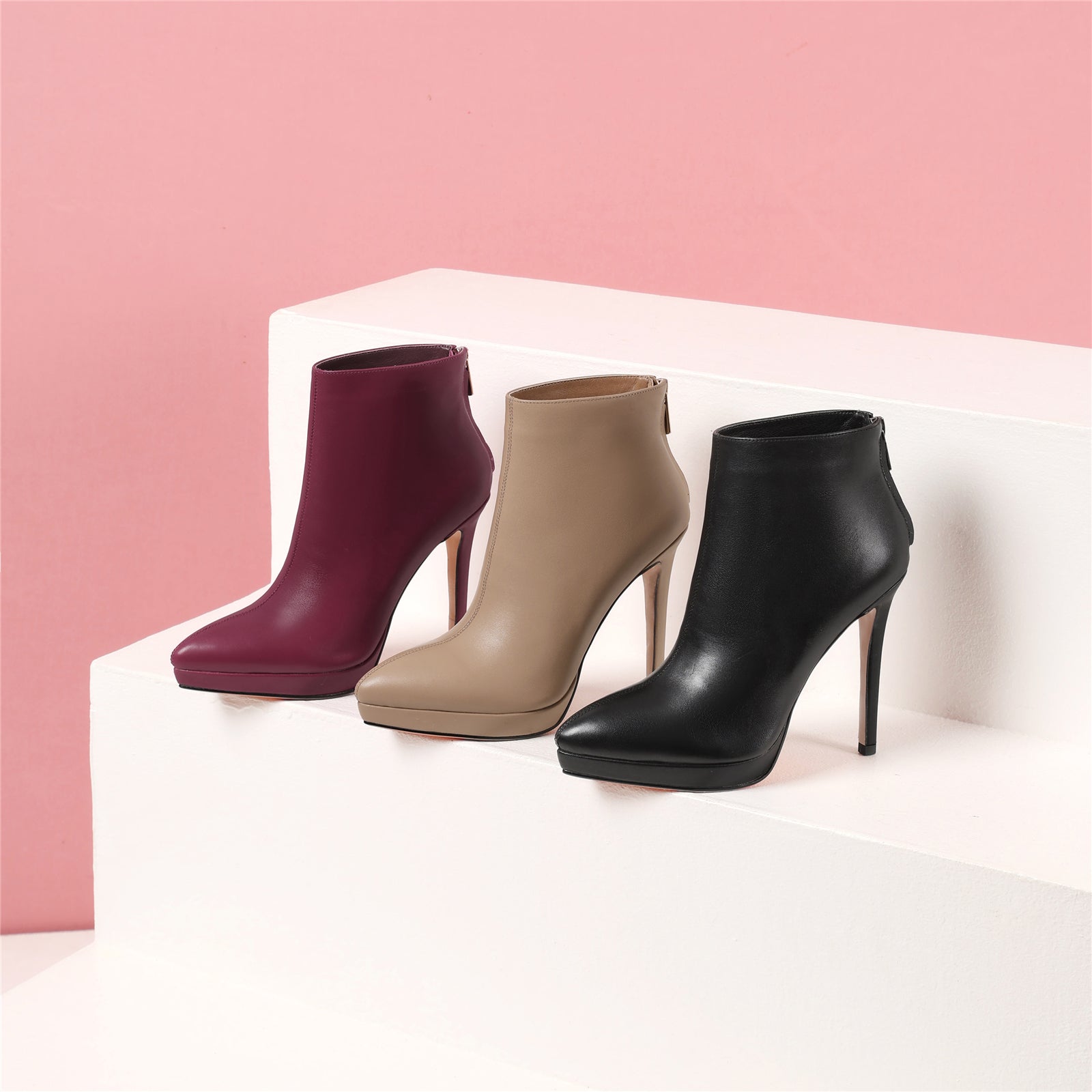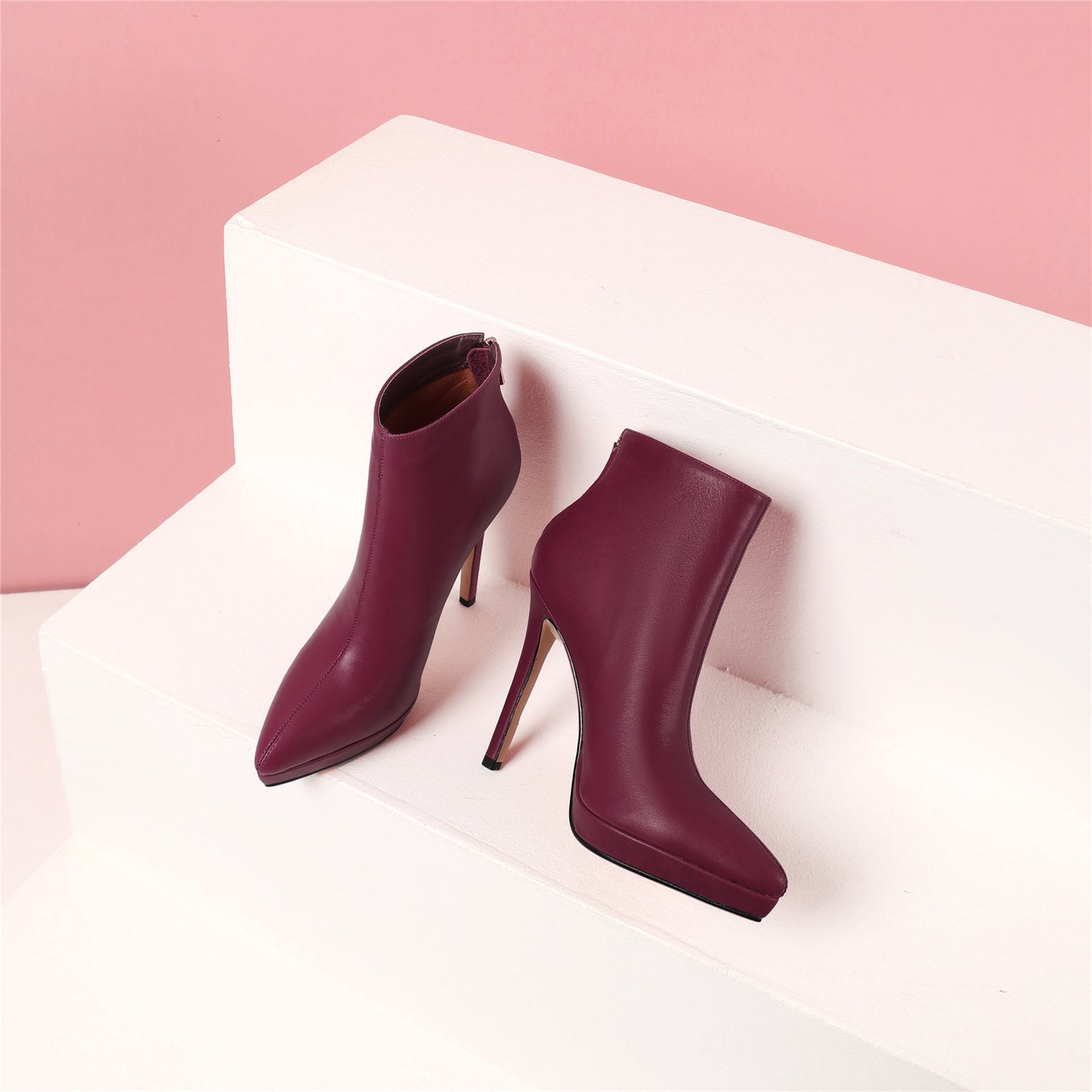 Ankle boots are designed with pointed toe, genuine leather, zip and stiletto heel.