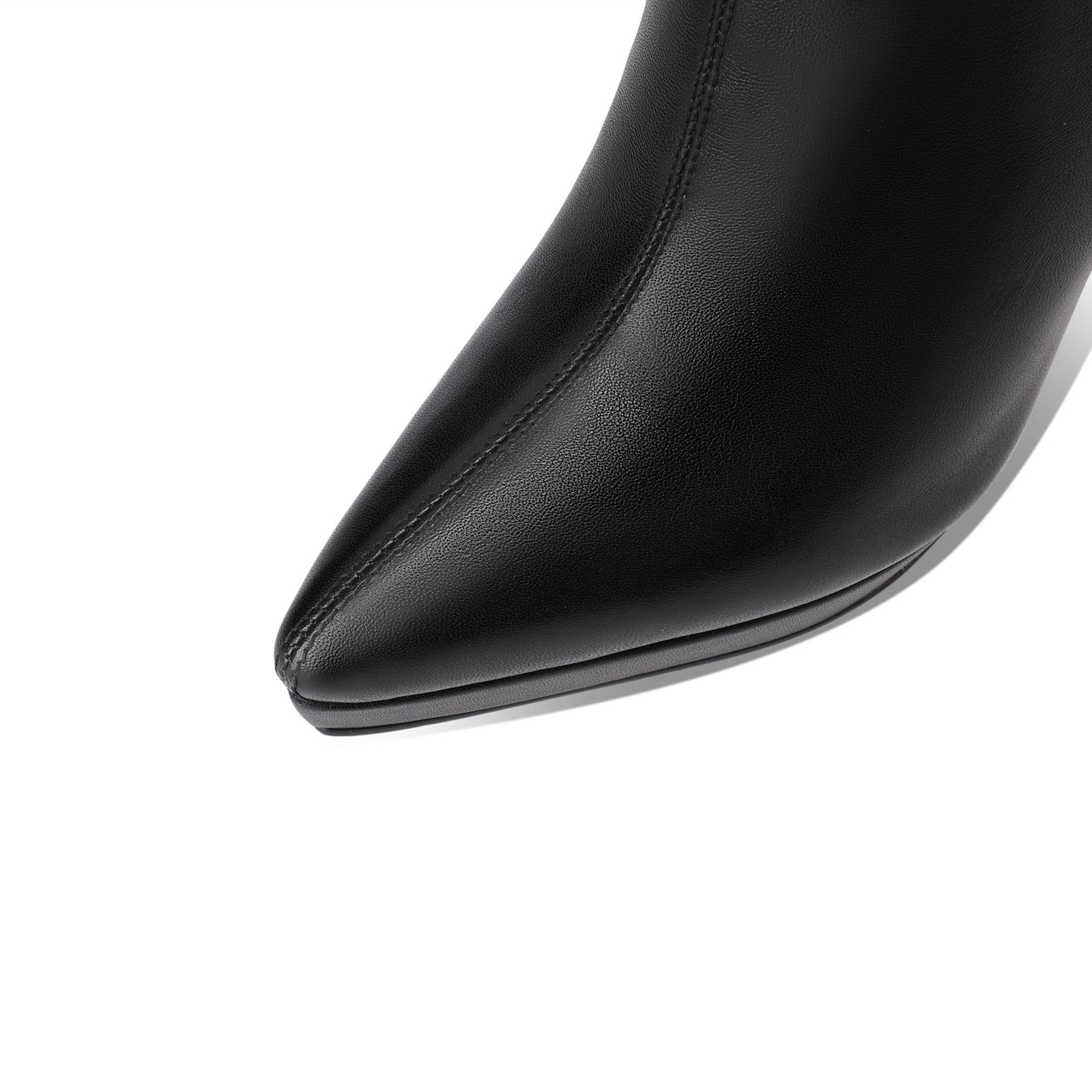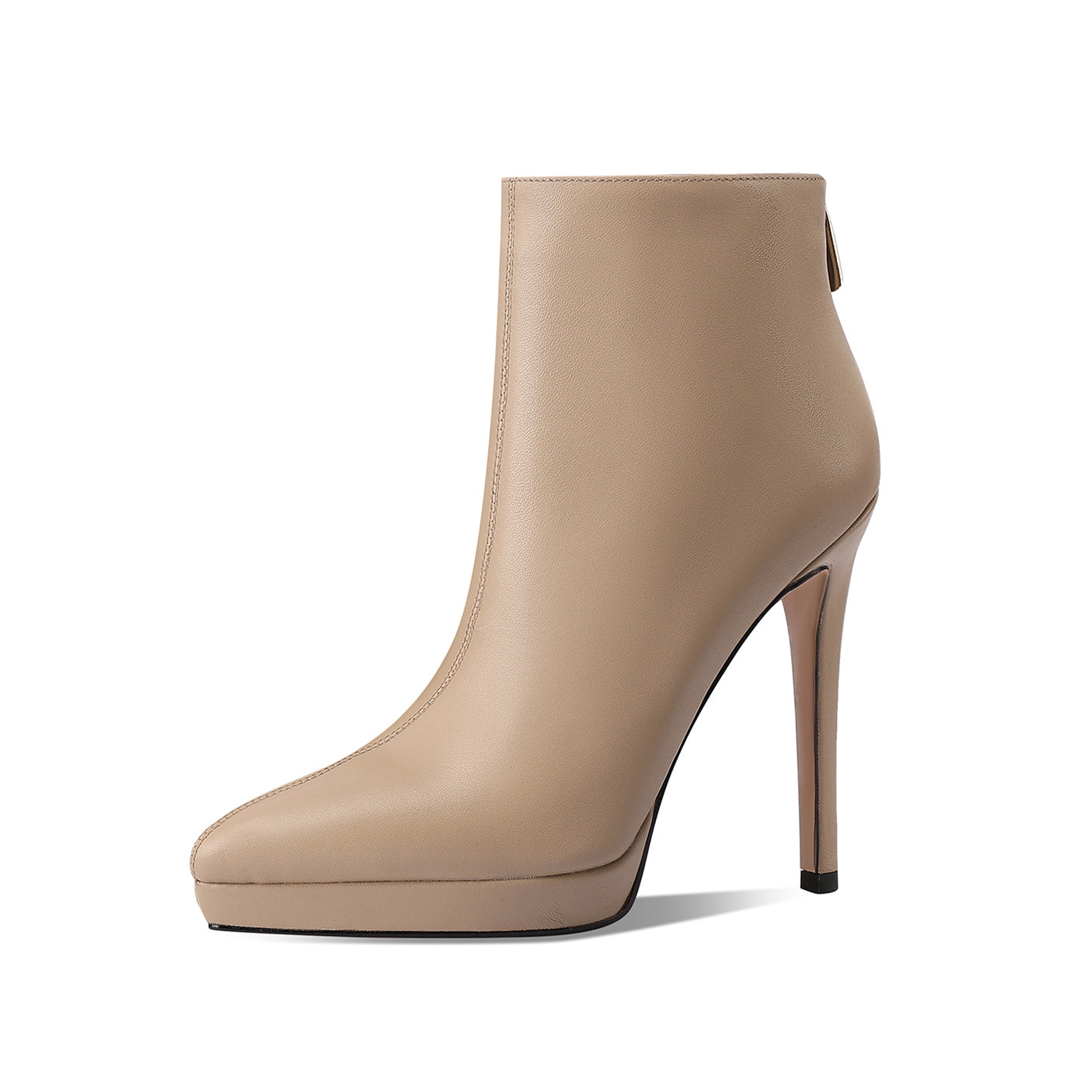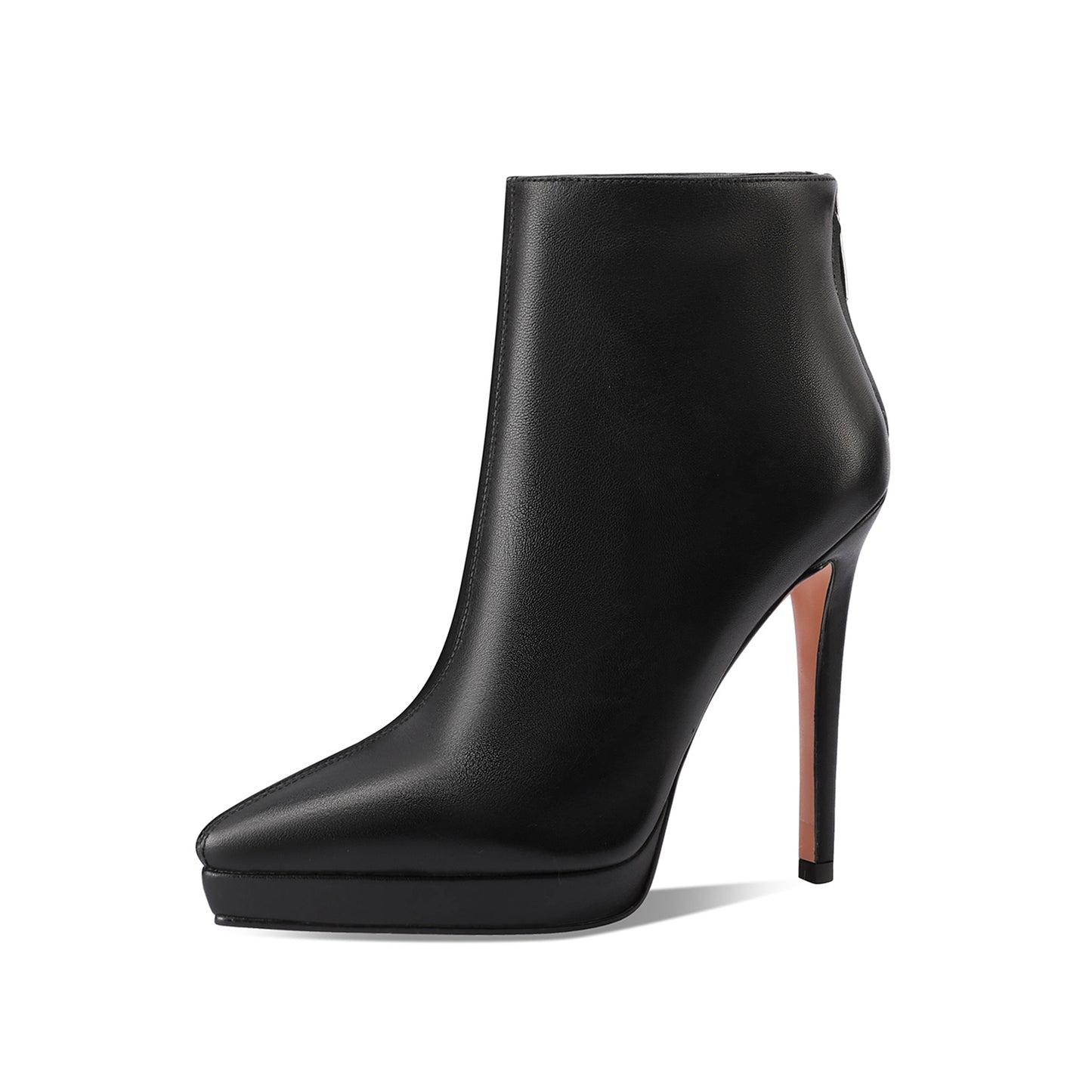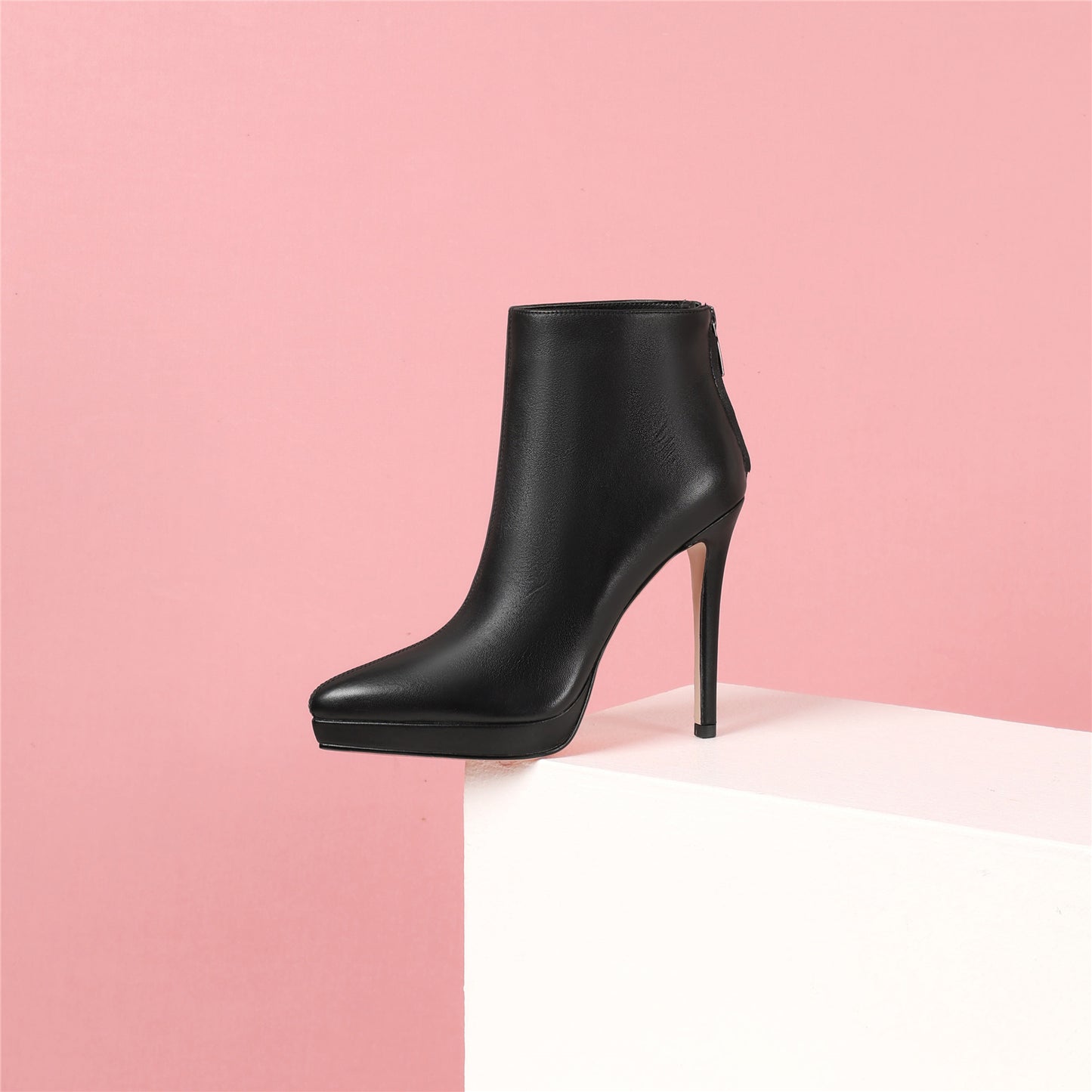 Ankle boots are designed with pointed toe, genuine leather, zip and stiletto heel.