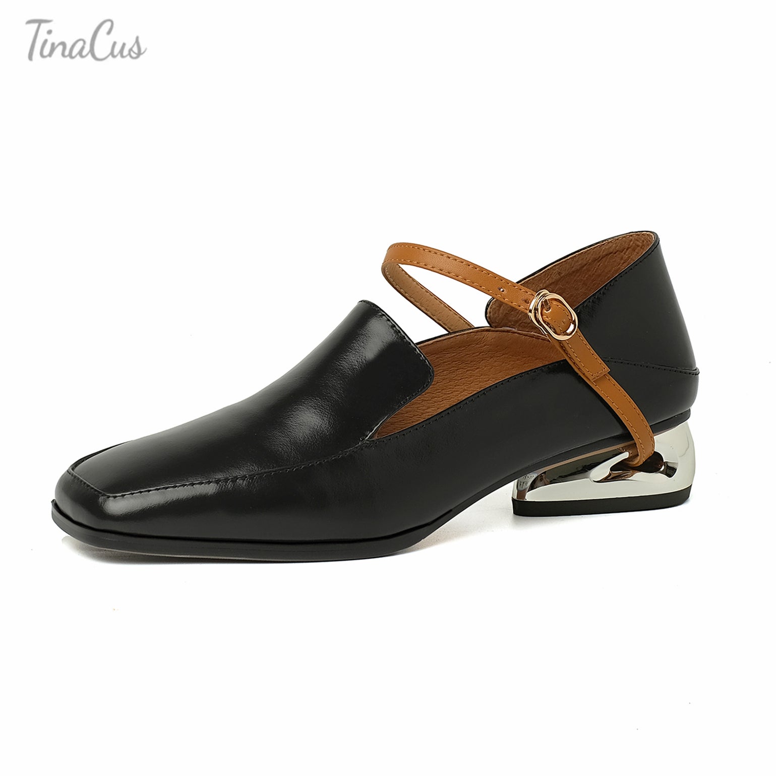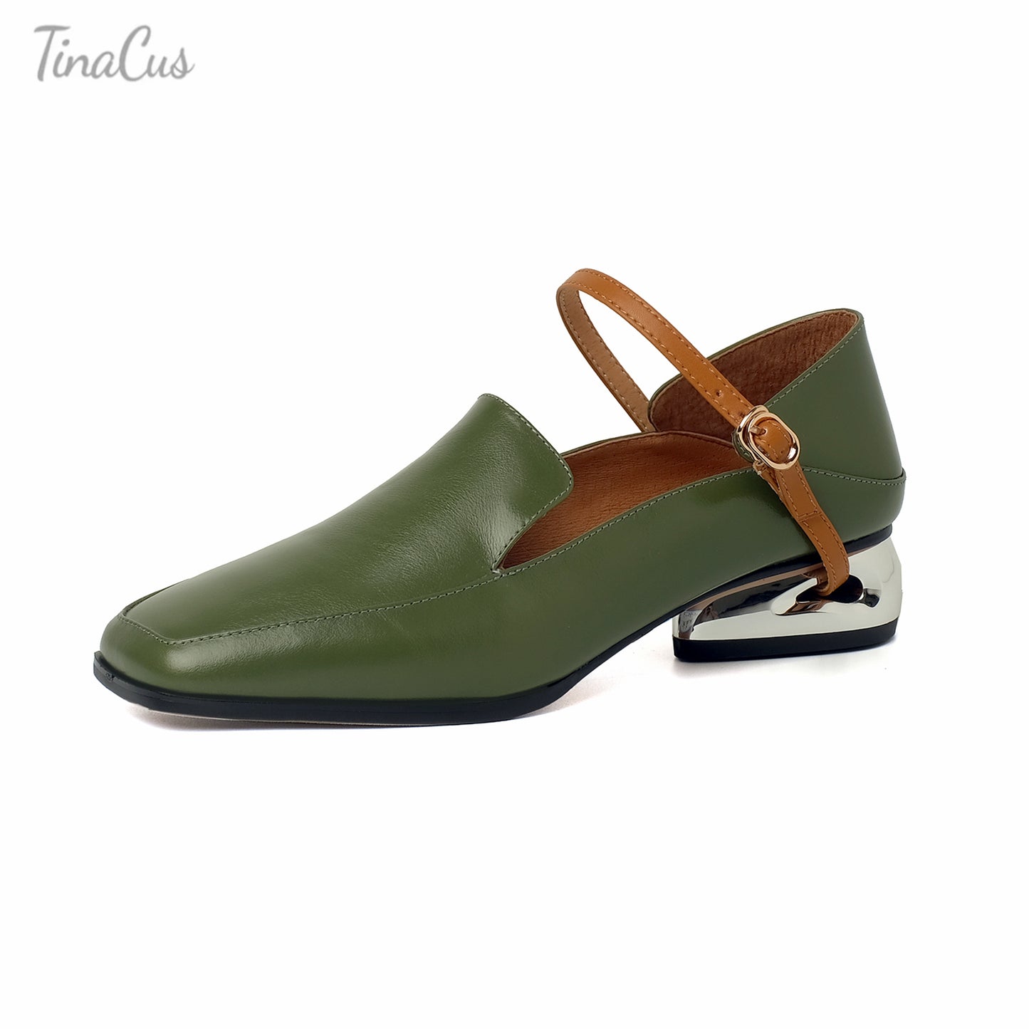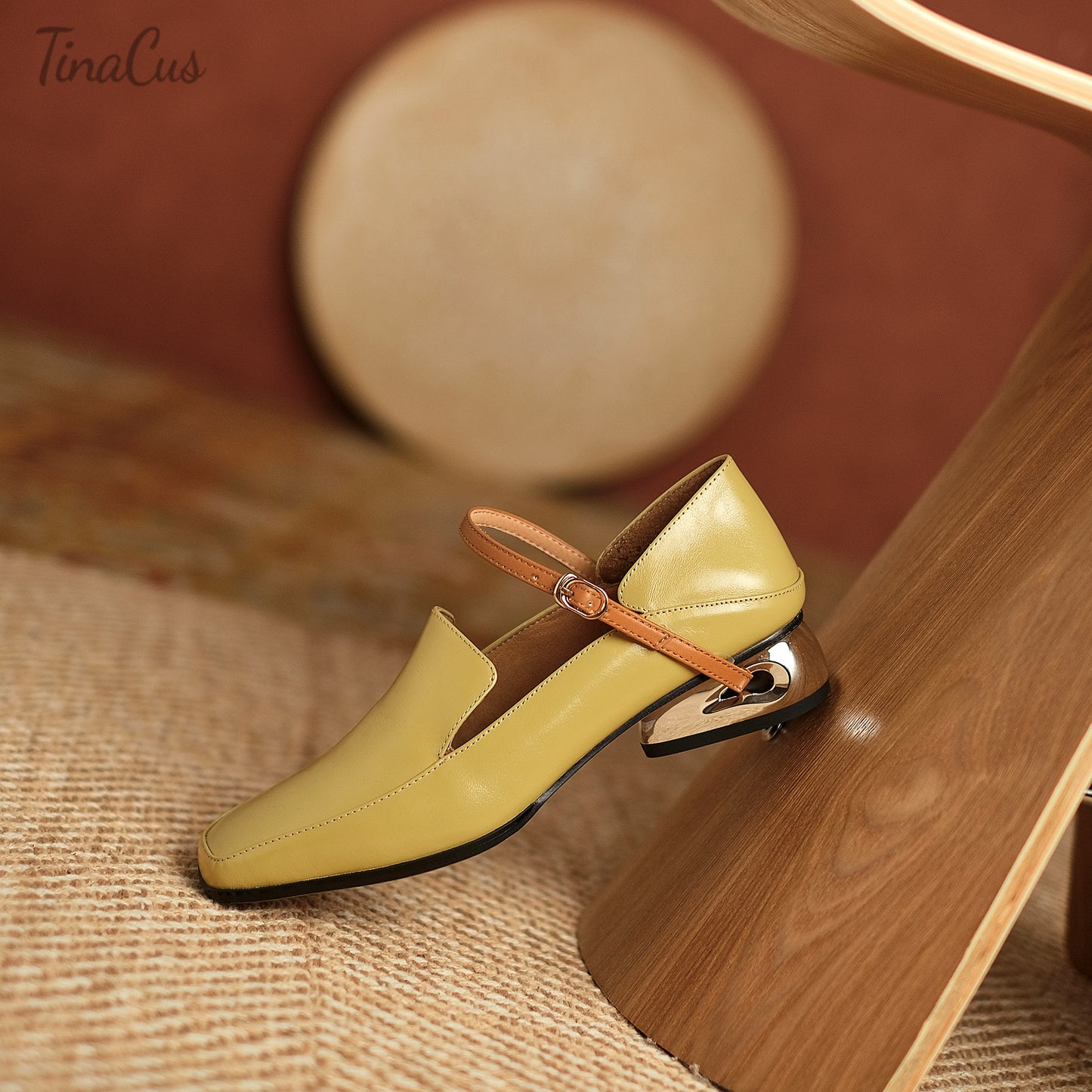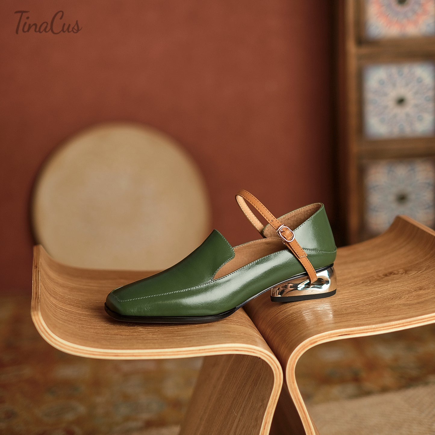 TinaCus Women's Handmade Genuine Leather Square Toe Chunky Heel Classic Mary Jane Pumps