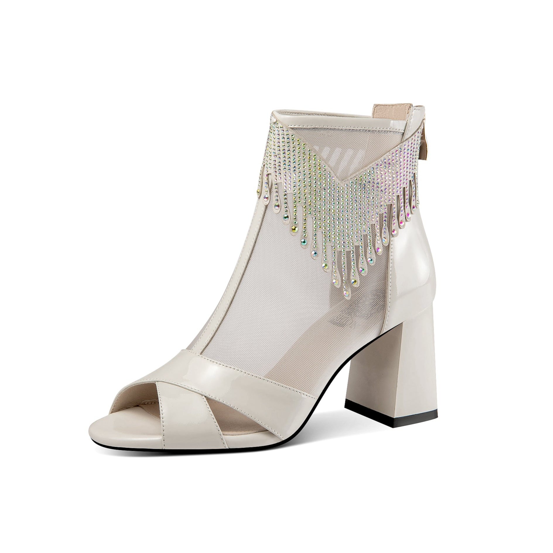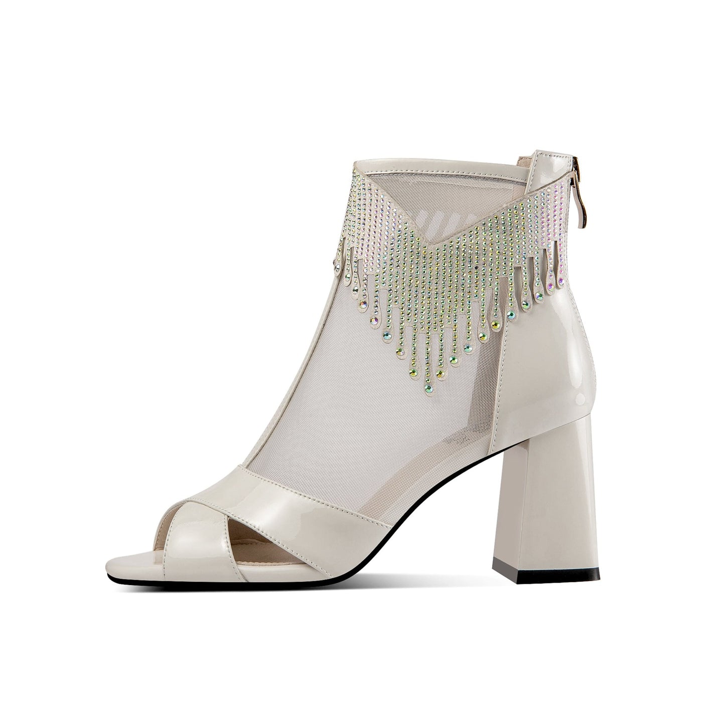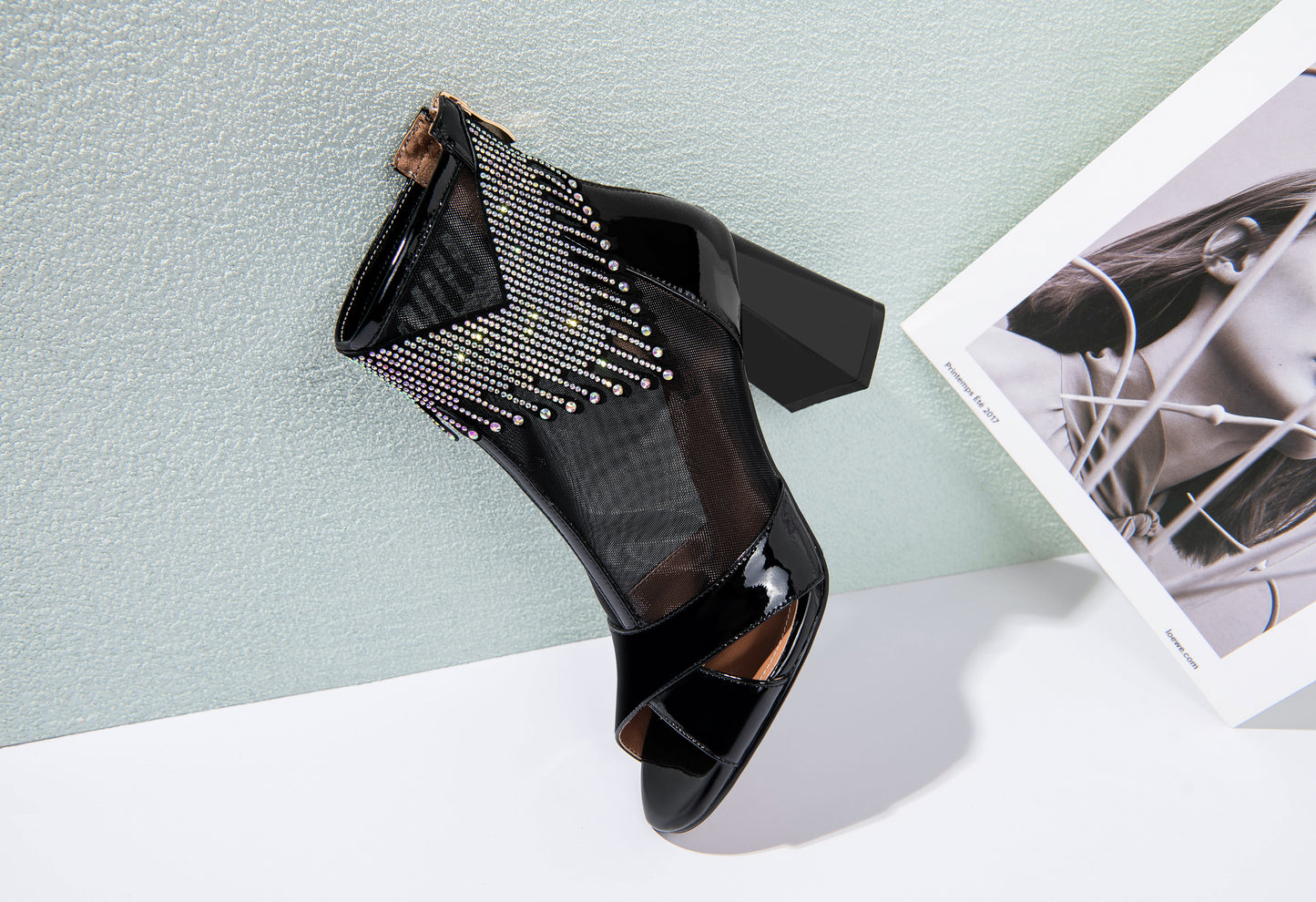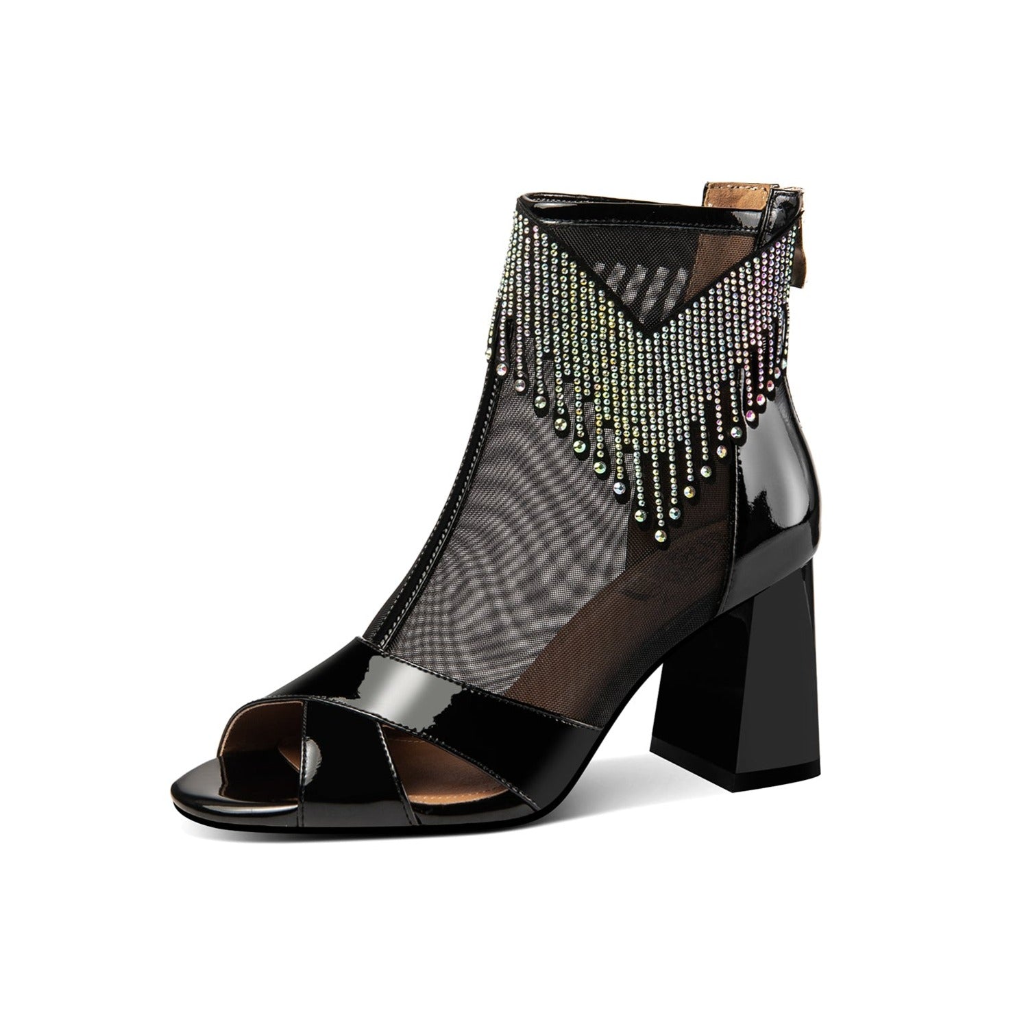 TinaCus Women's Handmade Patent Leather Mesh Glitter Rhinestone Chunky Heel Back Zip Up Sandals Summer Ankle Boots