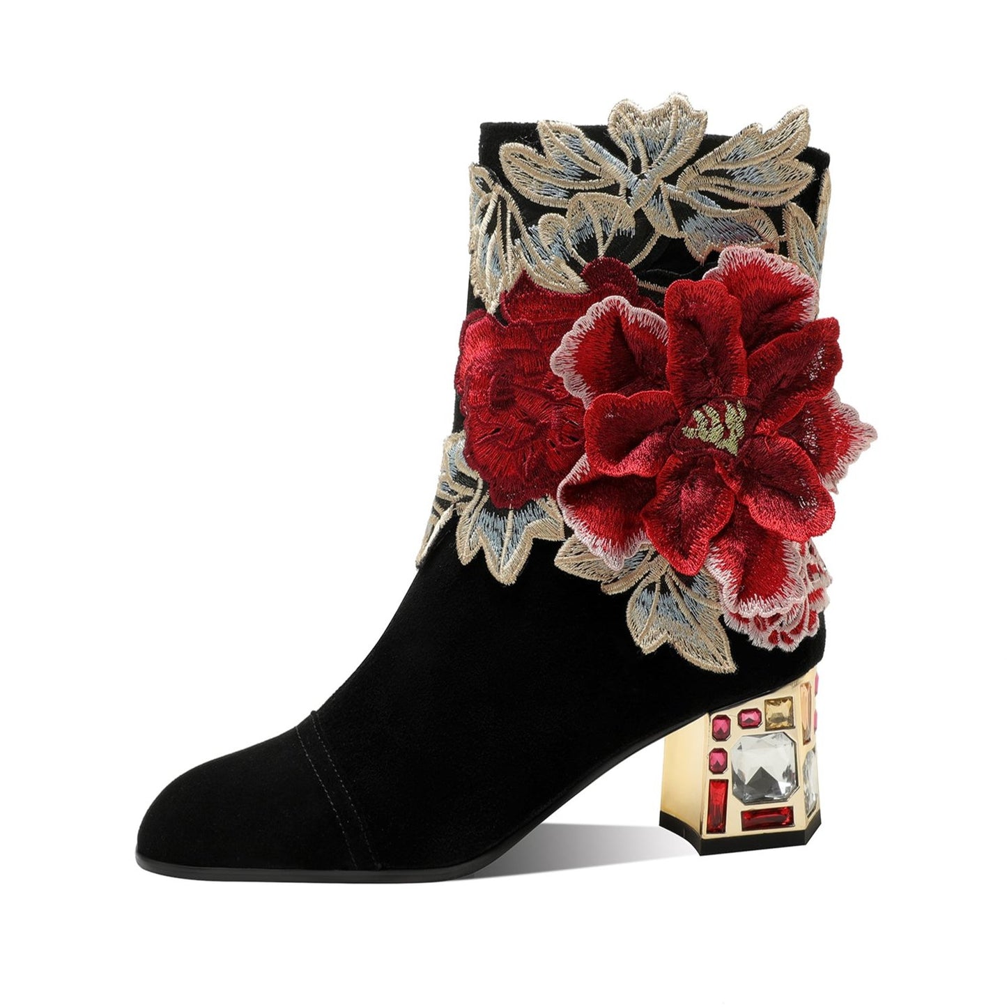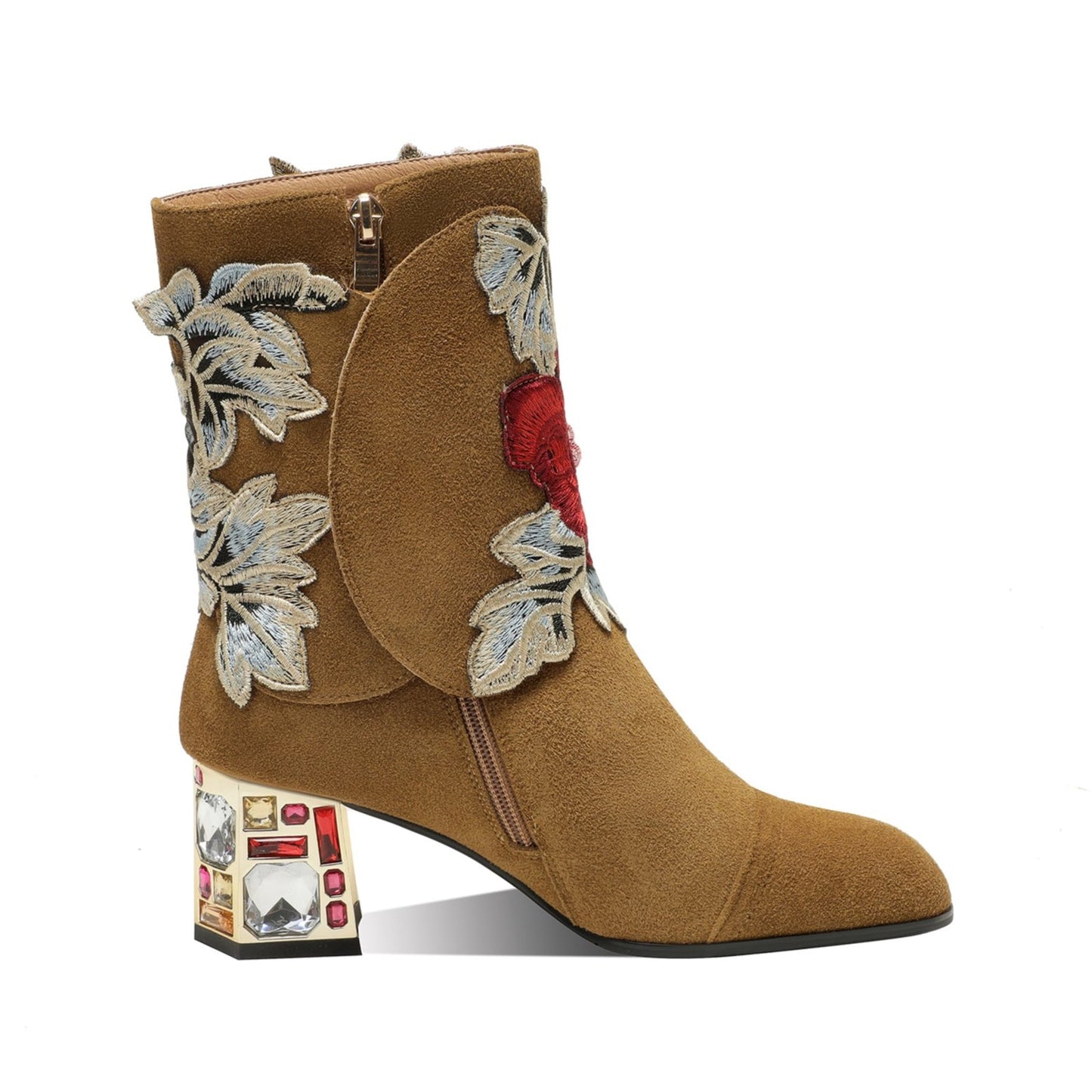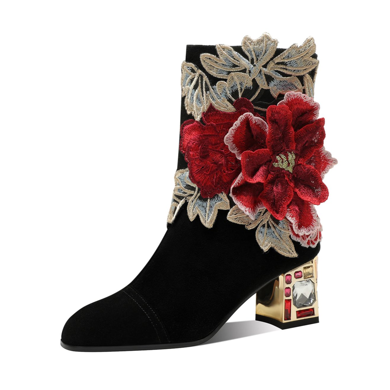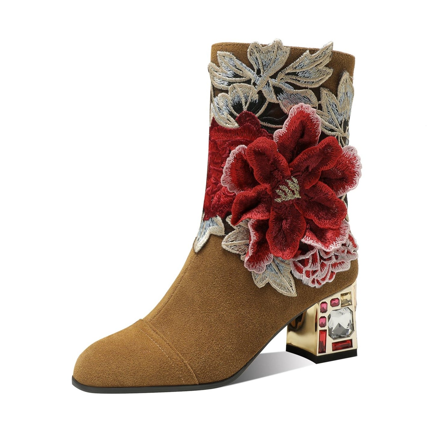 TinaCus Women's Suede Leather Detachable Flower Handmade Crystal Chunky Heel Zip Up Boots