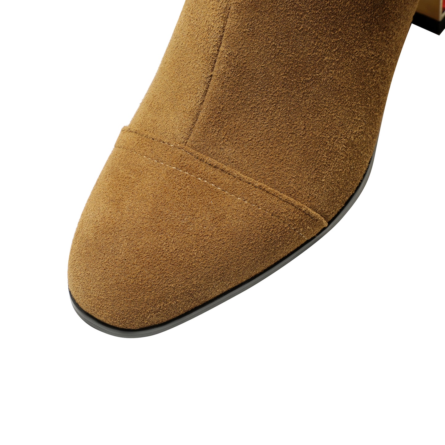 Calf boots are designed with round toe, suede leather, zip and chunky heel.