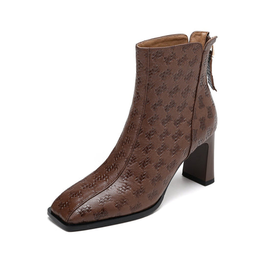 TinaCus Women Square Toe Genuine Leather Chunky Heel Handmade Back Zip Ankle Boots