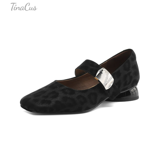 TinaCus Leopard Print Genuine Leather Women's Square Toe Handmade Low Heels Mary Jane Shoes