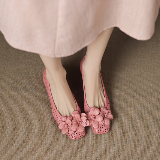 TinaCus Women's Square Toe Genuine Leather with Holes Handmade Flowers Low Chunky Heels Casual Loafers Shoes