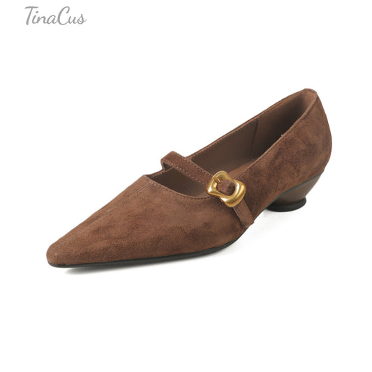 TinaCus Women's Pointed Toe Suede Leather Handmade Buckle Low Heels Mary Jane Shoes